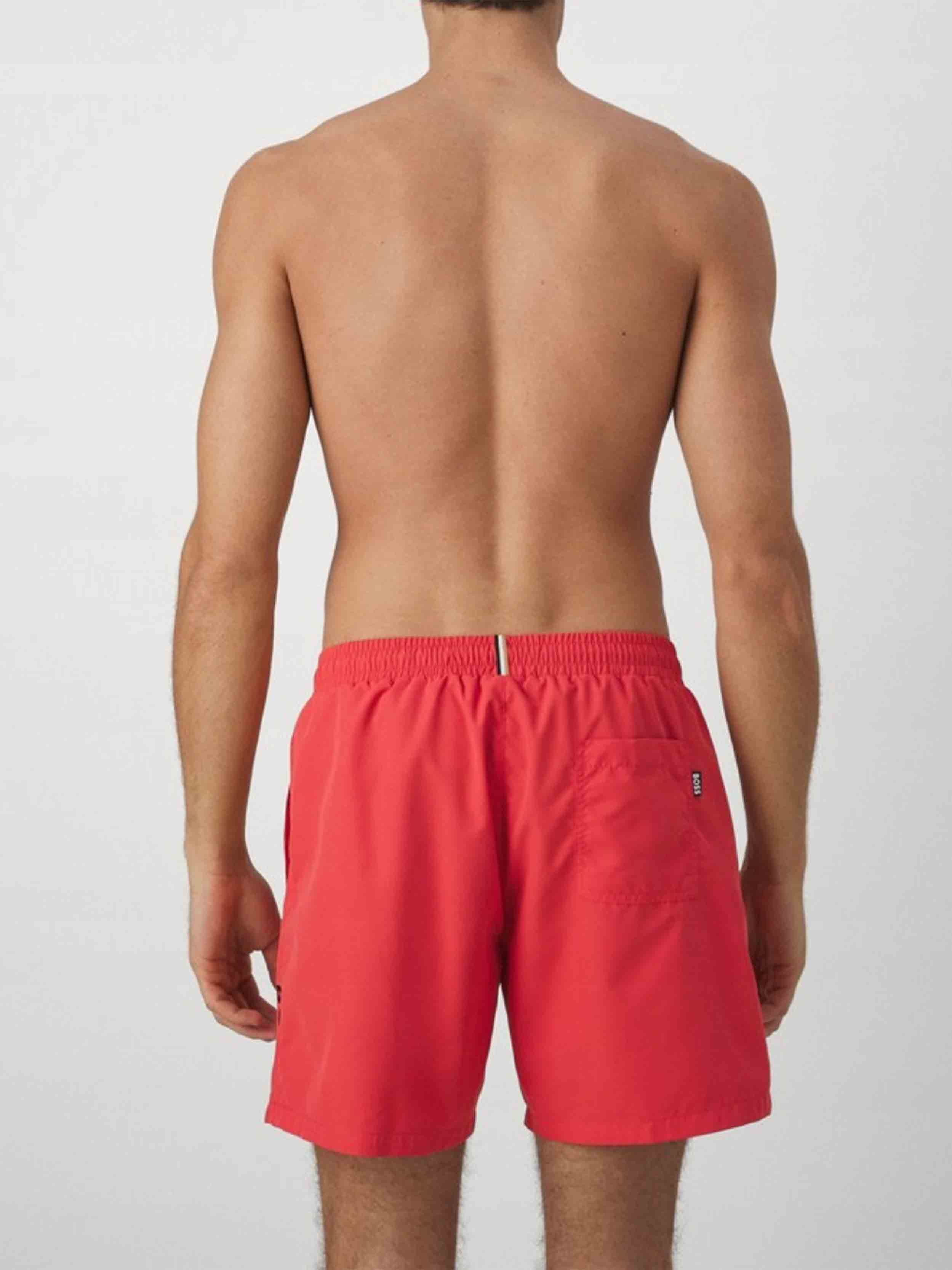 • Hidden-drawcord swim shorts with full lining by BOSS. This straight-leg pair is printed with a logo on the left leg for signature appeal. This product is partly created with polyester.