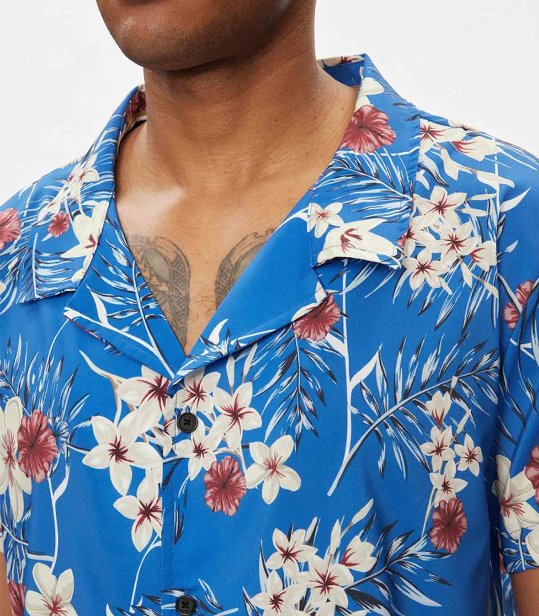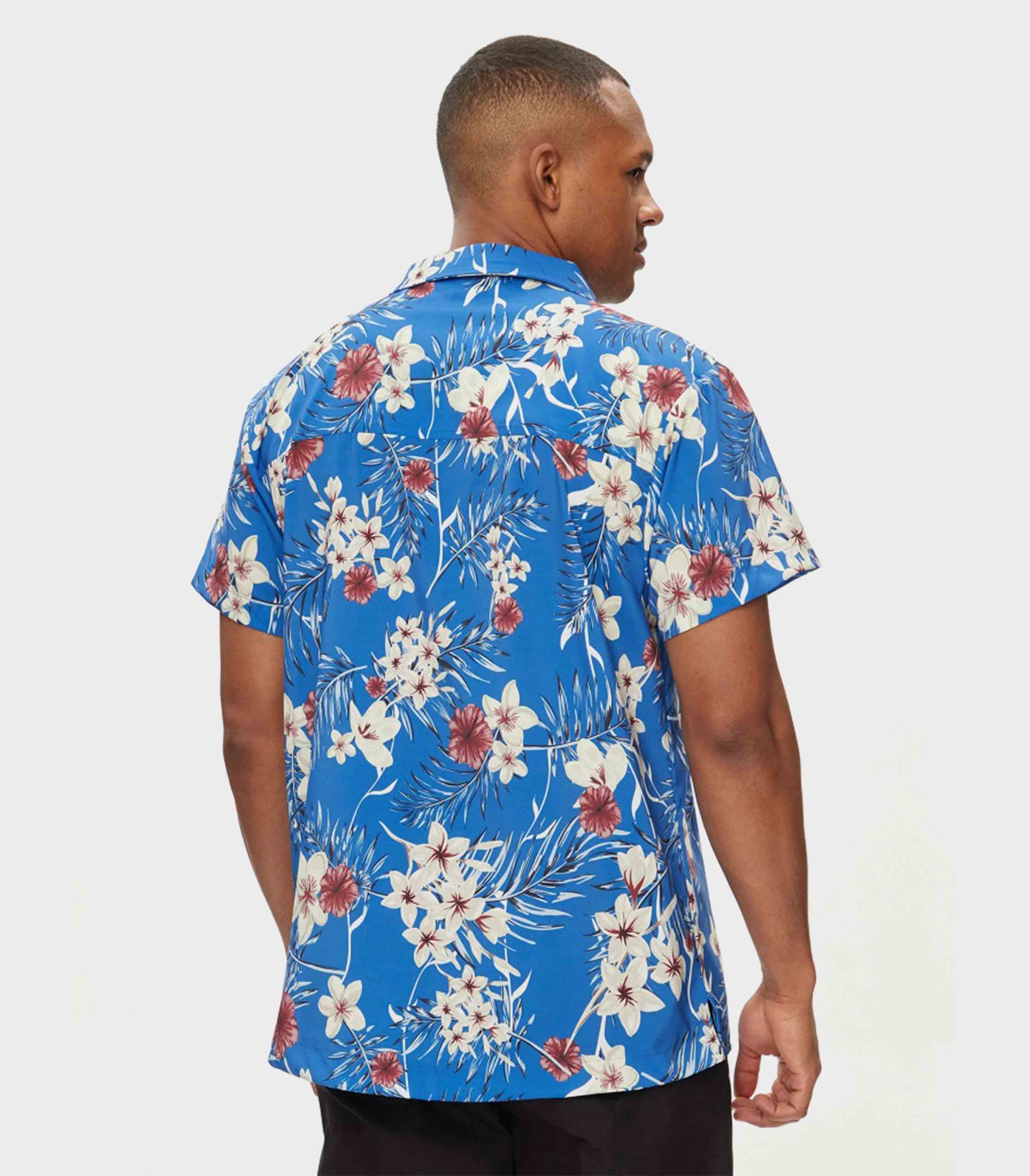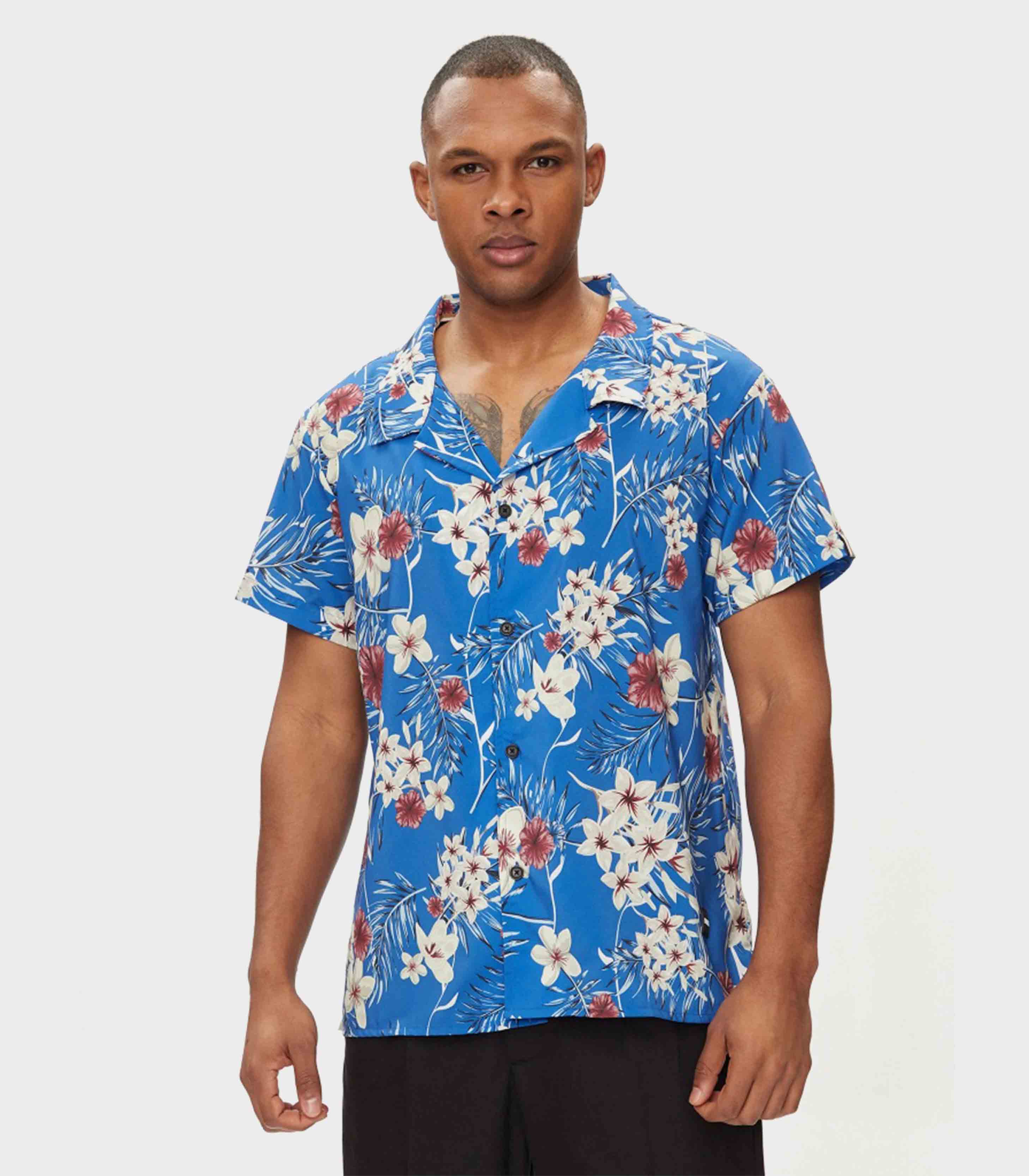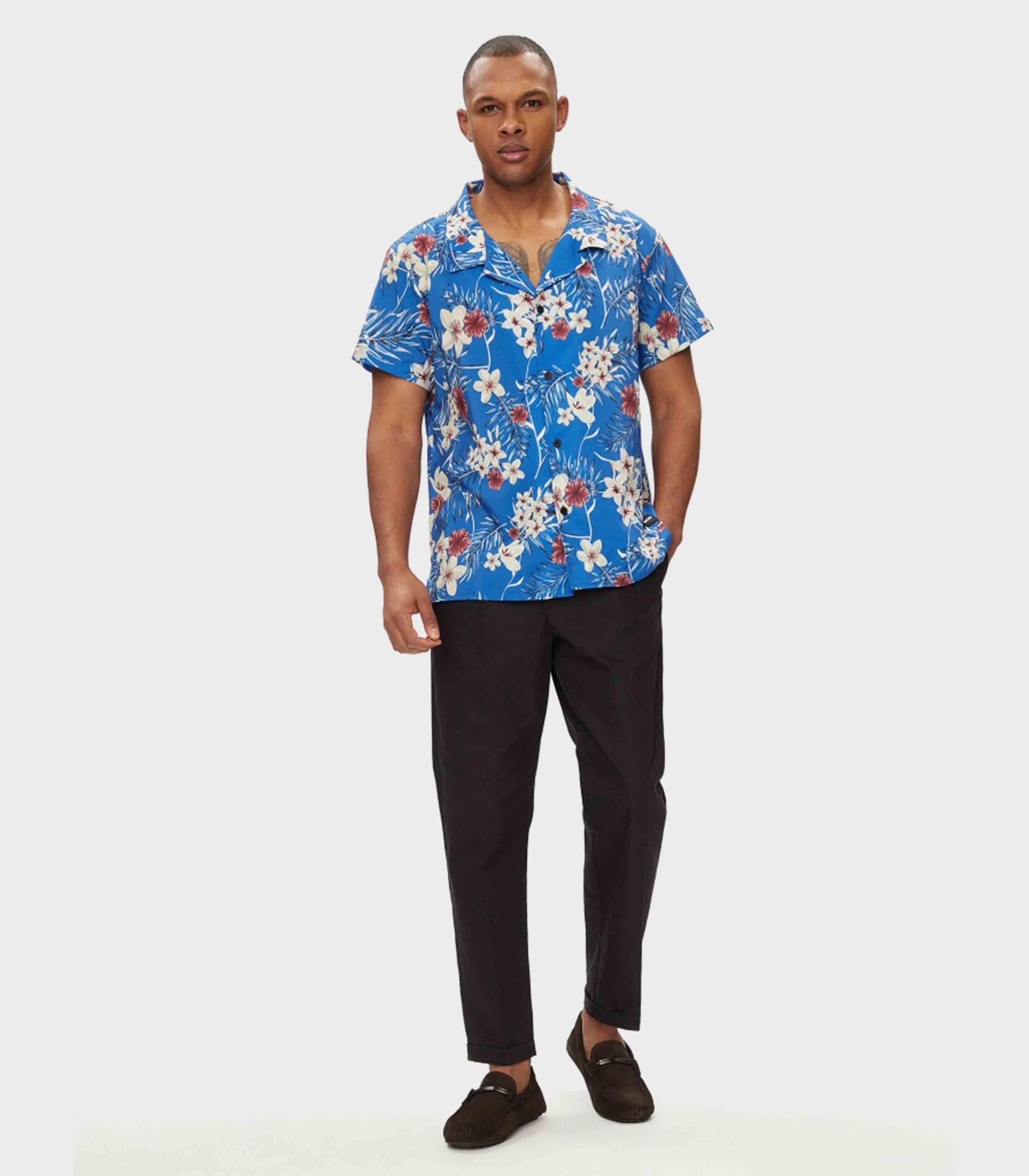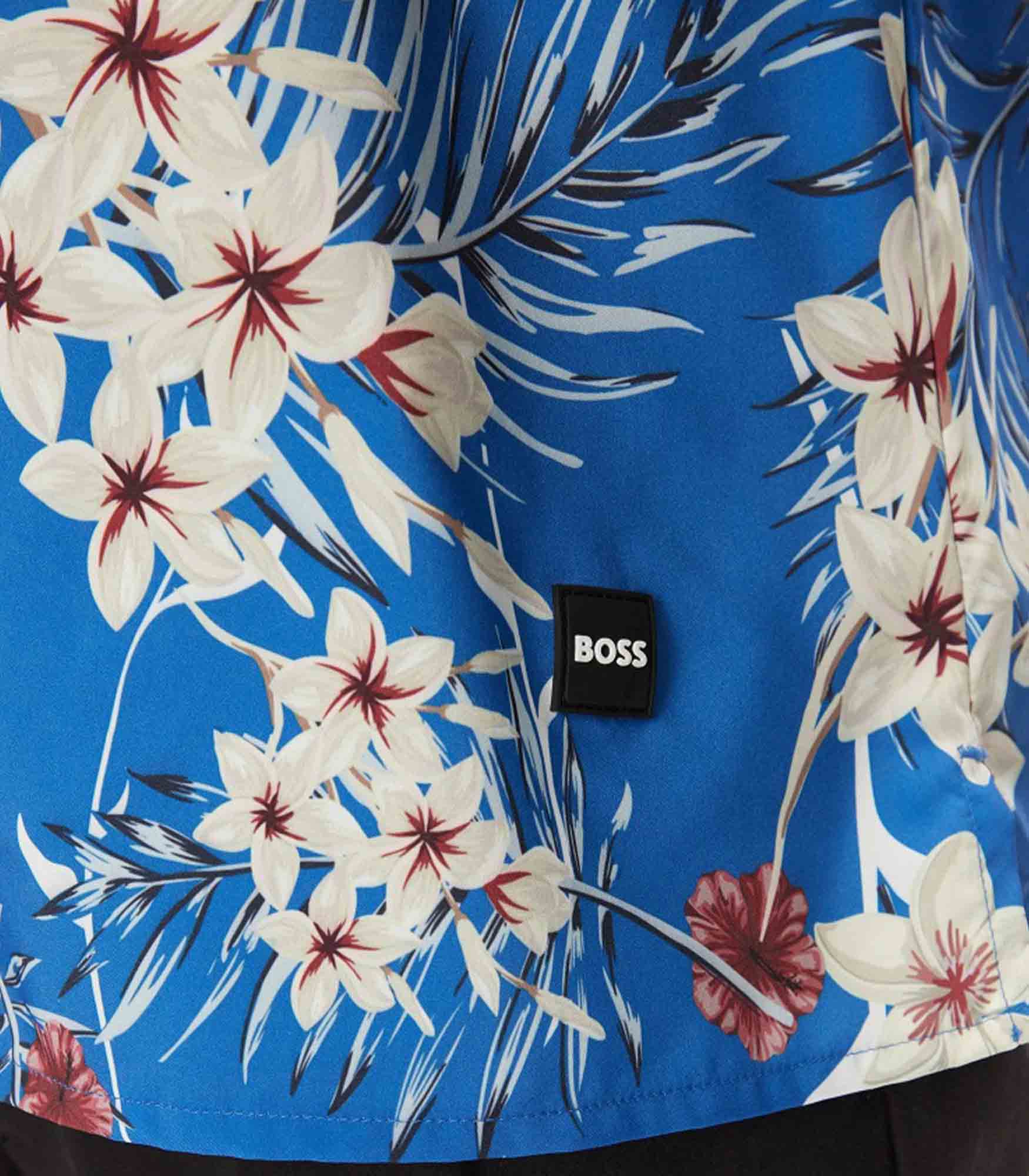 • A beach-ready shirt with a logo-patch trim by BOSS Menswear. This regular-fit piece is printed all over with a seasonal motif.