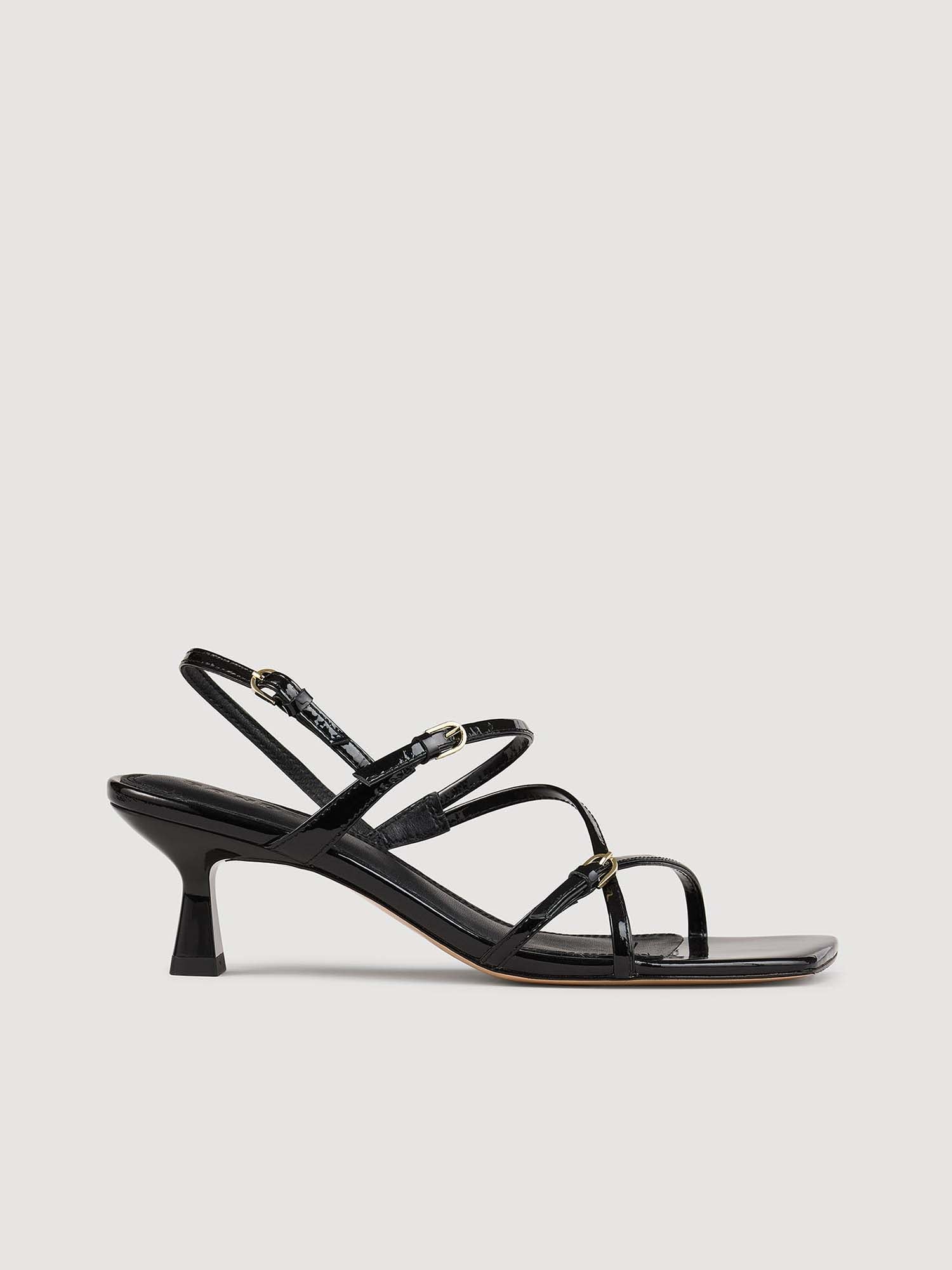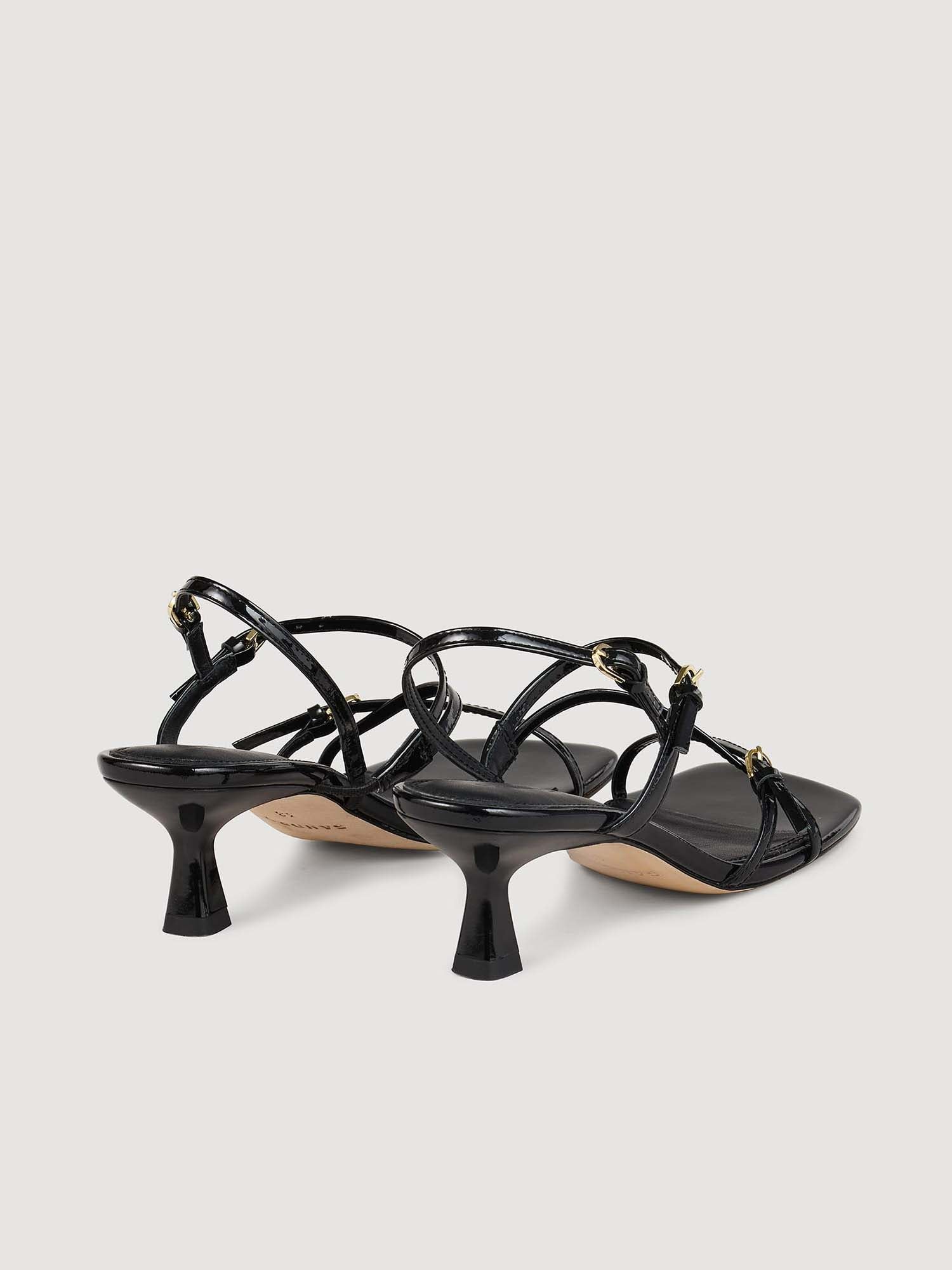 • Thin strappy patent leather sandals with adjustable straps and a small heel.