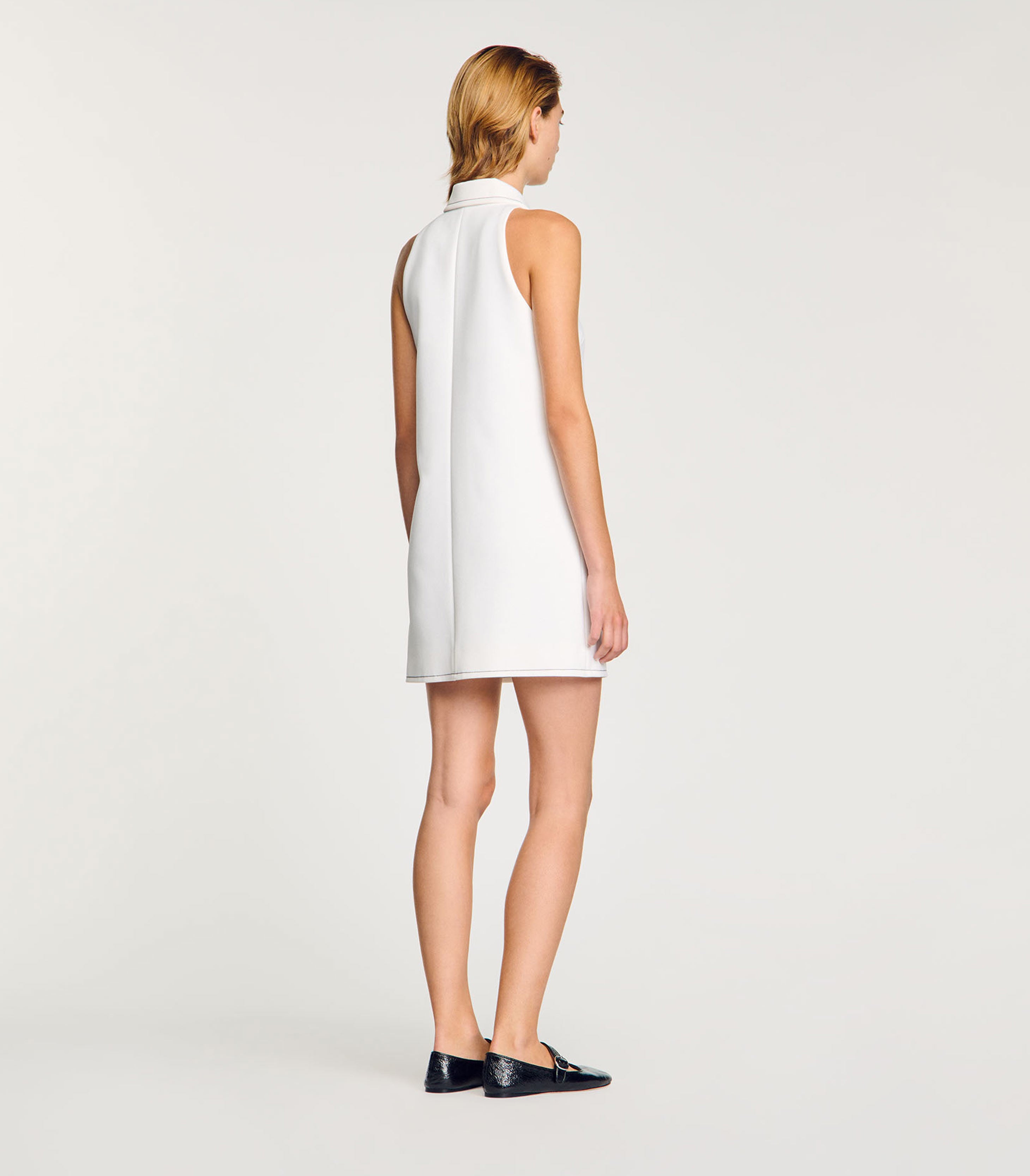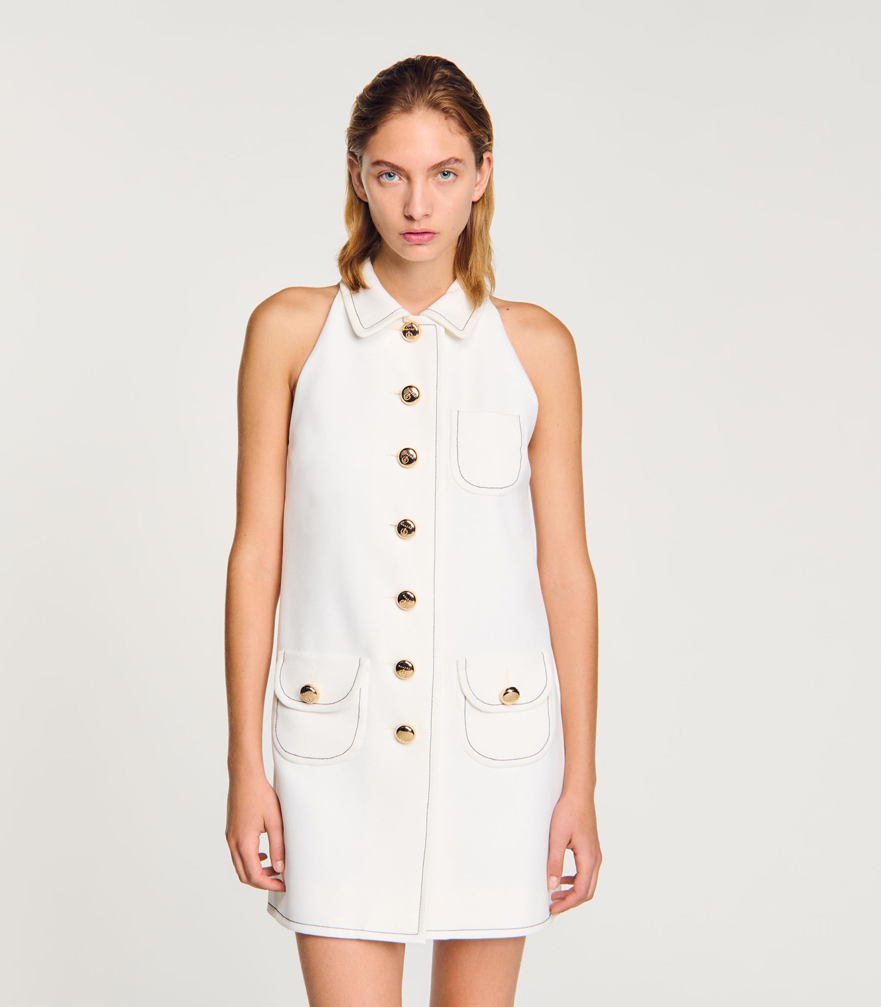 • Short dress with contrast stitching, American armholes, Peter Pan collar, button placket with decorative buttons and patch pockets.