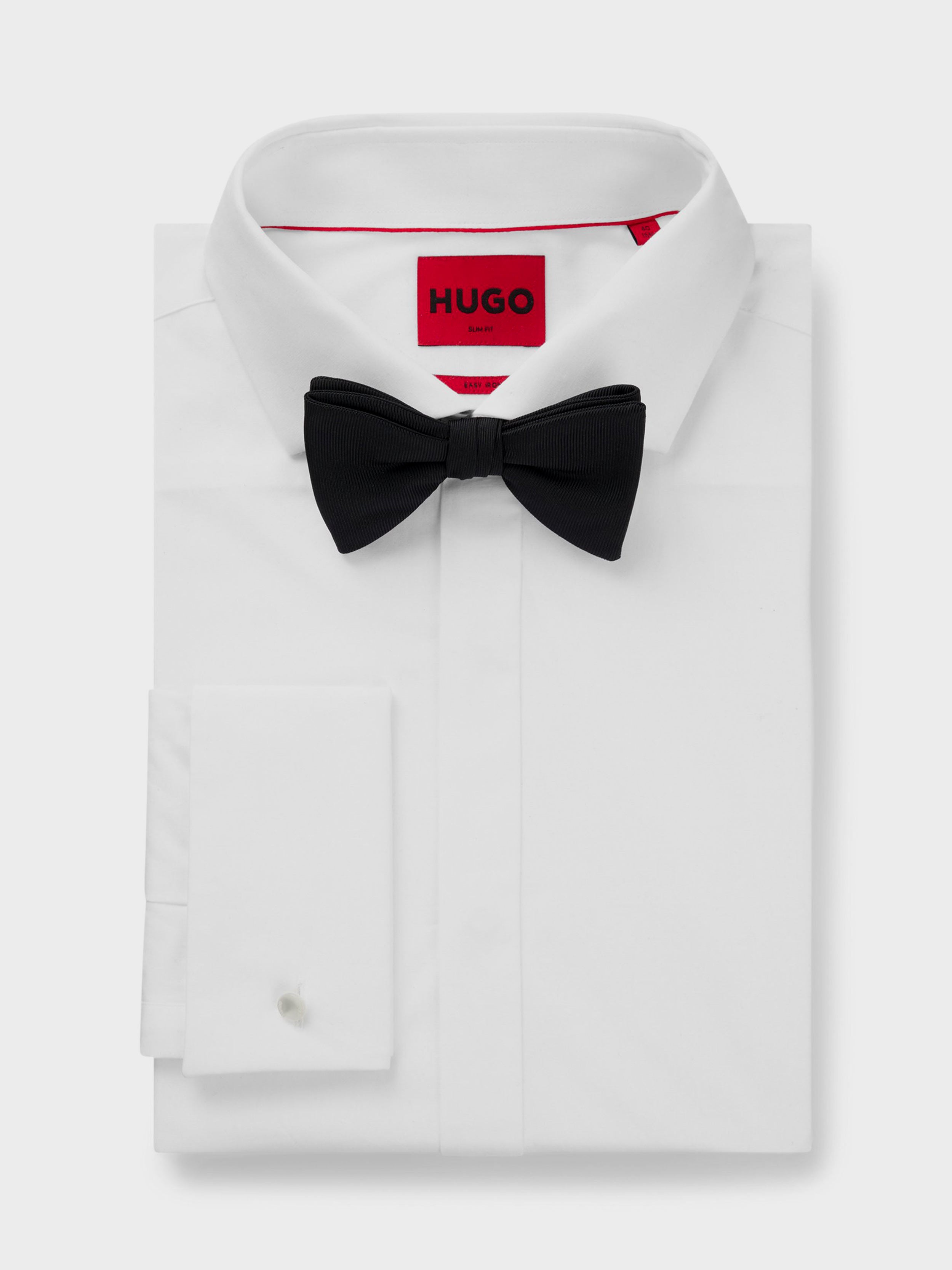 • A jacquard bow tie by HUGO. This pre-tied accessory is crafted in a rich silk blend for formal style.