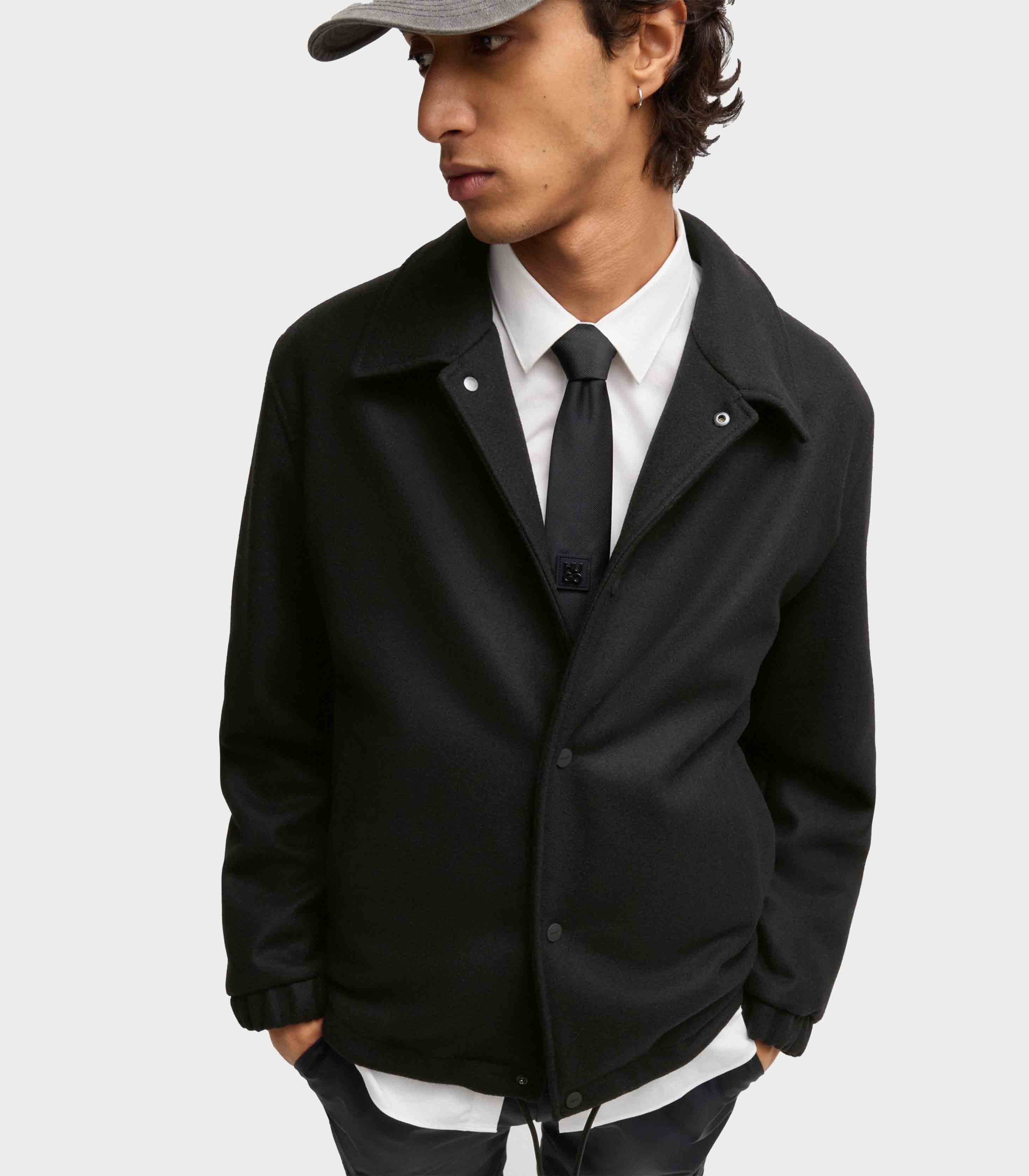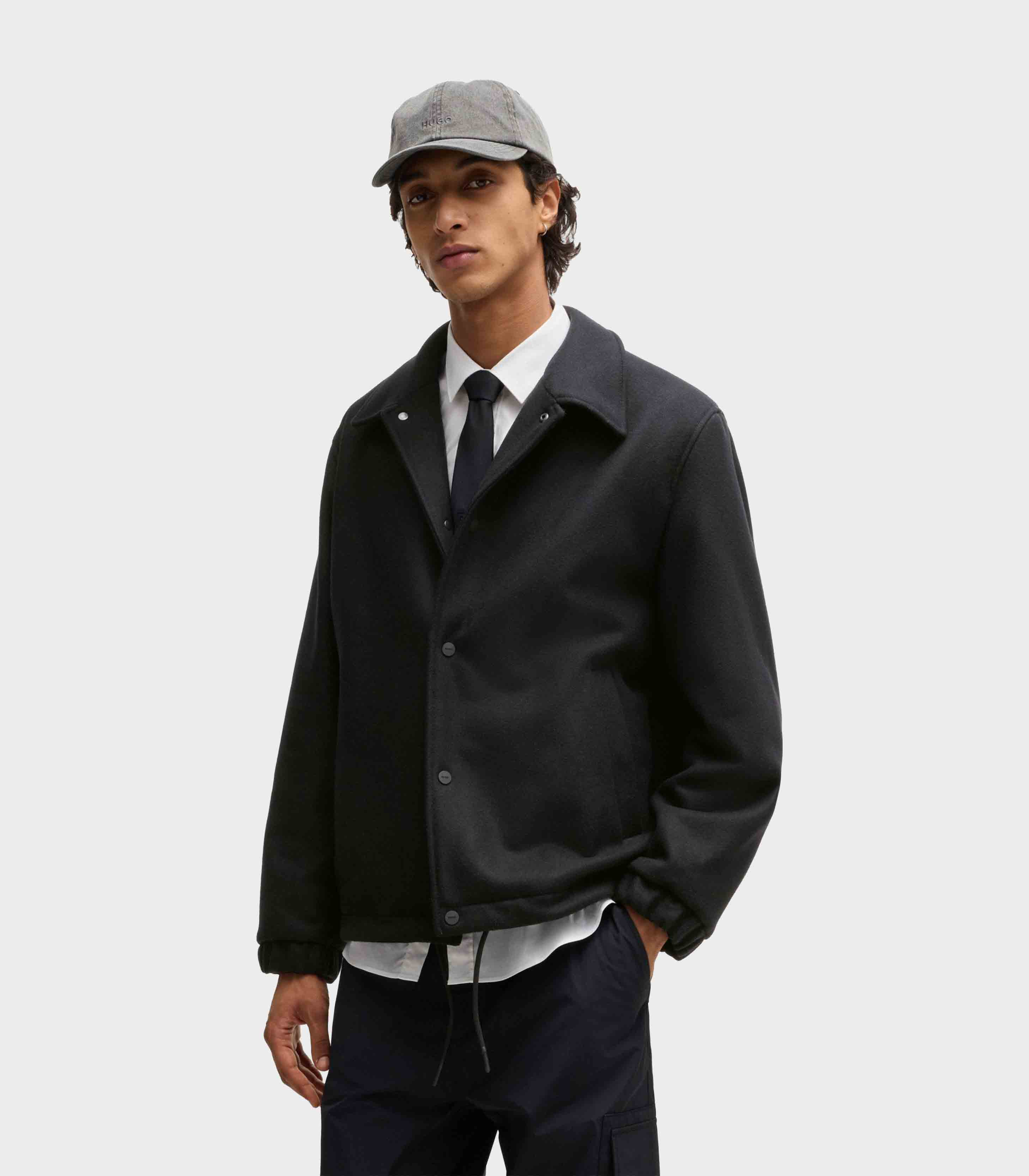 • wool coach jacket / regular fit / light padded / stand collar / elasticised cuffs / button closure / welt pockets / cord at hem / HUGO hanger on back / solid wool
