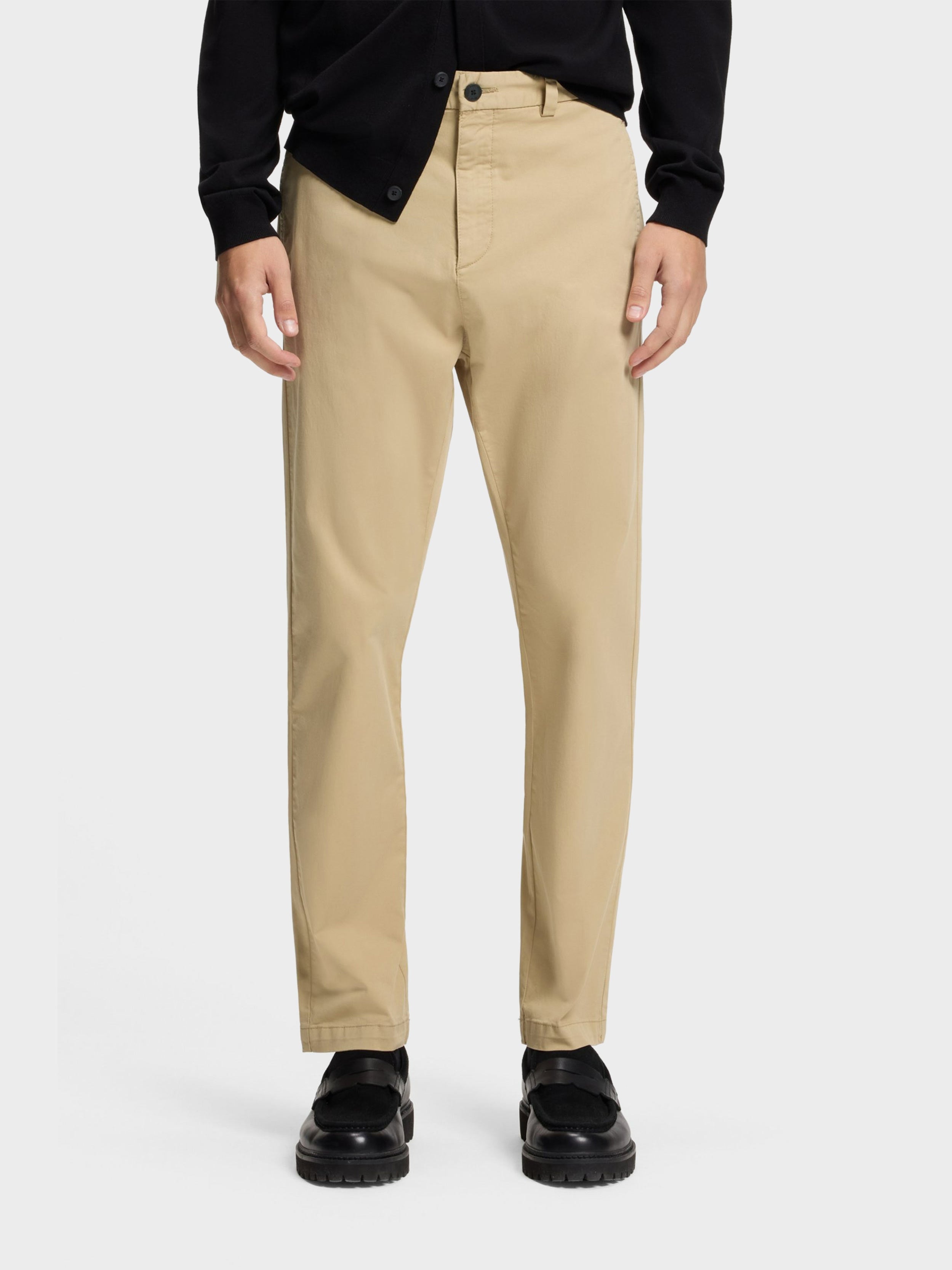 • long leisure trousers / slim fit / regular rise / button zip closure / welt pockets / side slash pockets / belt loops / red HUGO label above welt pocket