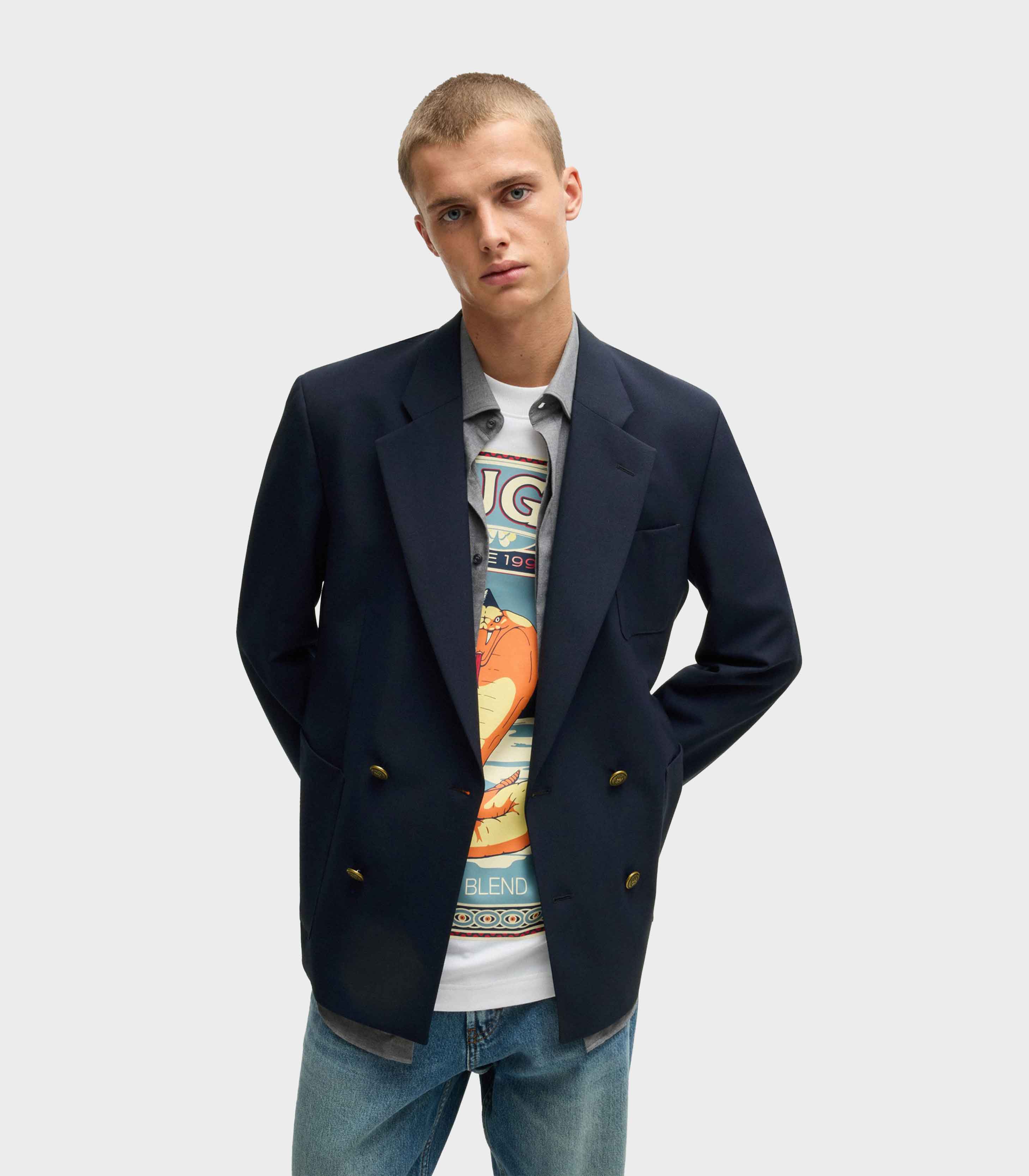 • modern fit jacket inspired by the sailor look / fully lined / perfect combined with a jeans / extensive reverse with uniform fabric / double breasted with rich golden buttons / three patch pockets / four kissing buttons / HUGO performance for best wearing comfort