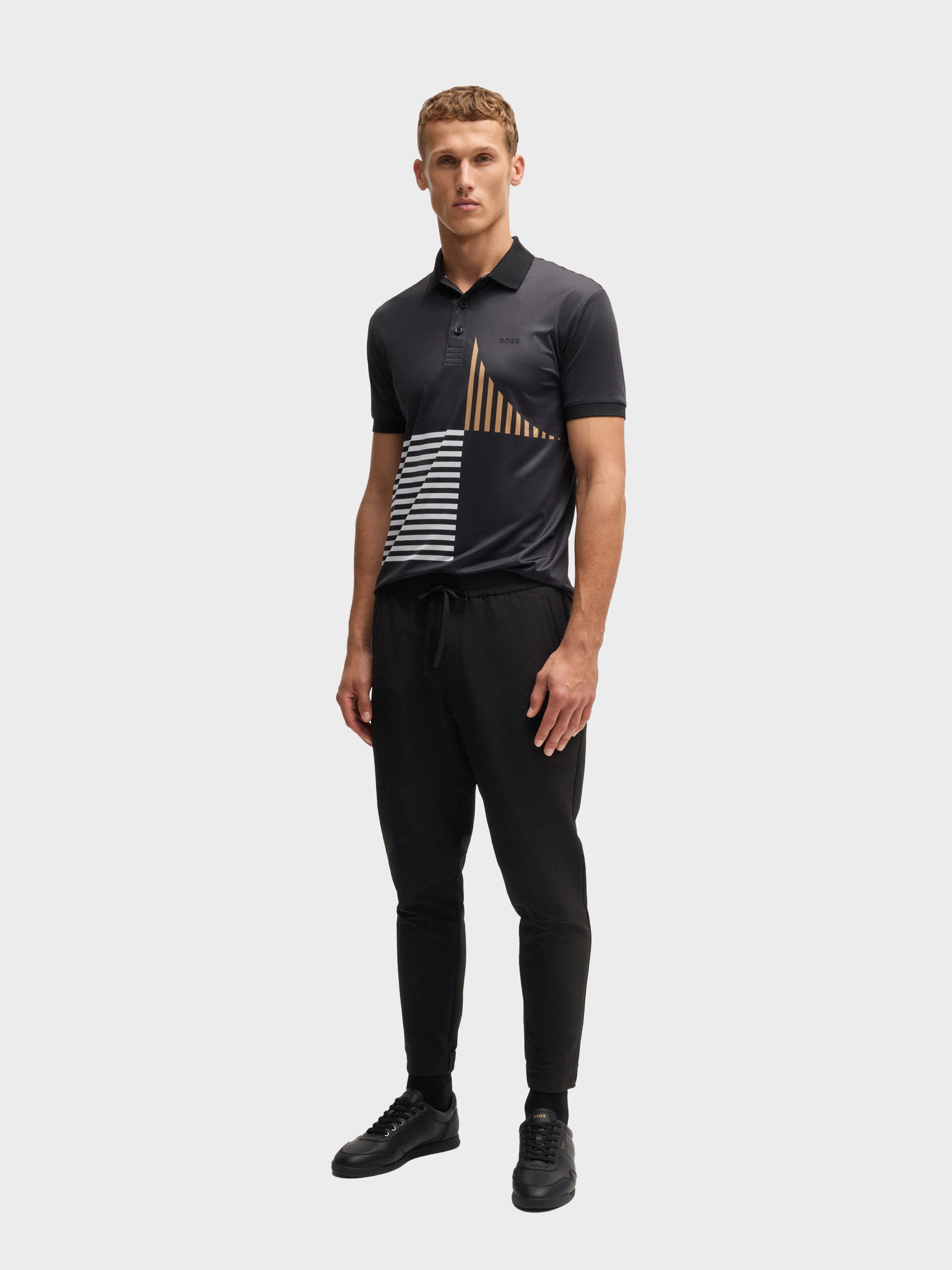 • With their ergonomic tapered fit, protective finish and four-way stretch, these BOSS Menswear trousers are essential for active days. Easy-iron finish. Logo print. This product contains at least 80% better raw materials. This product is partly created with recycled polyester. We as HUGO BOSS prefer recycled polyester from pre- and post-consumer textile waste and do our best to phase out polyester from PET bottles.