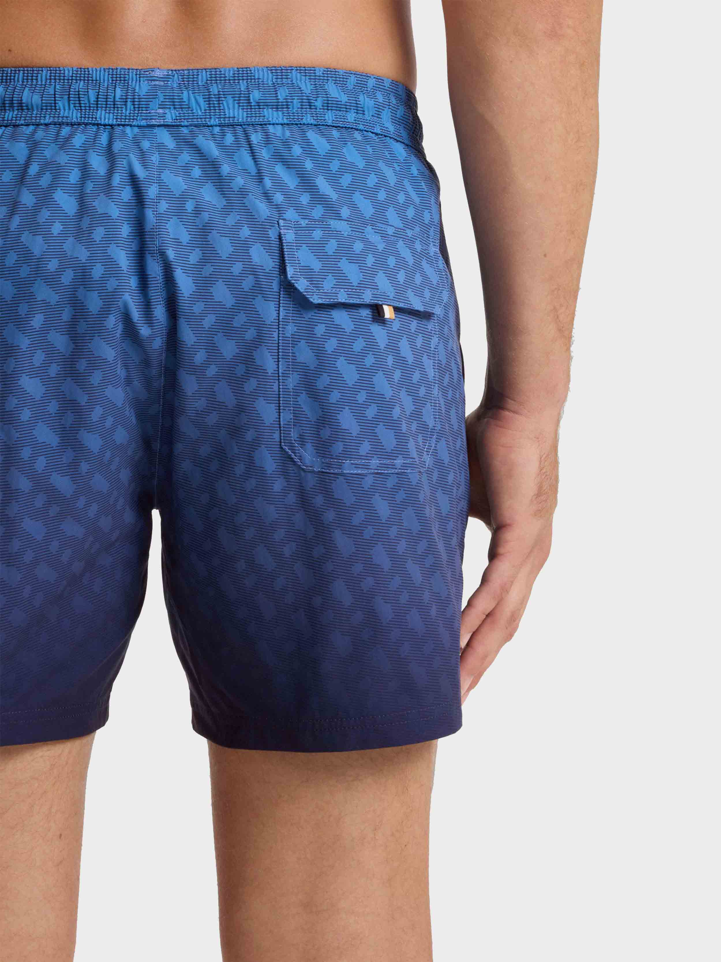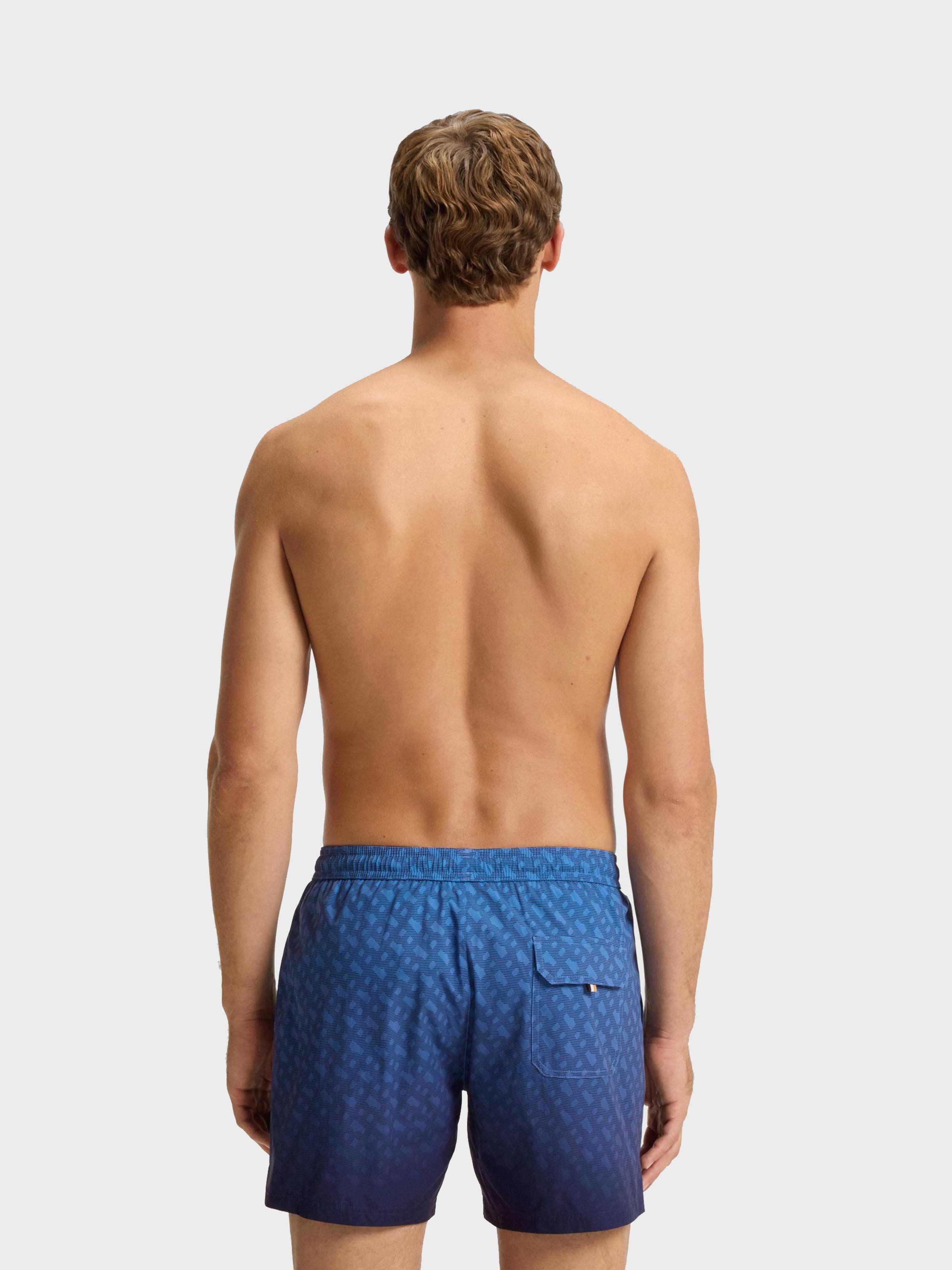 • All over print with monogram degrade effect / Tonal rubber badge //quick dry /back pocket/outside cords with branded ends / leg length: 41 cm side on size M
