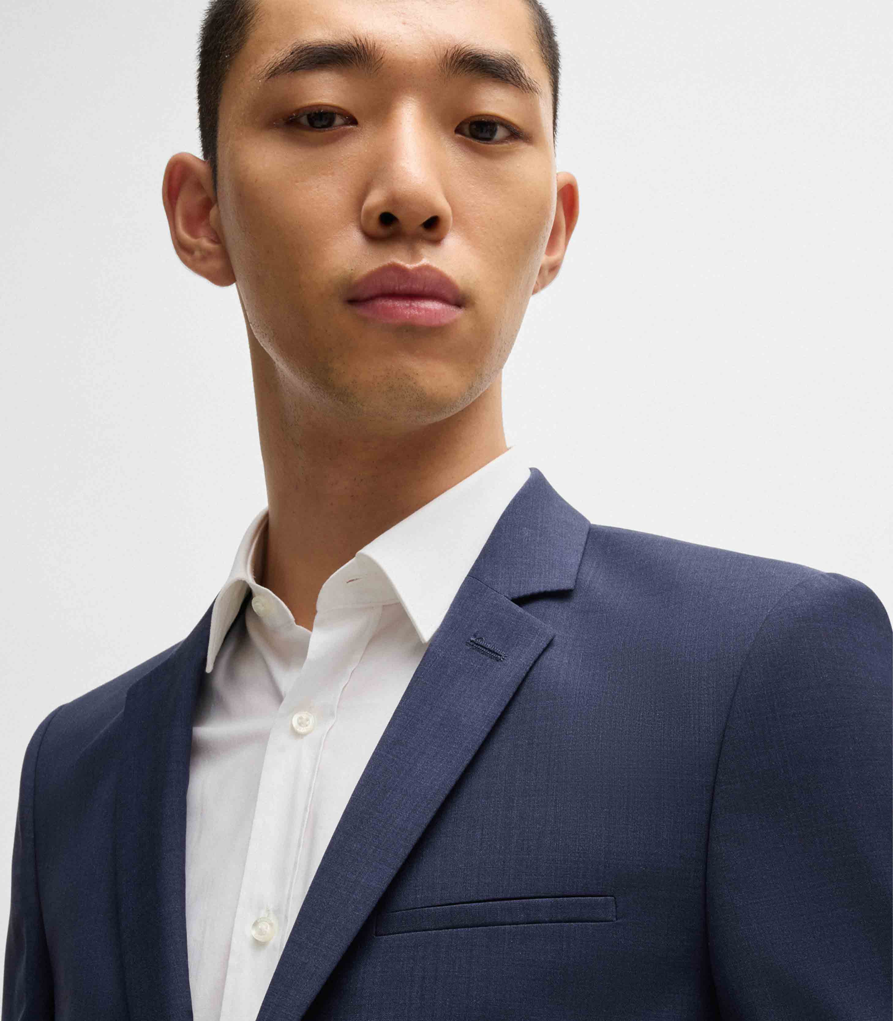 • M M jacket in extra-slim fit / melange fabric for a clean but interesting look / fully lined / notch lapels / flap pockets / welt chest pockets / three kissing buttons with a color detail / two button closure / side vent / super-flex quality which offers best wearing comfort / HUGO performance properties are shown on special sleeve label