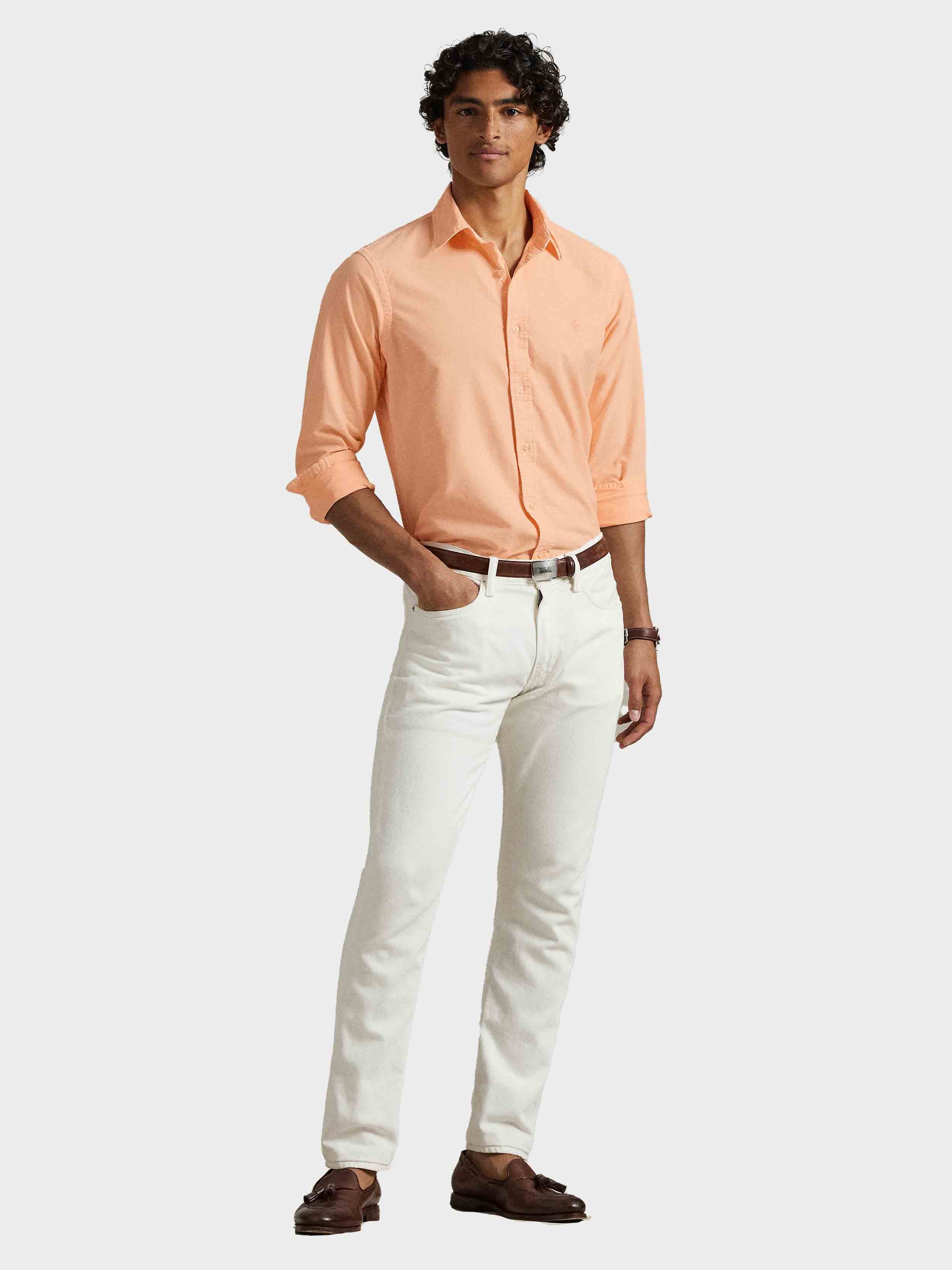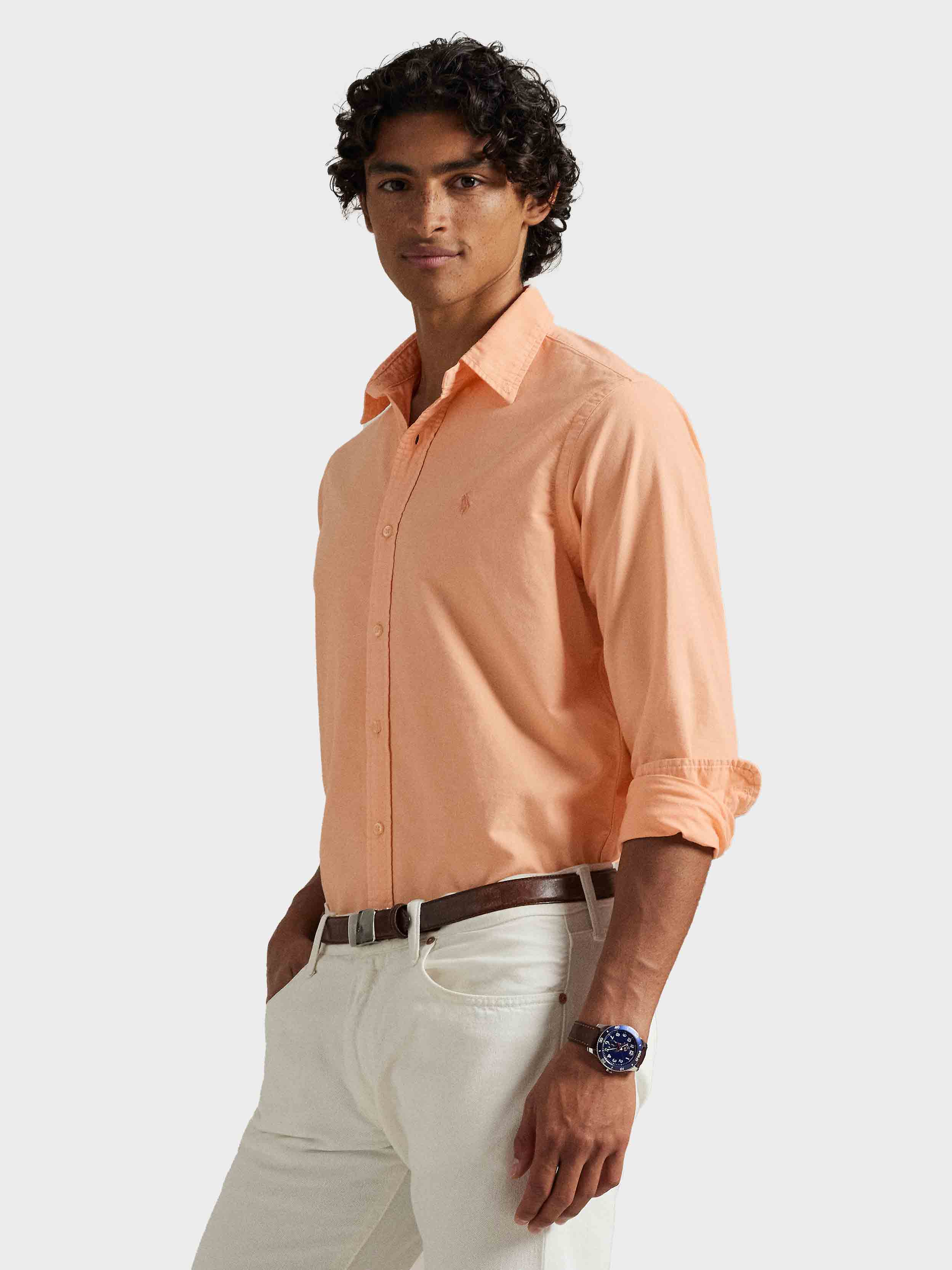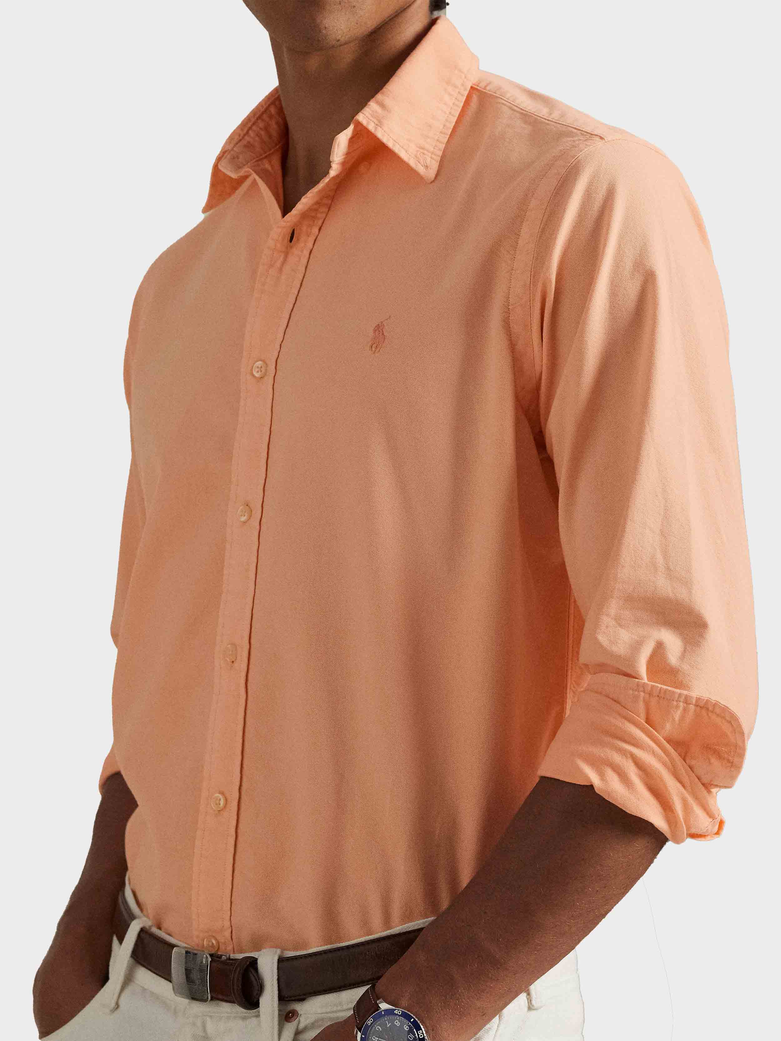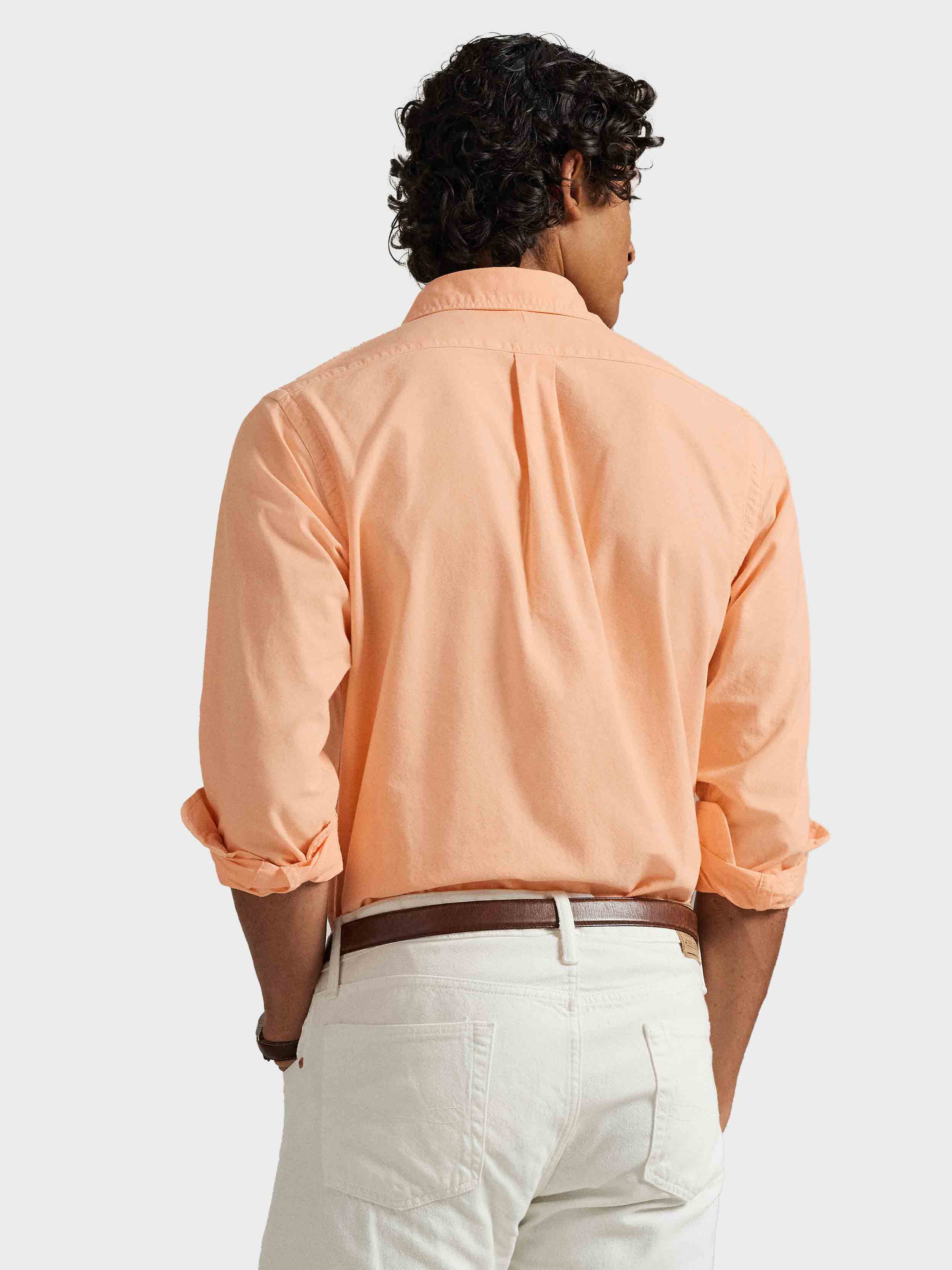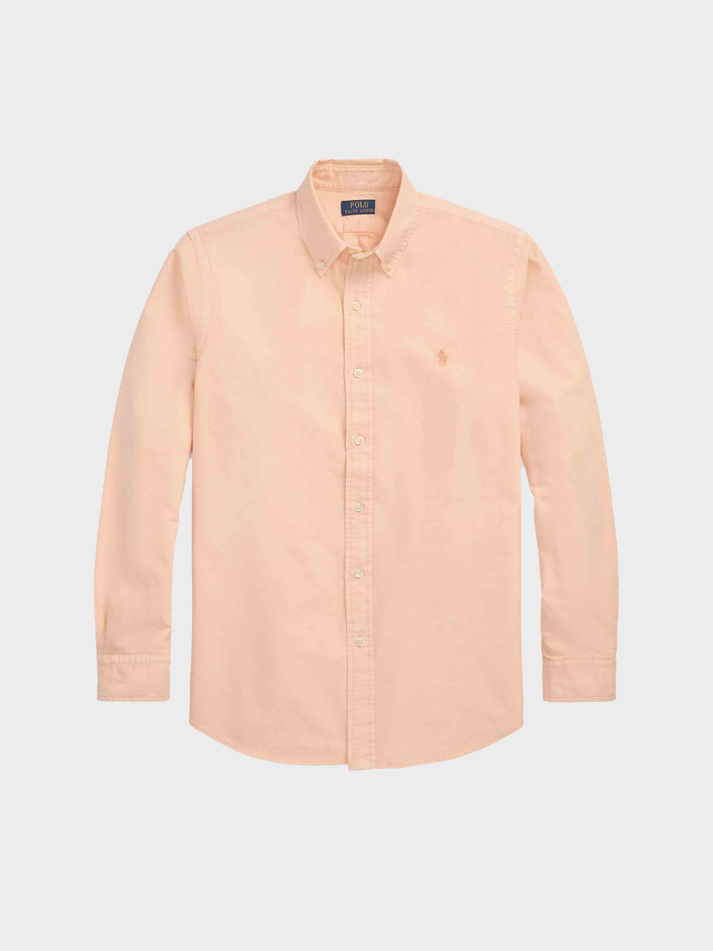 • The oxford shirt made its debut very early in Ralph Lauren’s designs, and since then, it has solidified its status as a pillar of the Polo look. Our fabric is developed with a secret wash, which gives it instant character, ease and a heathered softness. The formula is so unique that it's been kept in a safe for more than three decades. In addition to details evoking its prep-school inspiration, it offers a relaxed feel, producing what we refer to as "the perfect rumple". Today, Mr Lauren continues to create countless variations of his iconic shirt, including this version that is garment-dyed using mineral-derived ingredients to create a unique appearance that will continue to artfully fade for a timeworn look.