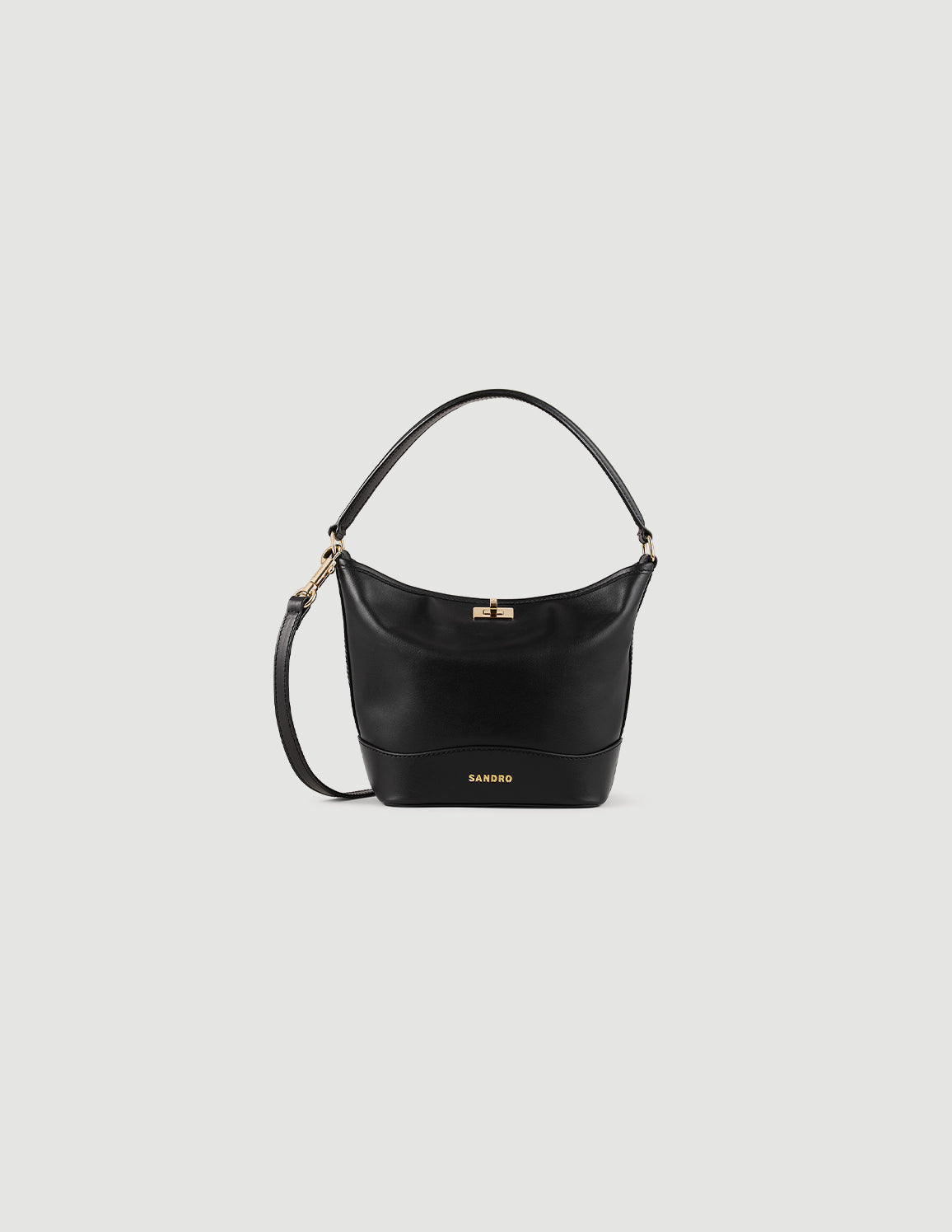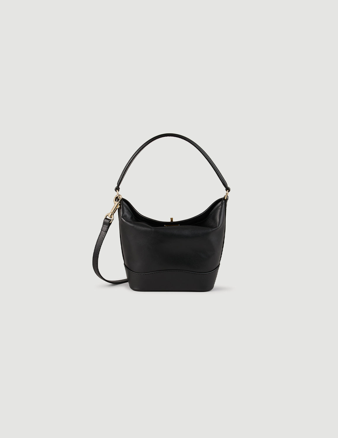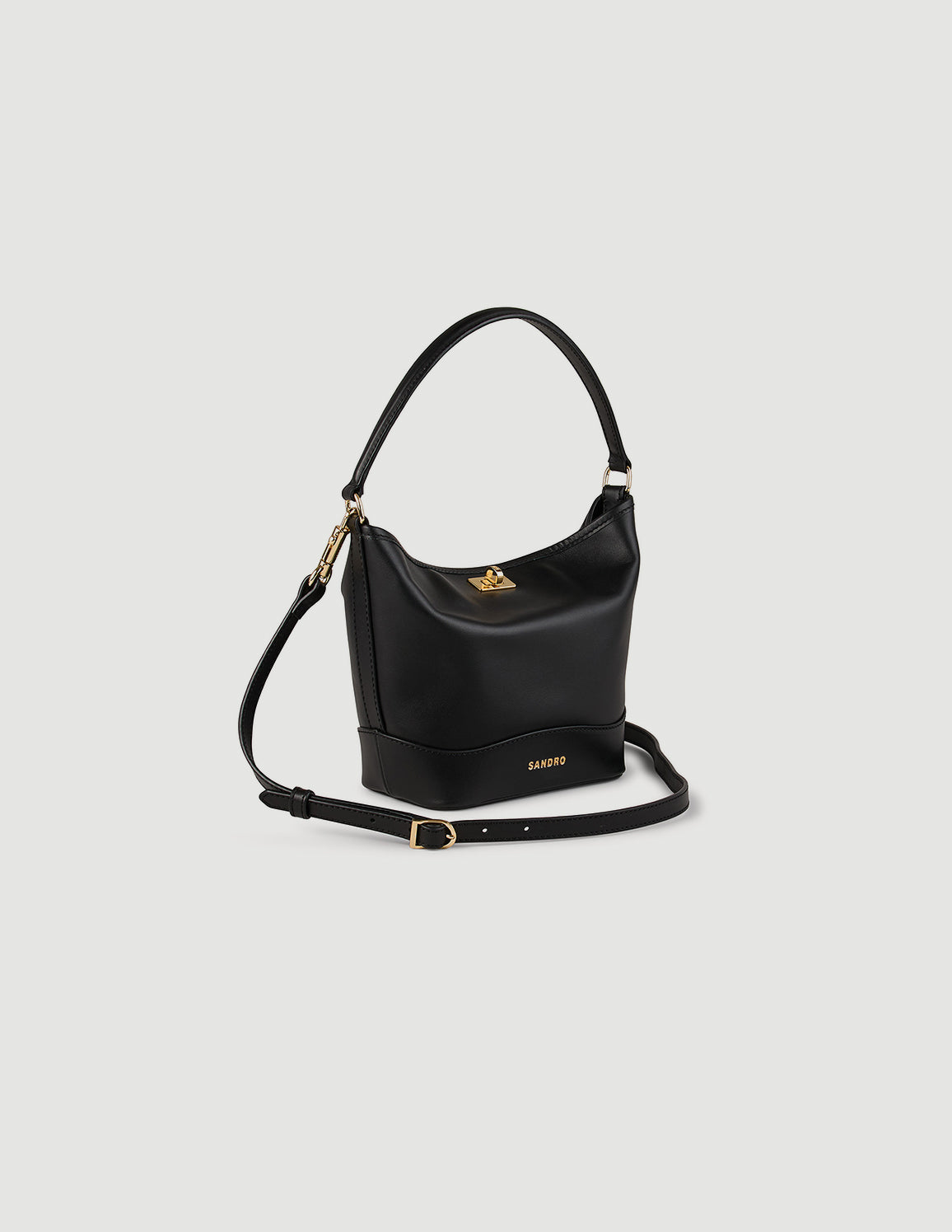 • Small leather bucket bag with swivel clasp, featuring a handle for shoulder or hand carrying and a removable shoulder strap for crossbody carrying.