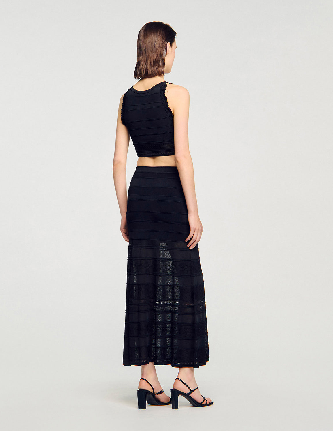 • Sleeveless cropped jumper in a decorative knit, with a round neck and ruffled trim on the armholes.