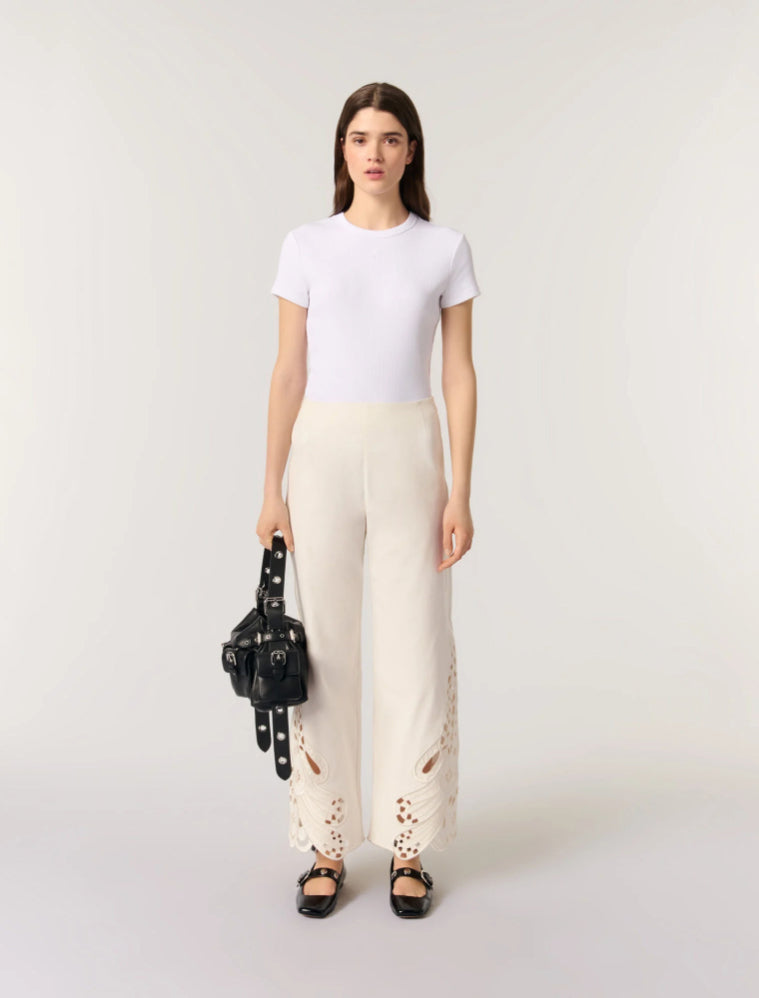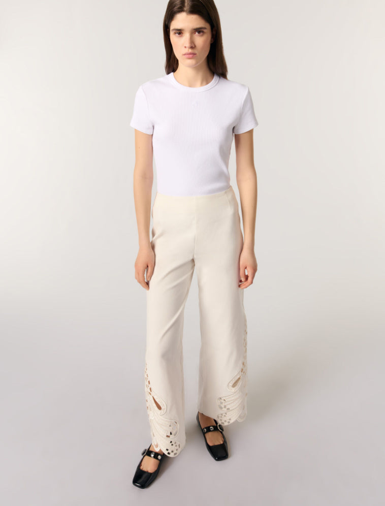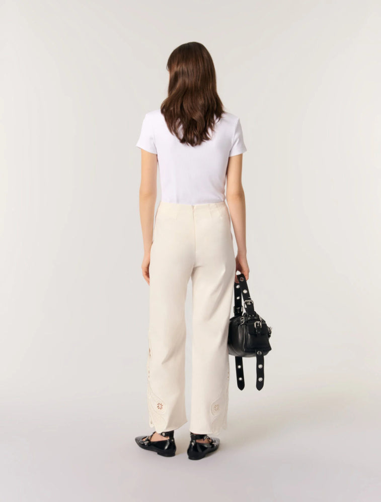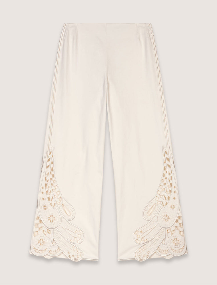 • These cream trousers have an elegant fit, embellished with openwork embroidery and scalloped edges. The mid-rise waist and wide-leg style create a chic casual silhouette. Mix and match with a T-shirt, ballet flats and a bag.