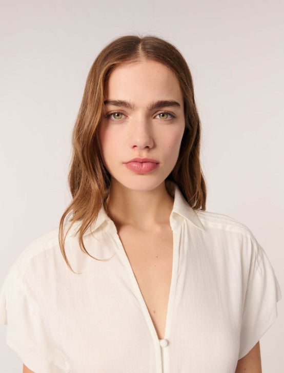 • It features a V-neck shirt collar with sleeves that have stoppers as well as a button fastening. The pleated waist and smocked back create a flowing feel.