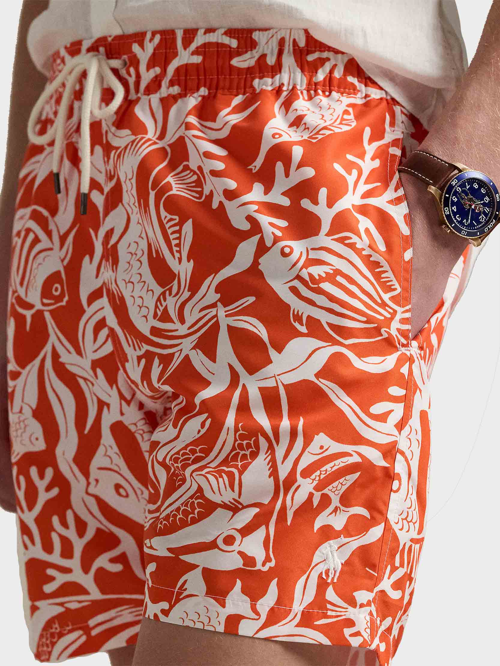 • Side on-seam pockets. Back right buttoned pocket. "Polo Ralph Lauren Swimwear" label on the back right pocket.