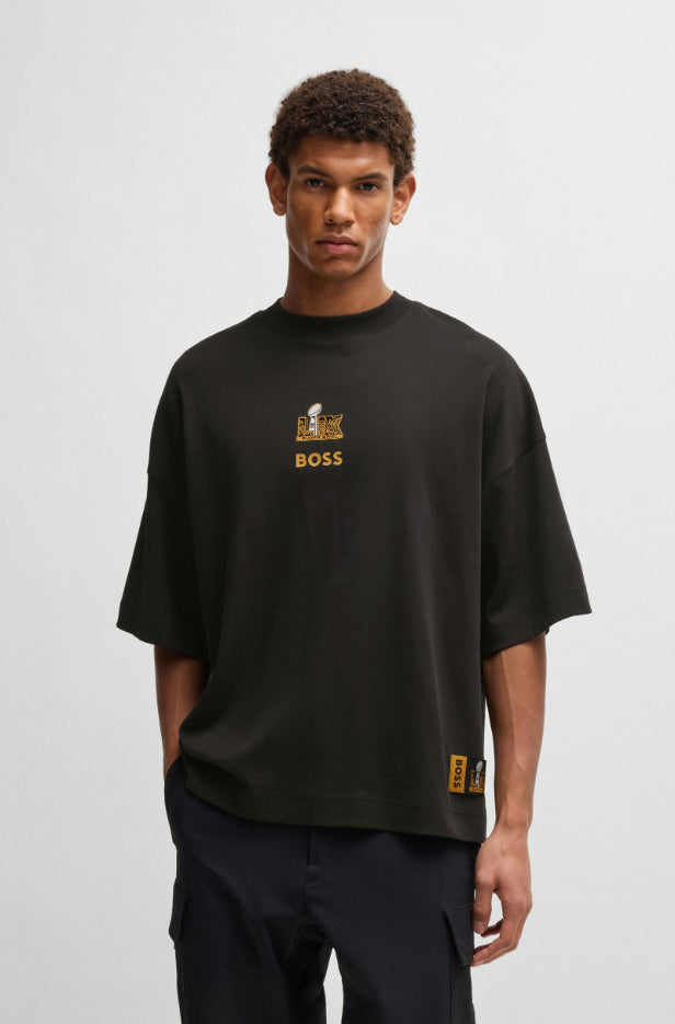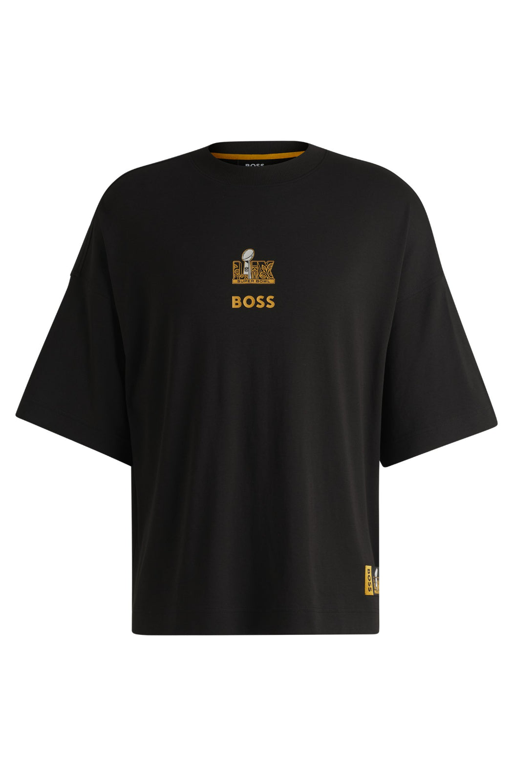 • Relaxed fit t-shirt out of modern interlock quality developed in two different colorways: 1 solid black and 1 dip dyed degradé effect black to gold/ HD print of official Super Bowl logo at front chest / elevated embroidery running at back / special outside woven label jacquard with SB logo