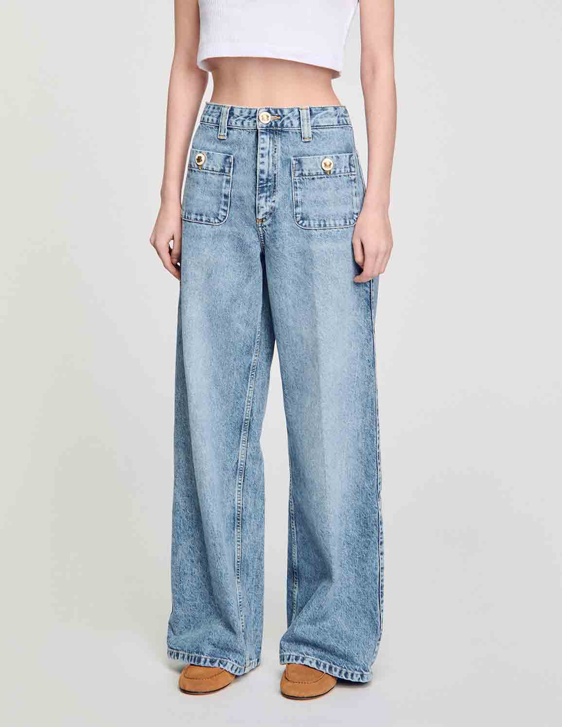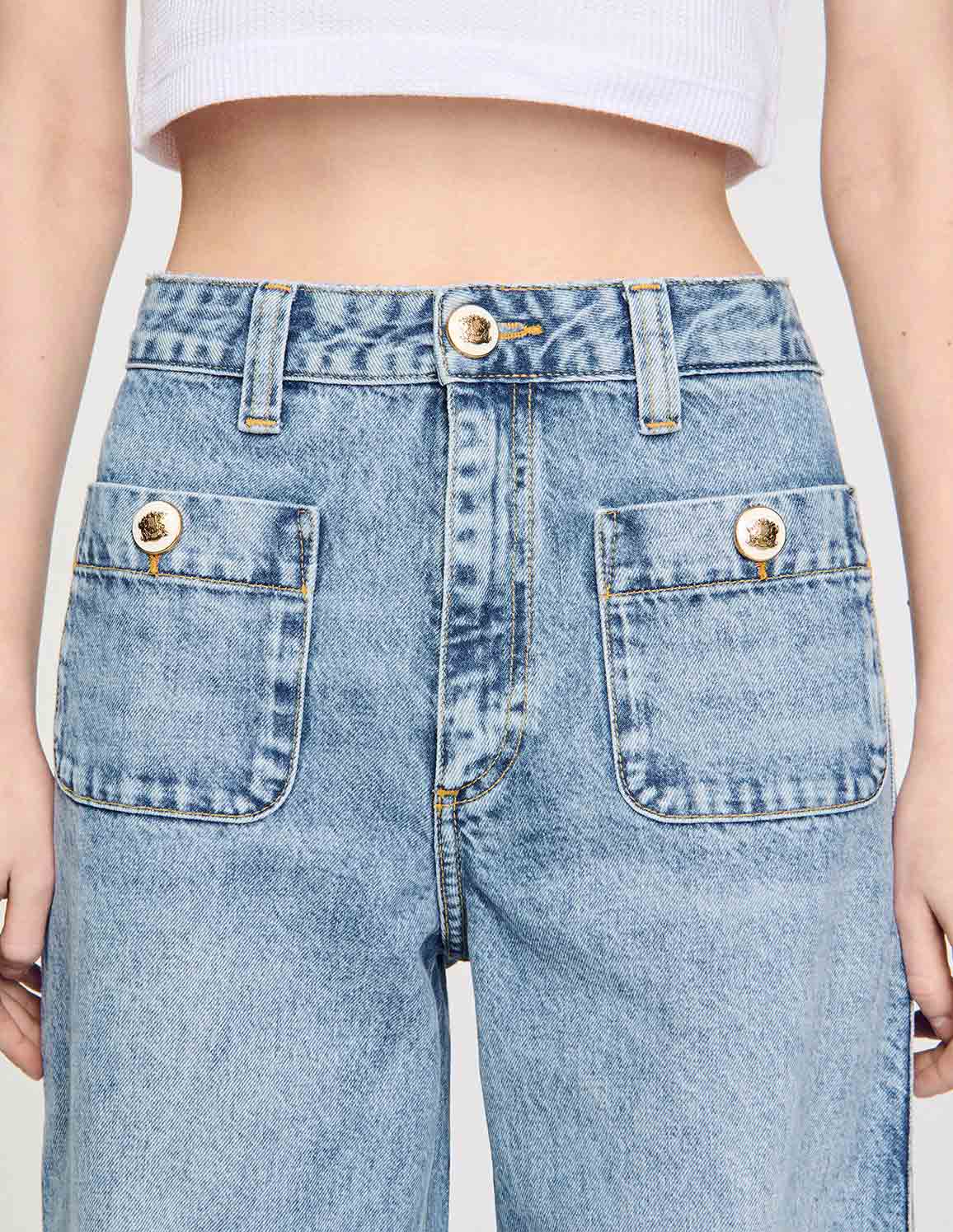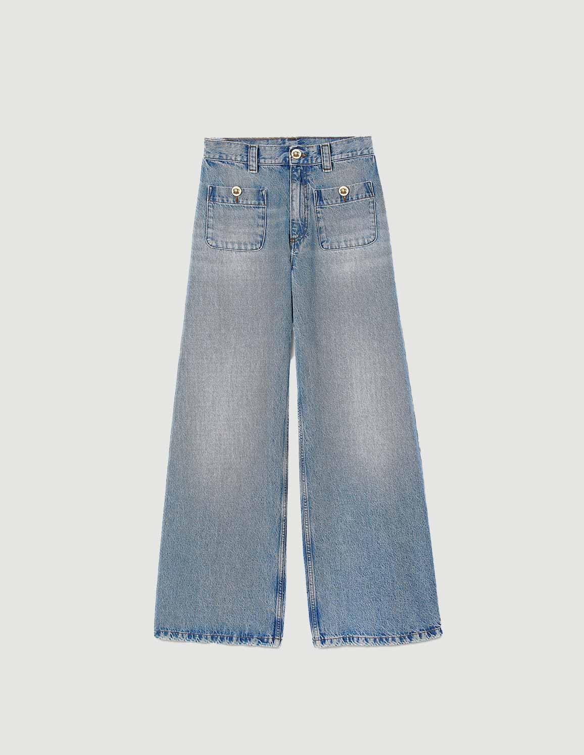 • Faded straight-leg jeans with patch pockets featuring decorative buttons.