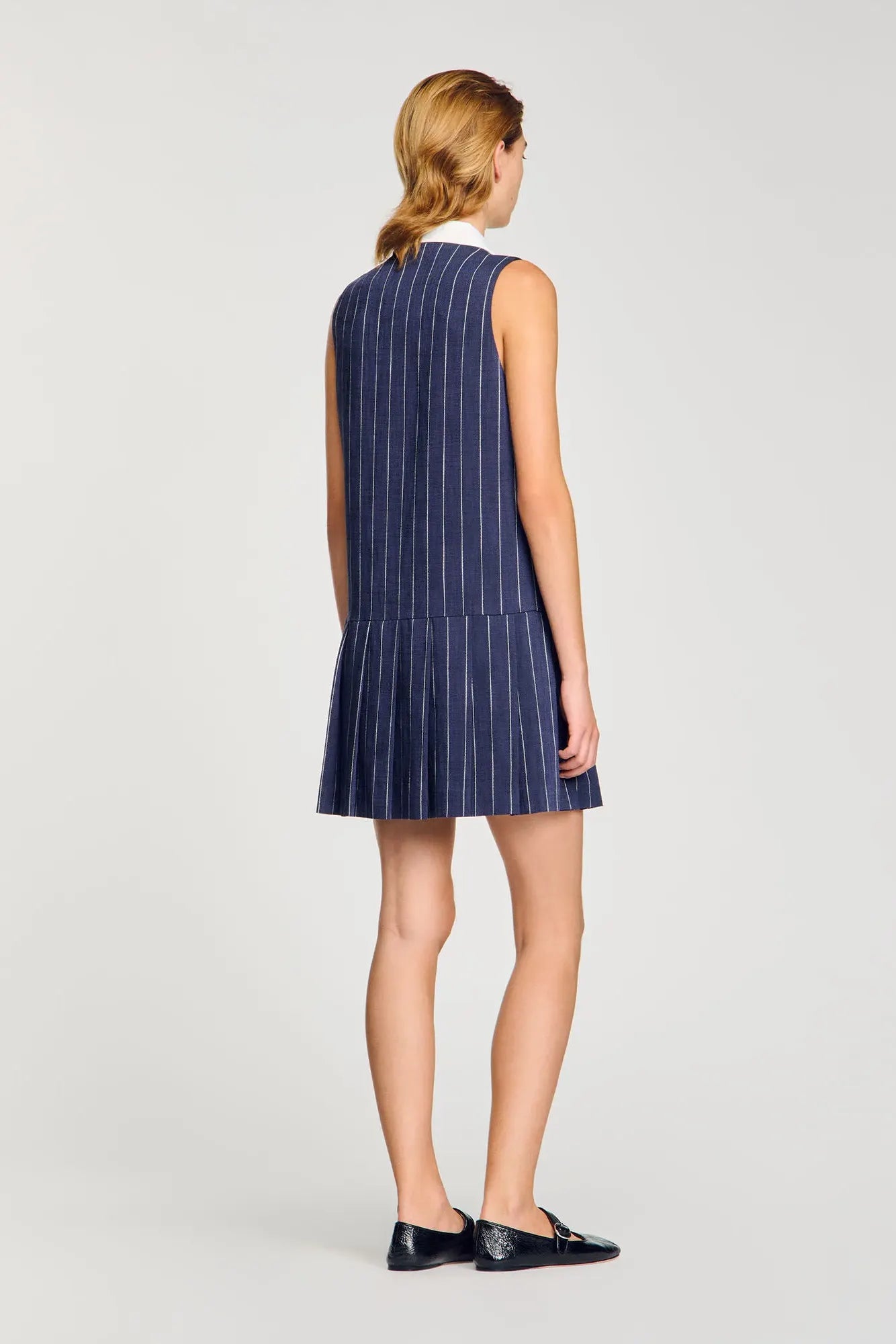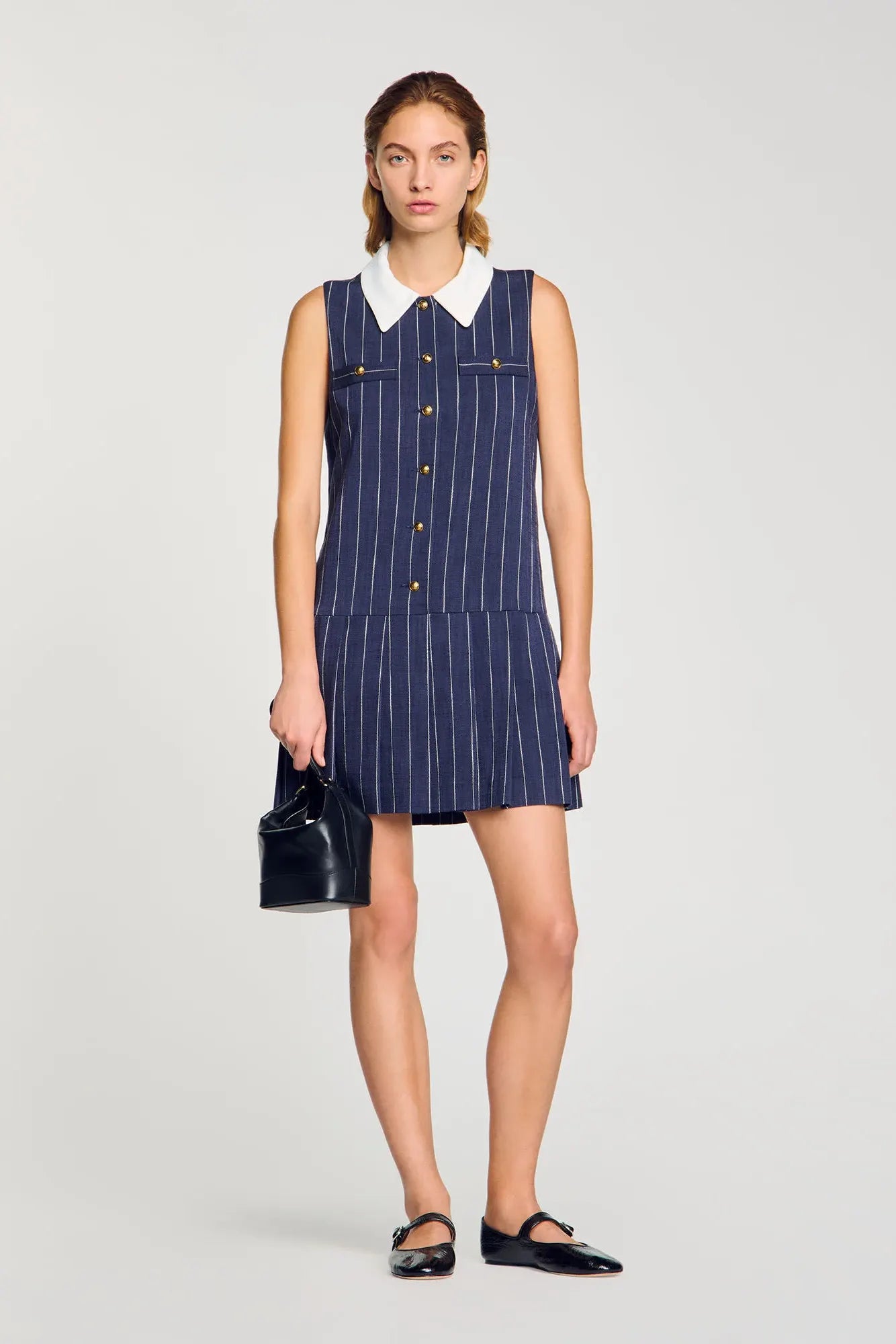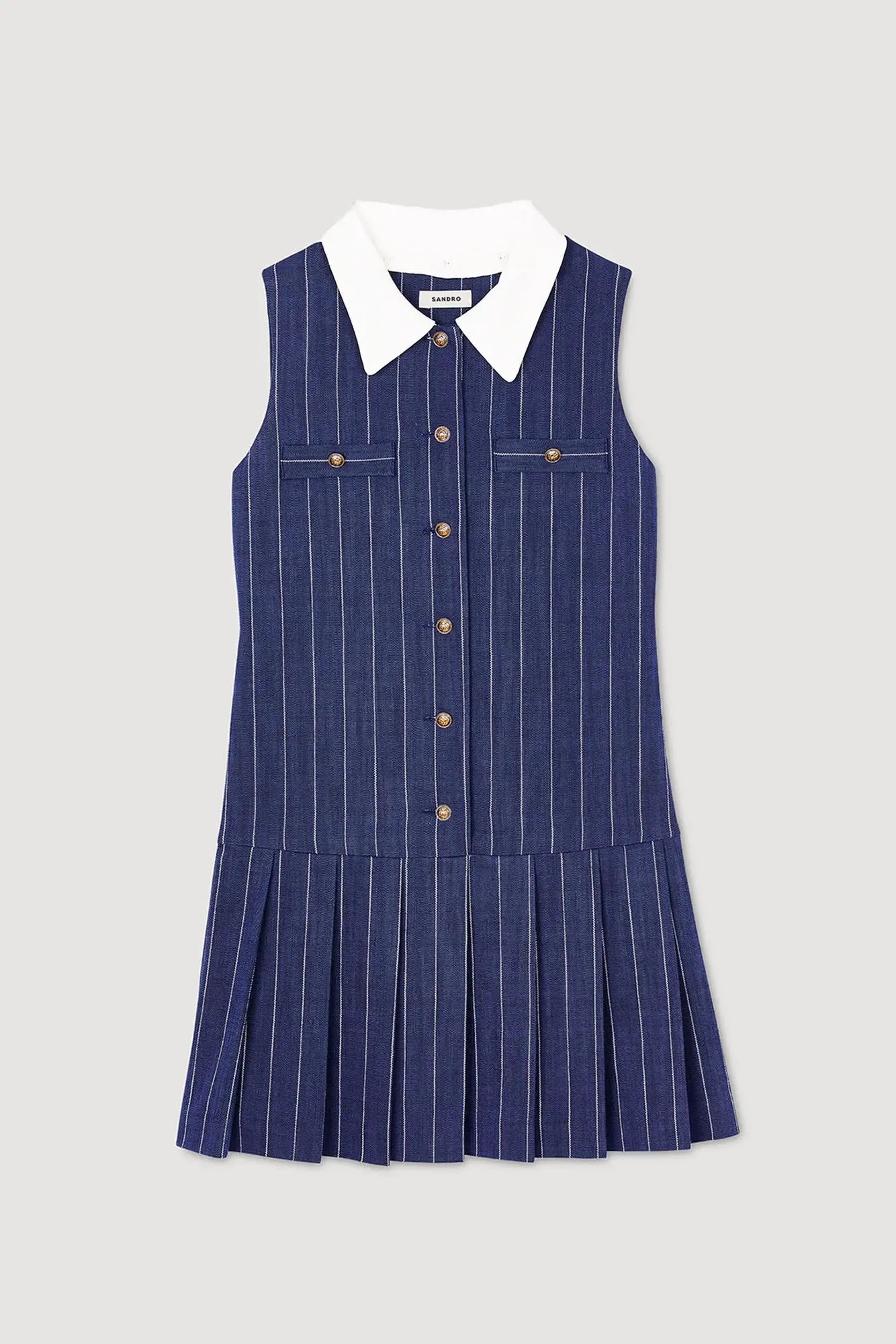 • Sleeveless short striped dress with removable contrast collar, decorative buttons, welt pockets at chest and pleated skirt.