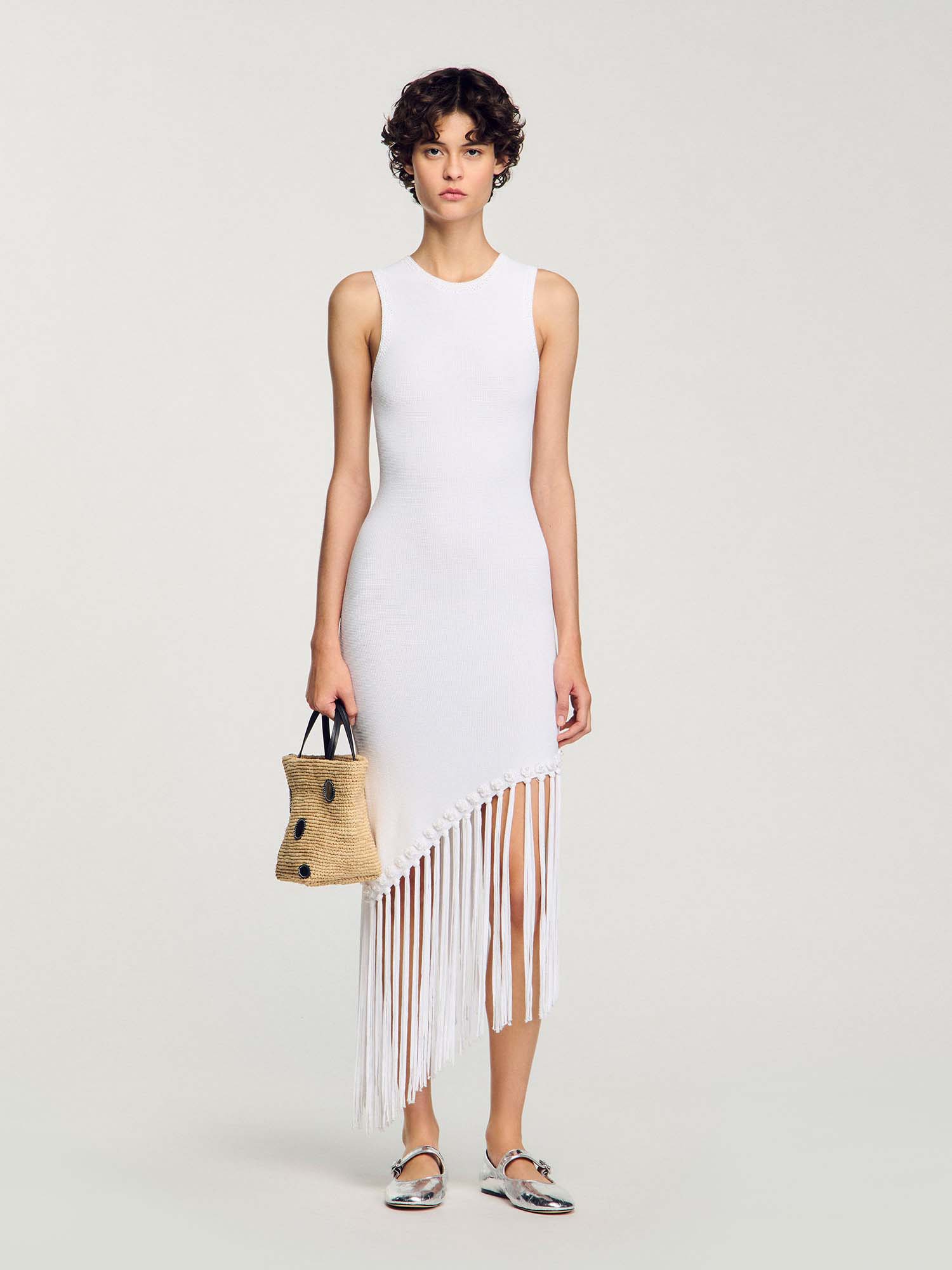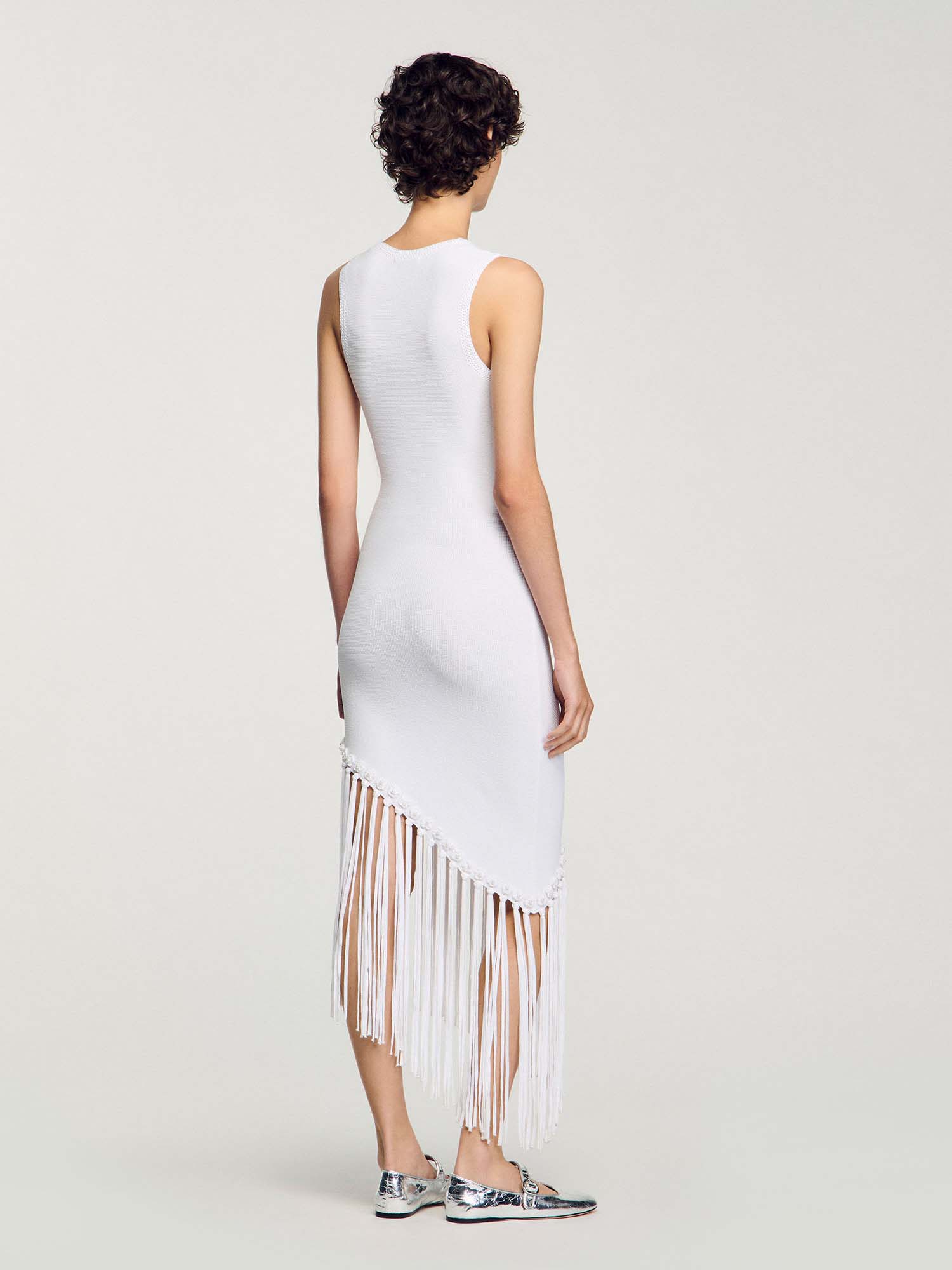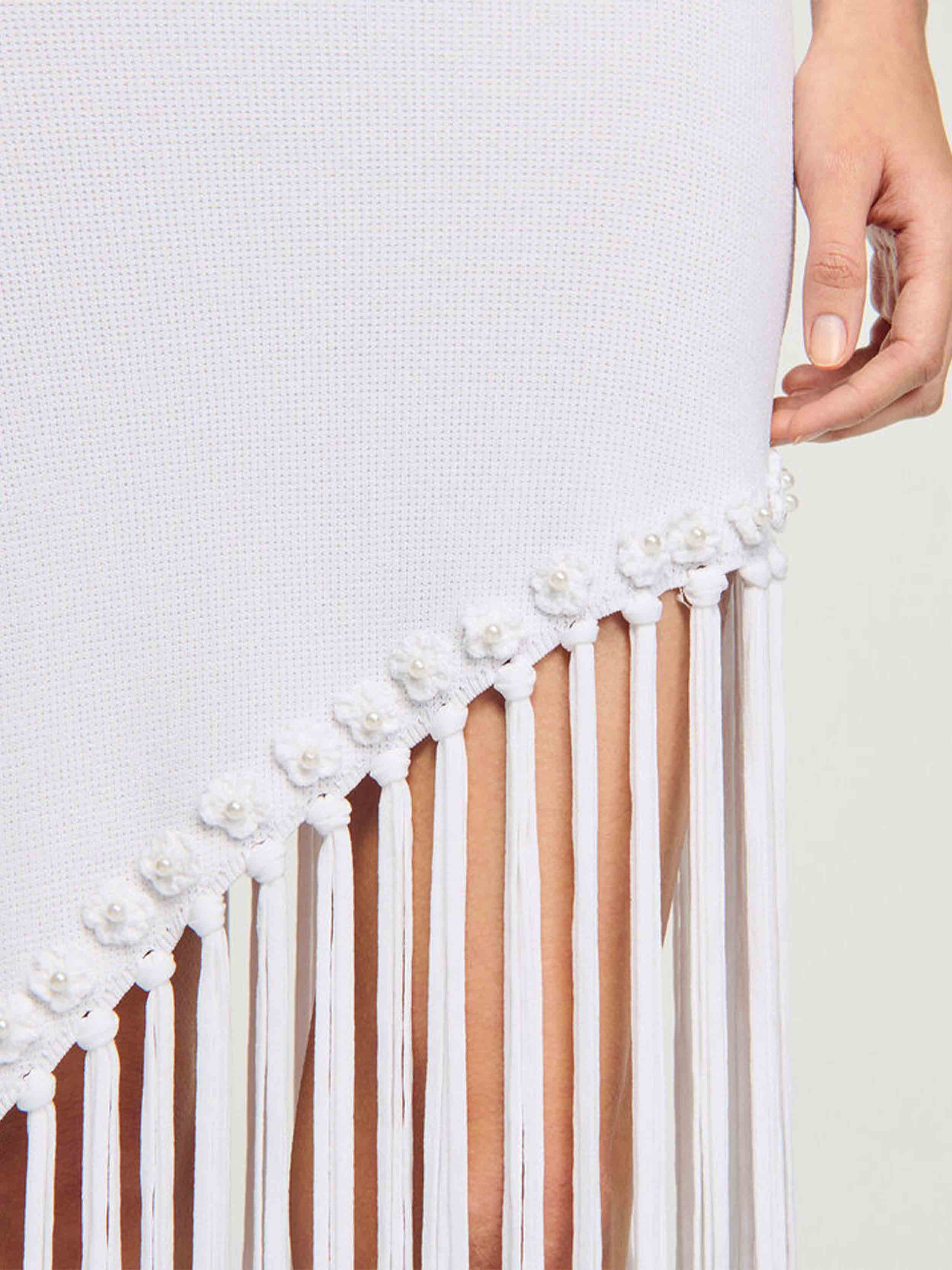 • Asymmetrical sleeveless knit maxi dress with a round neck and beaded crocheted floral fringes.