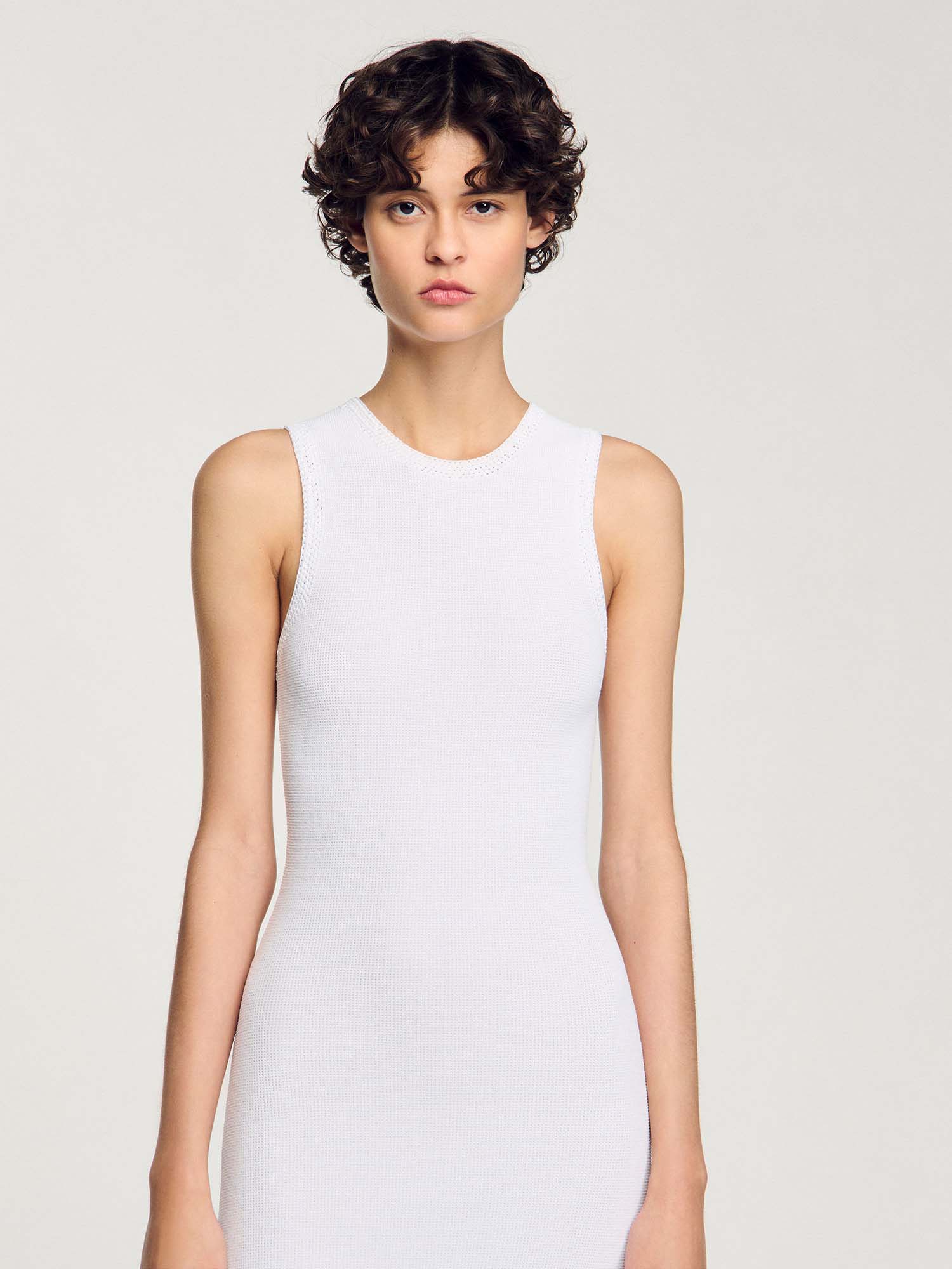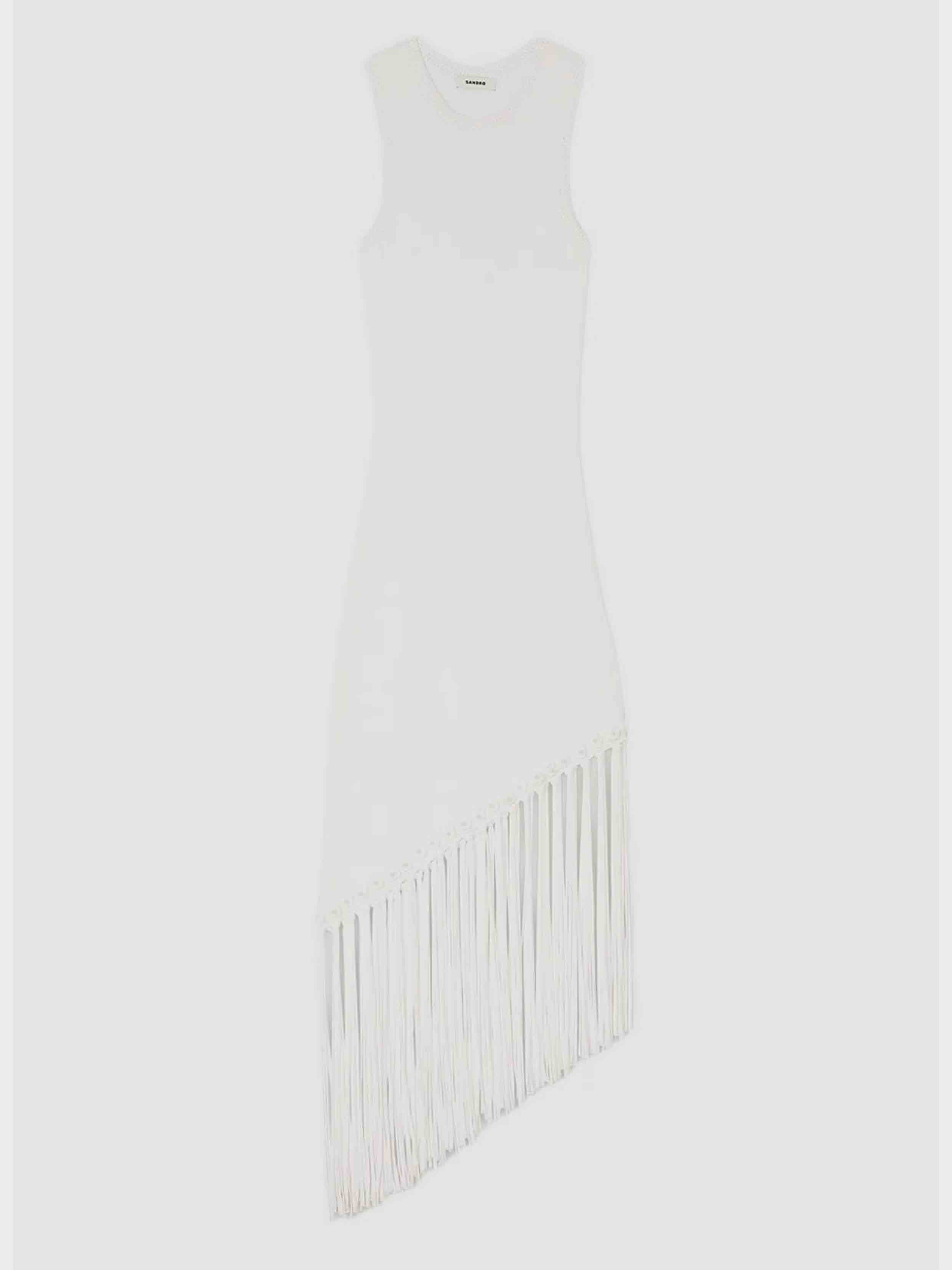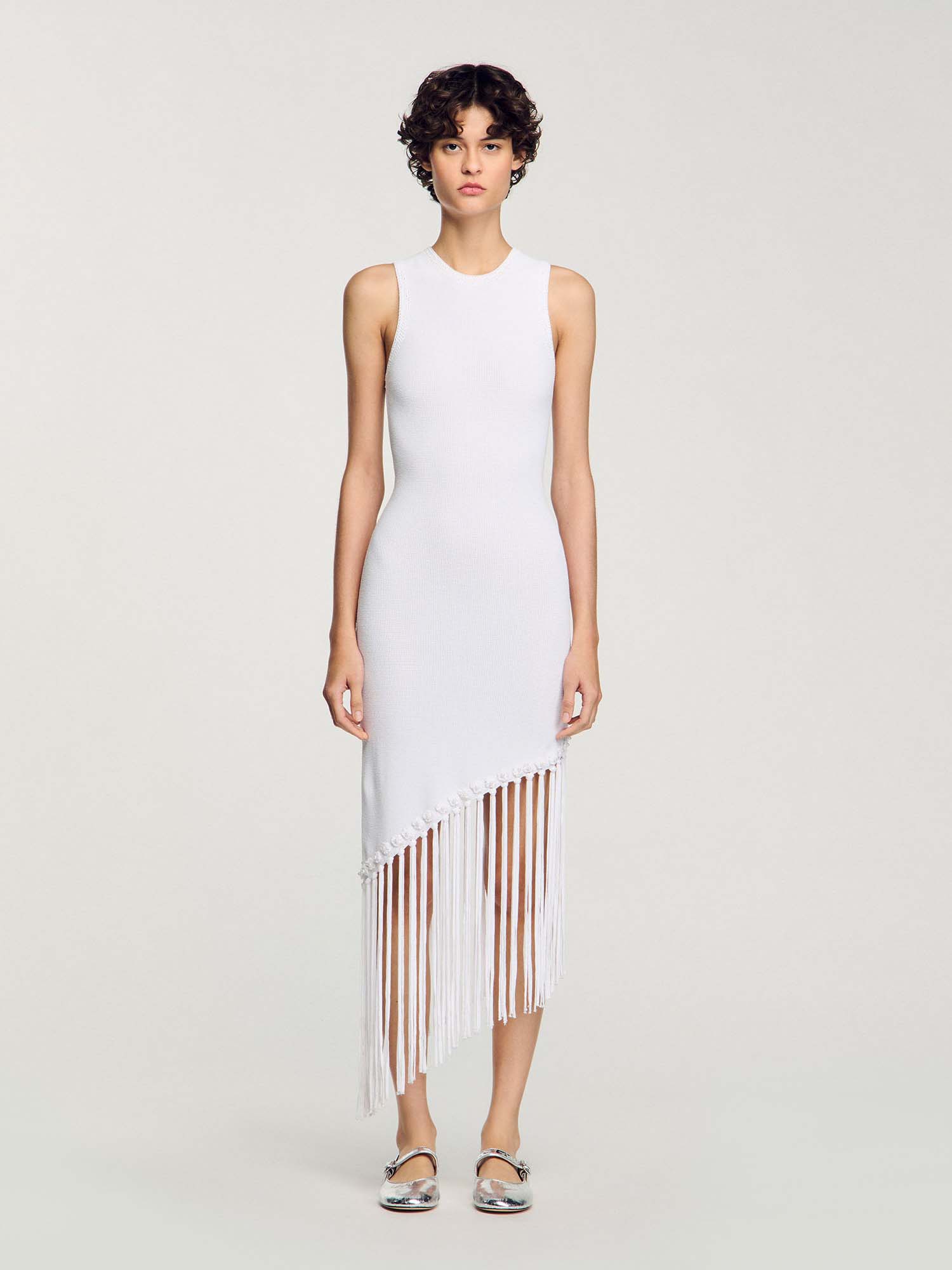 • Asymmetrical sleeveless knit maxi dress with a round neck and beaded crocheted floral fringes.