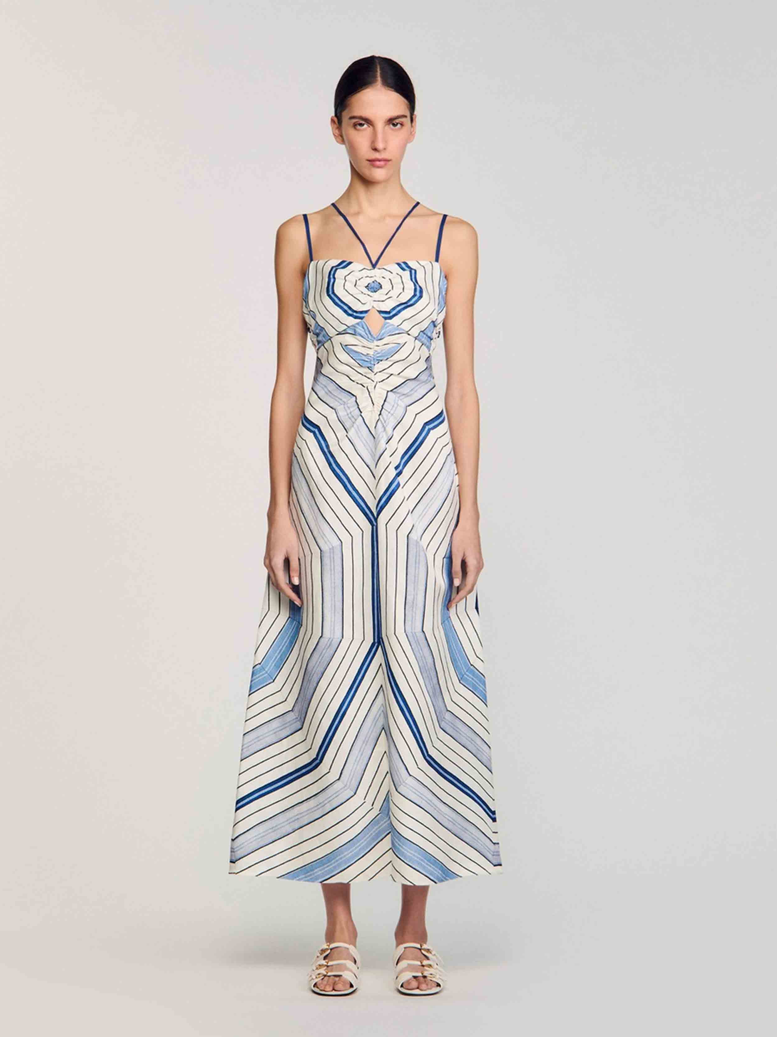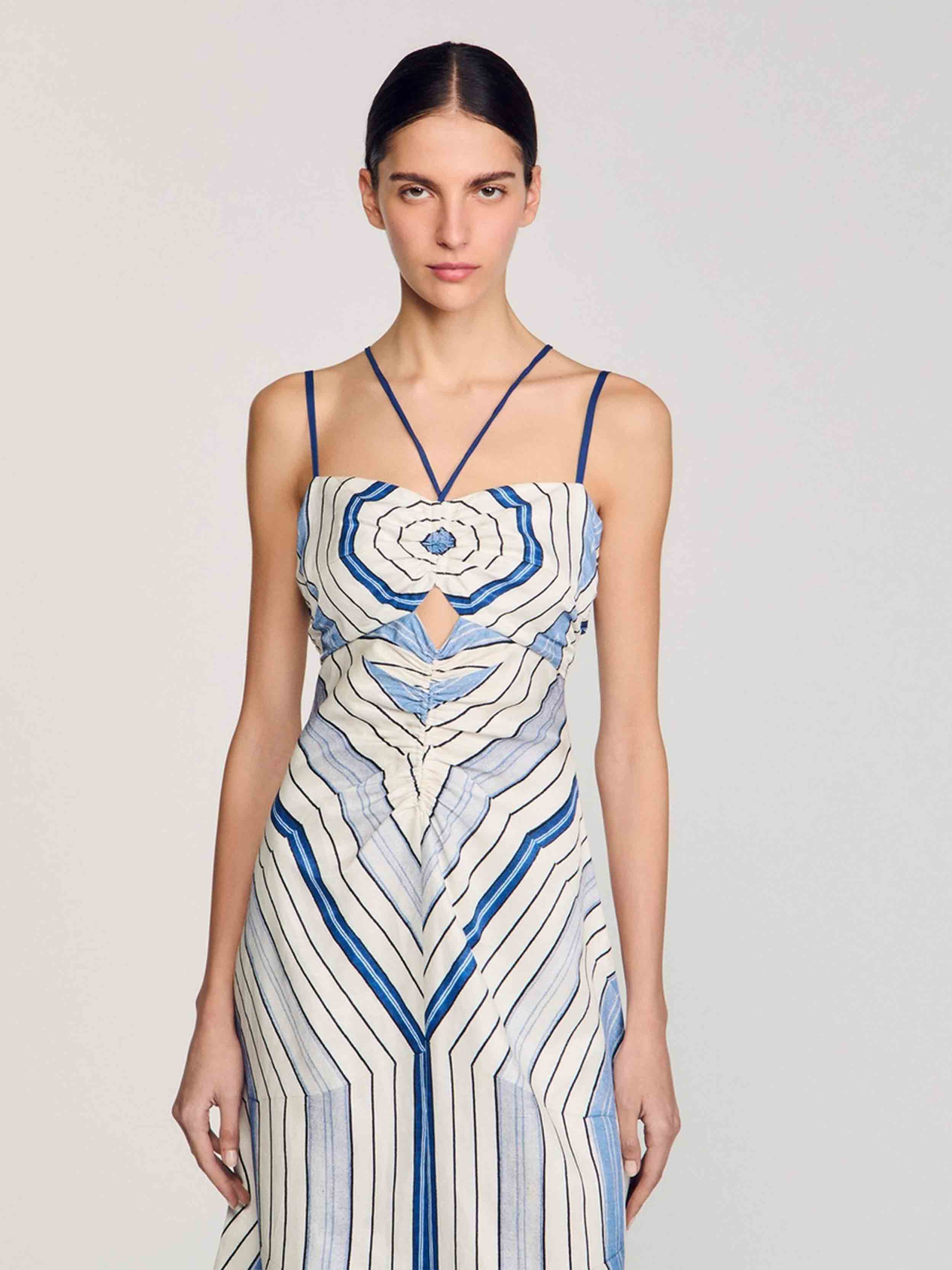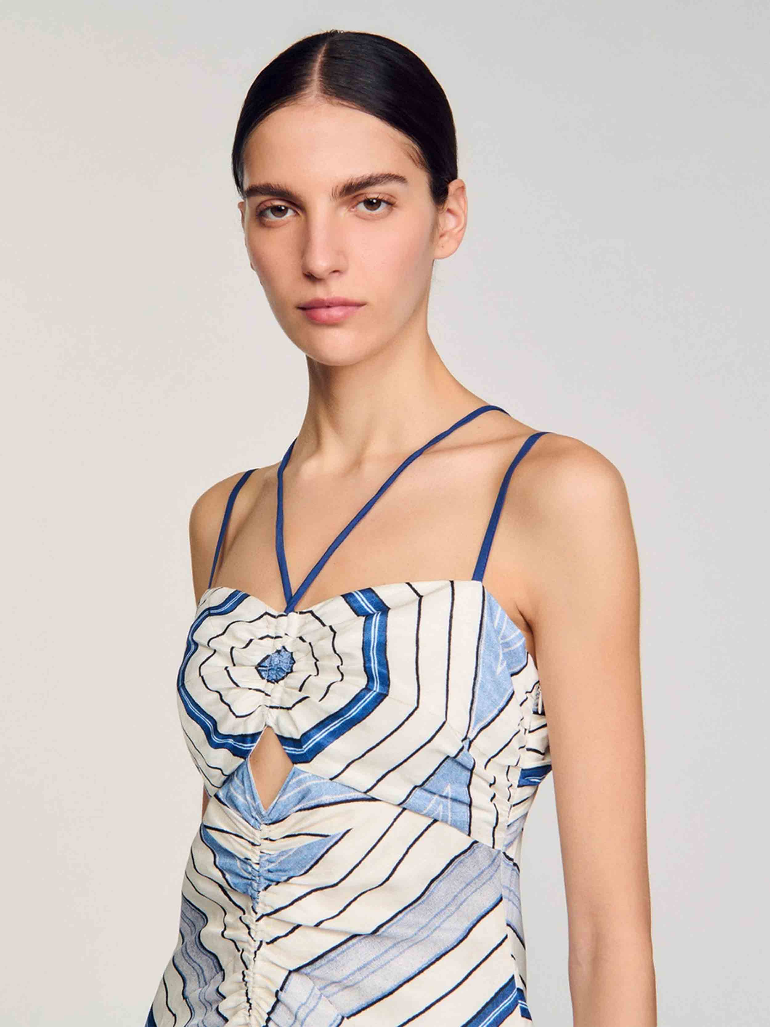 • Spiral-motif midi dress with spaghetti straps and ties, ruching and openwork details on the front.