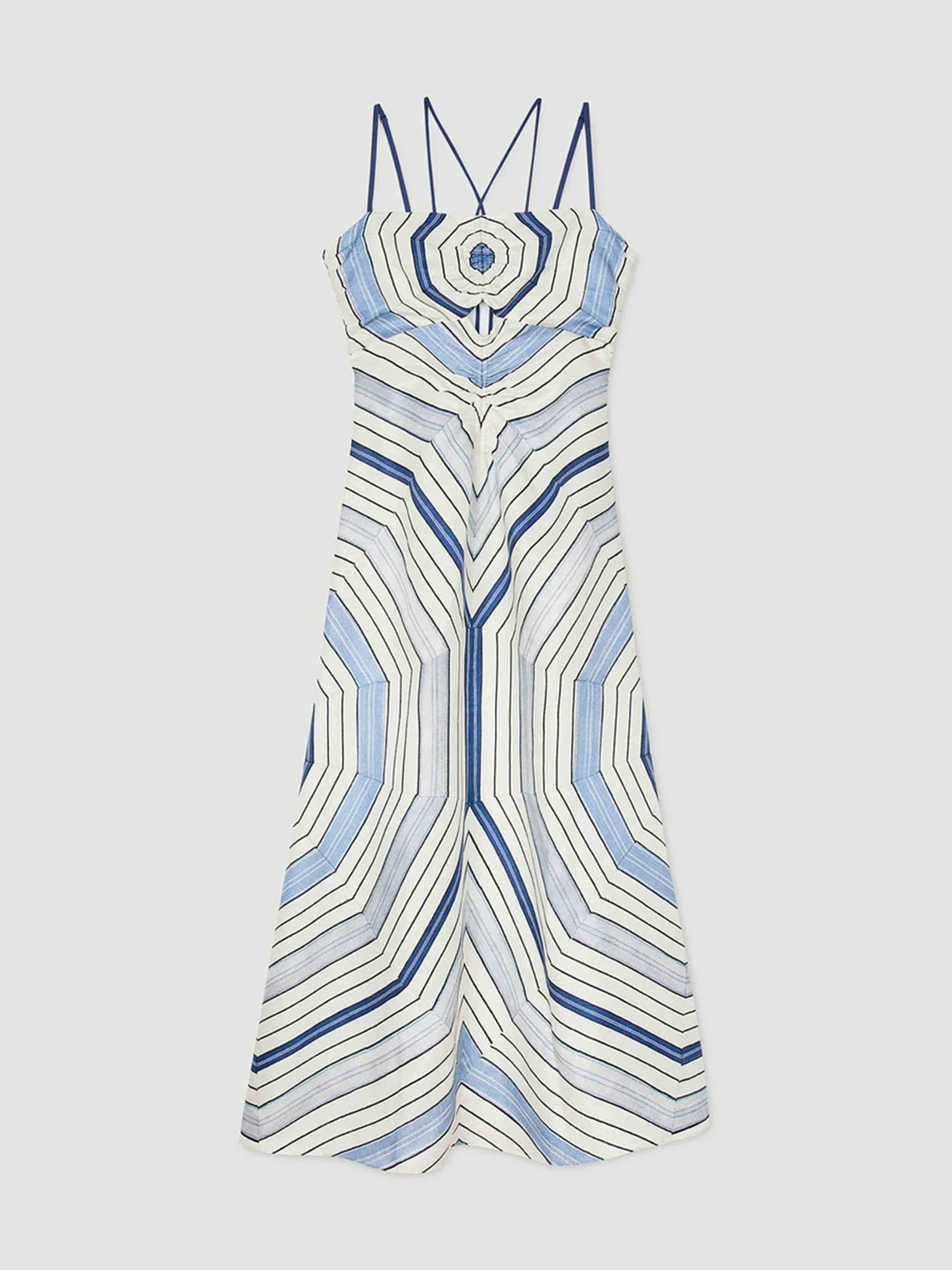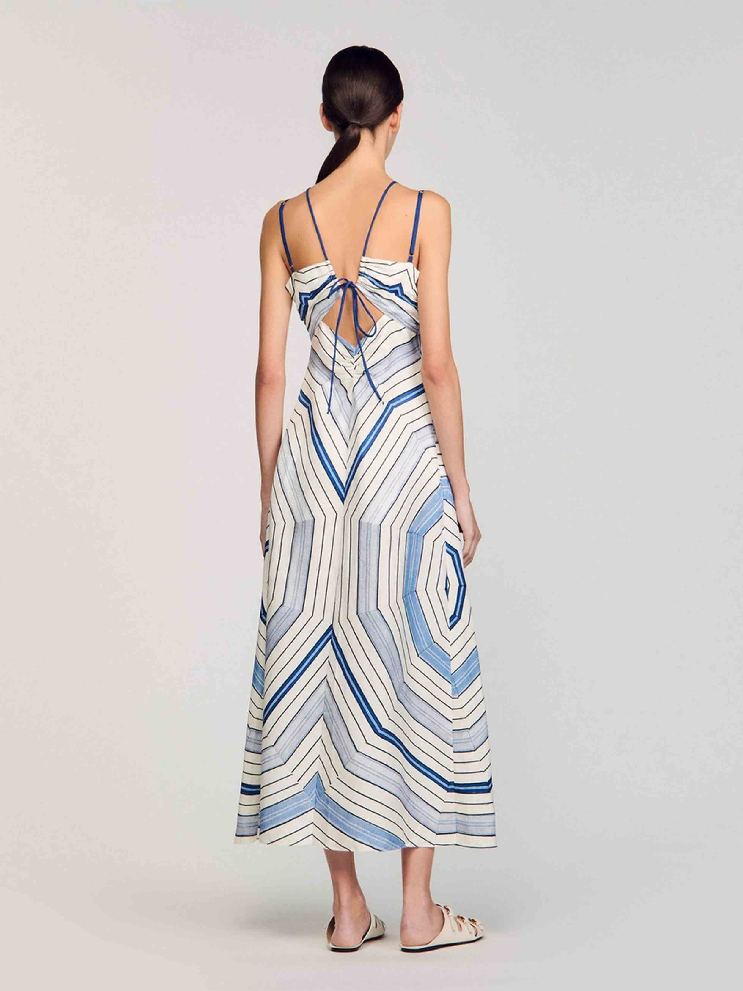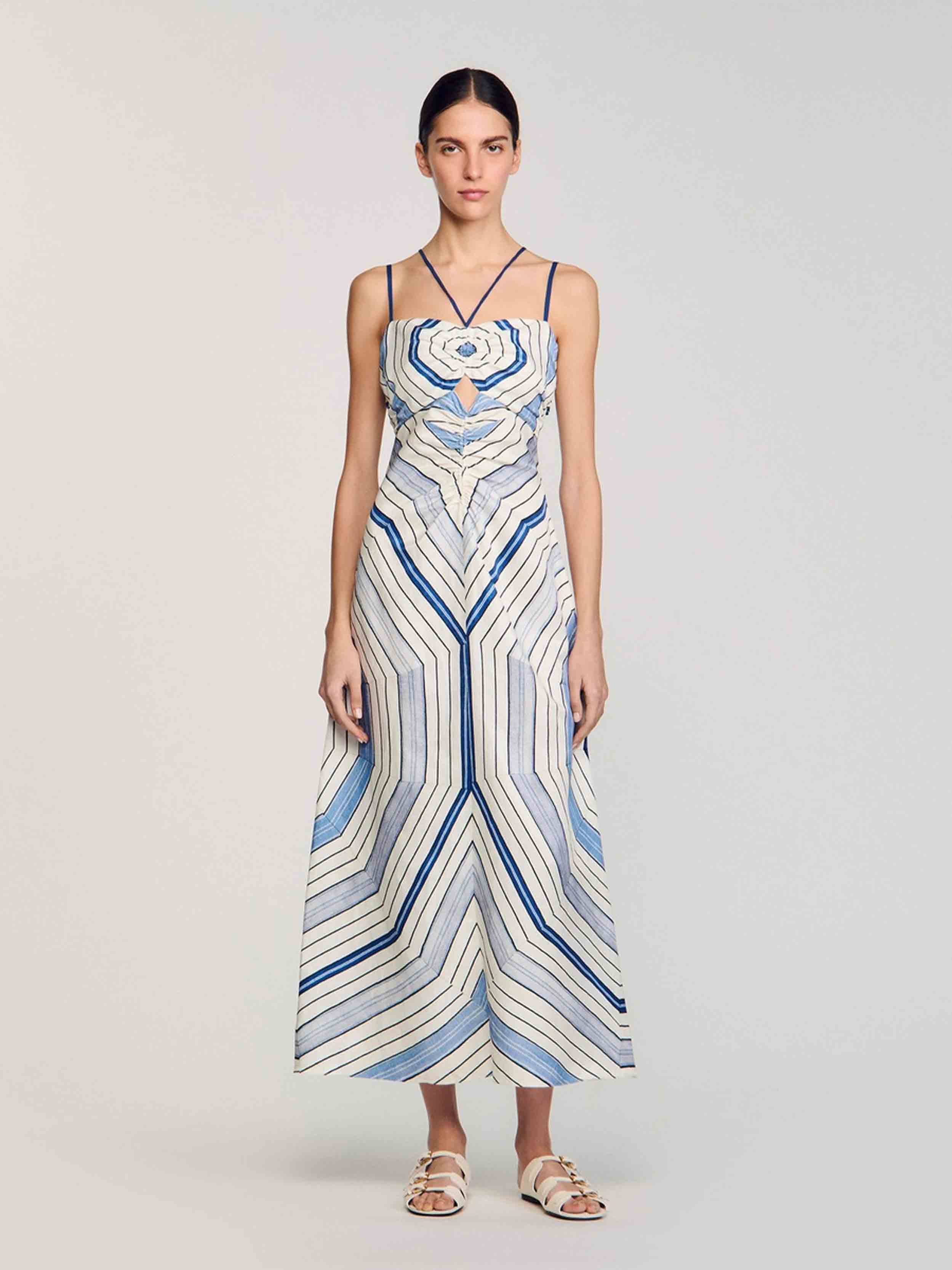 • Spiral-motif midi dress with spaghetti straps and ties, ruching and openwork details on the front.