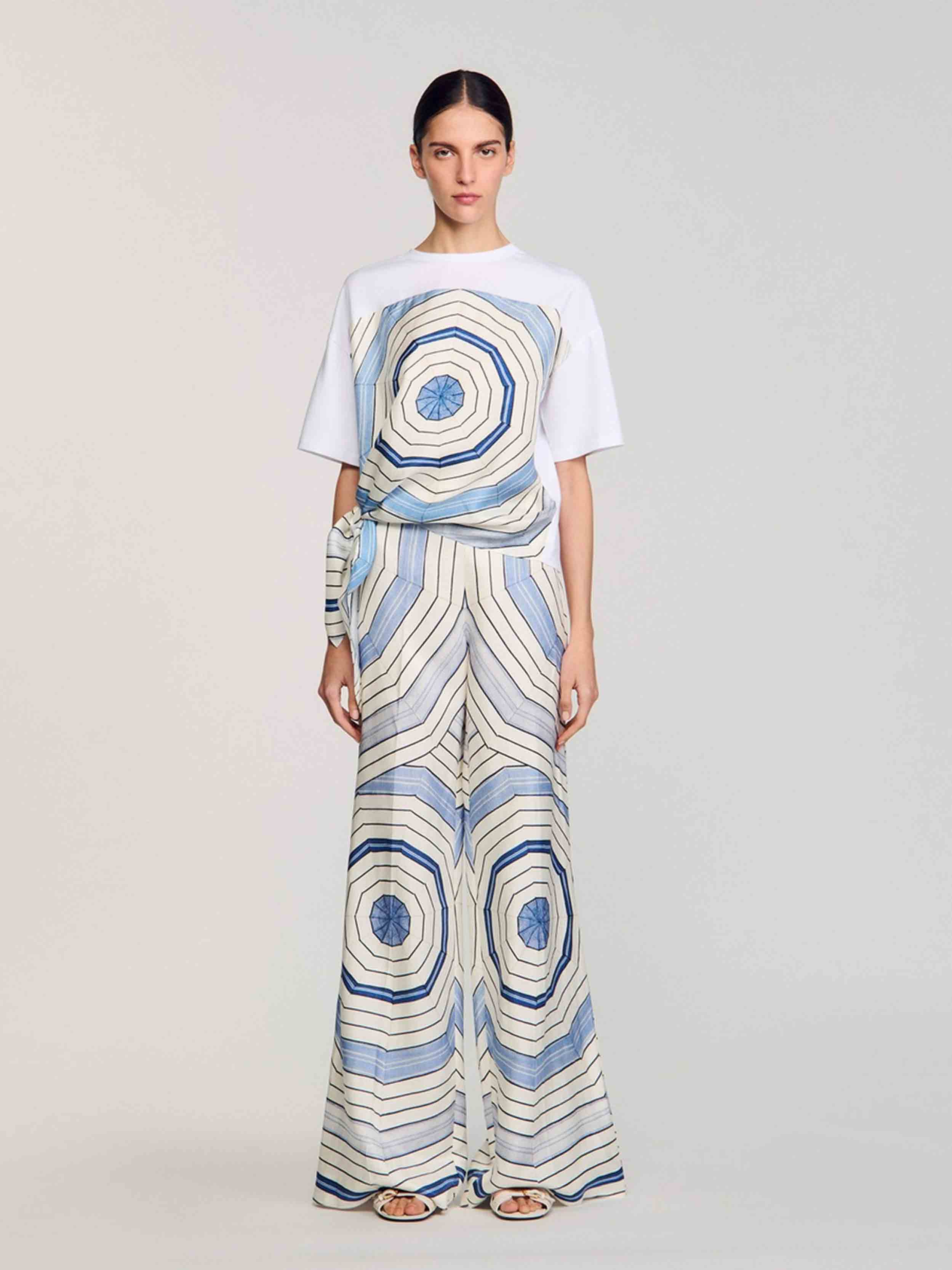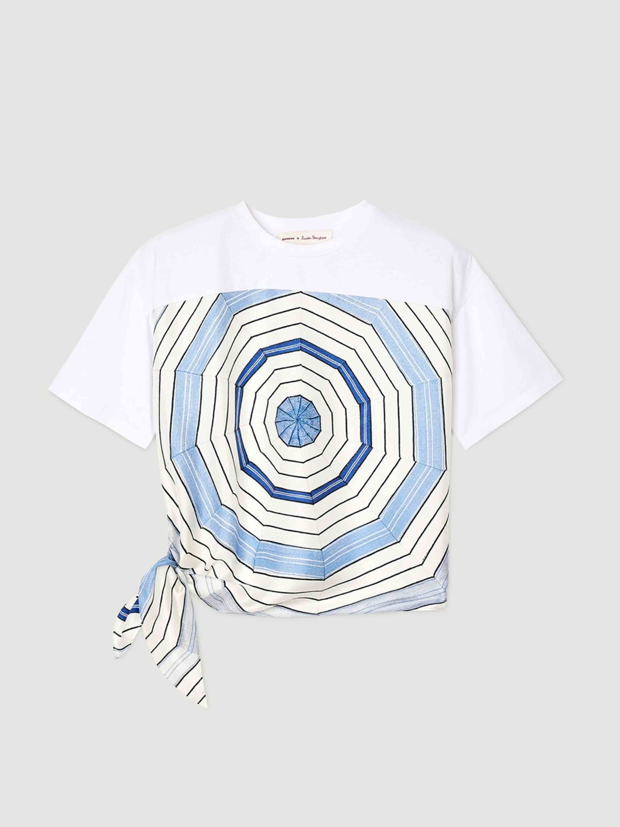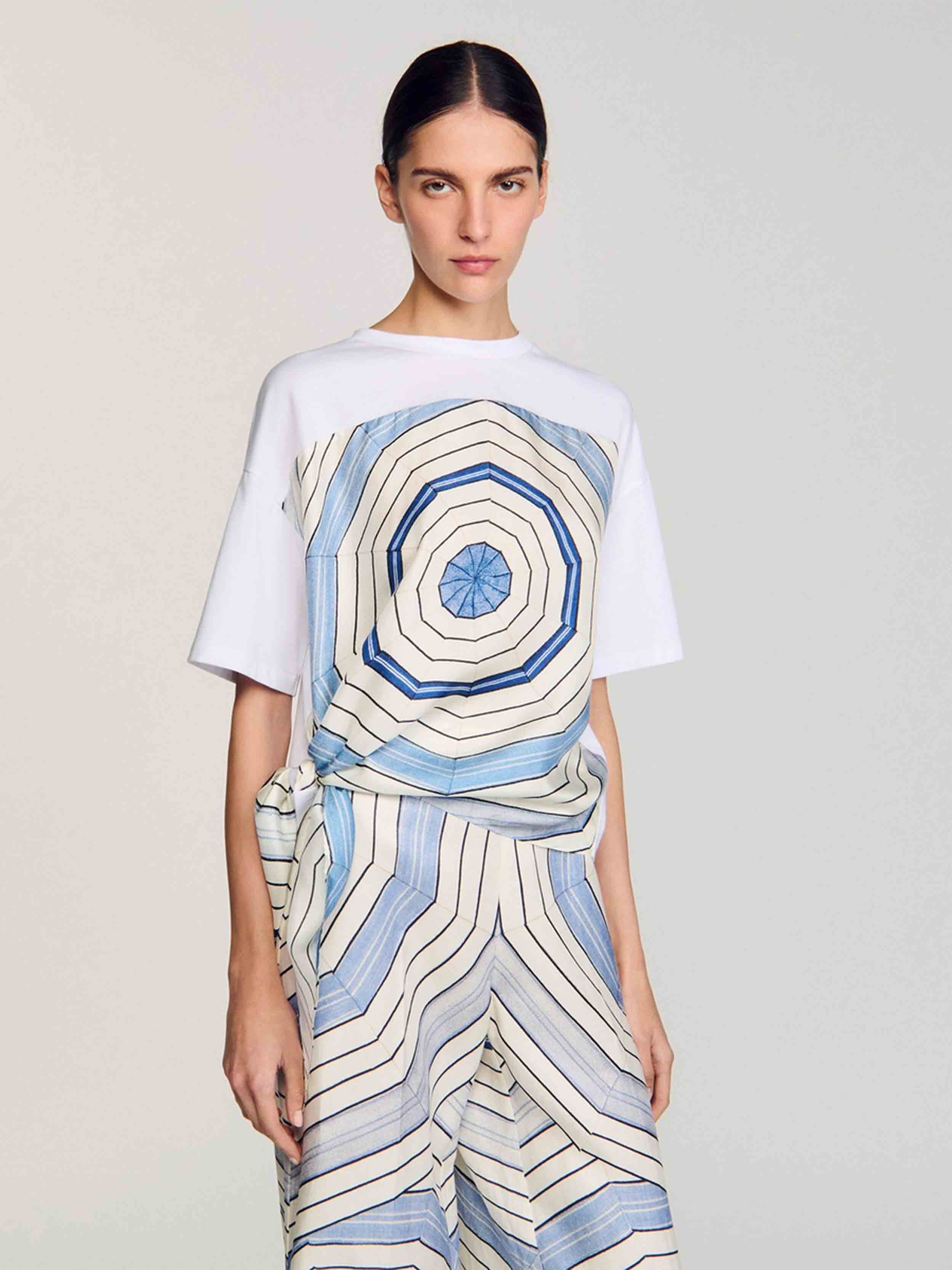 • Cotton T-shirt with round neck and short sleeves, featuring a spiral-print silk panel that ties at the front.