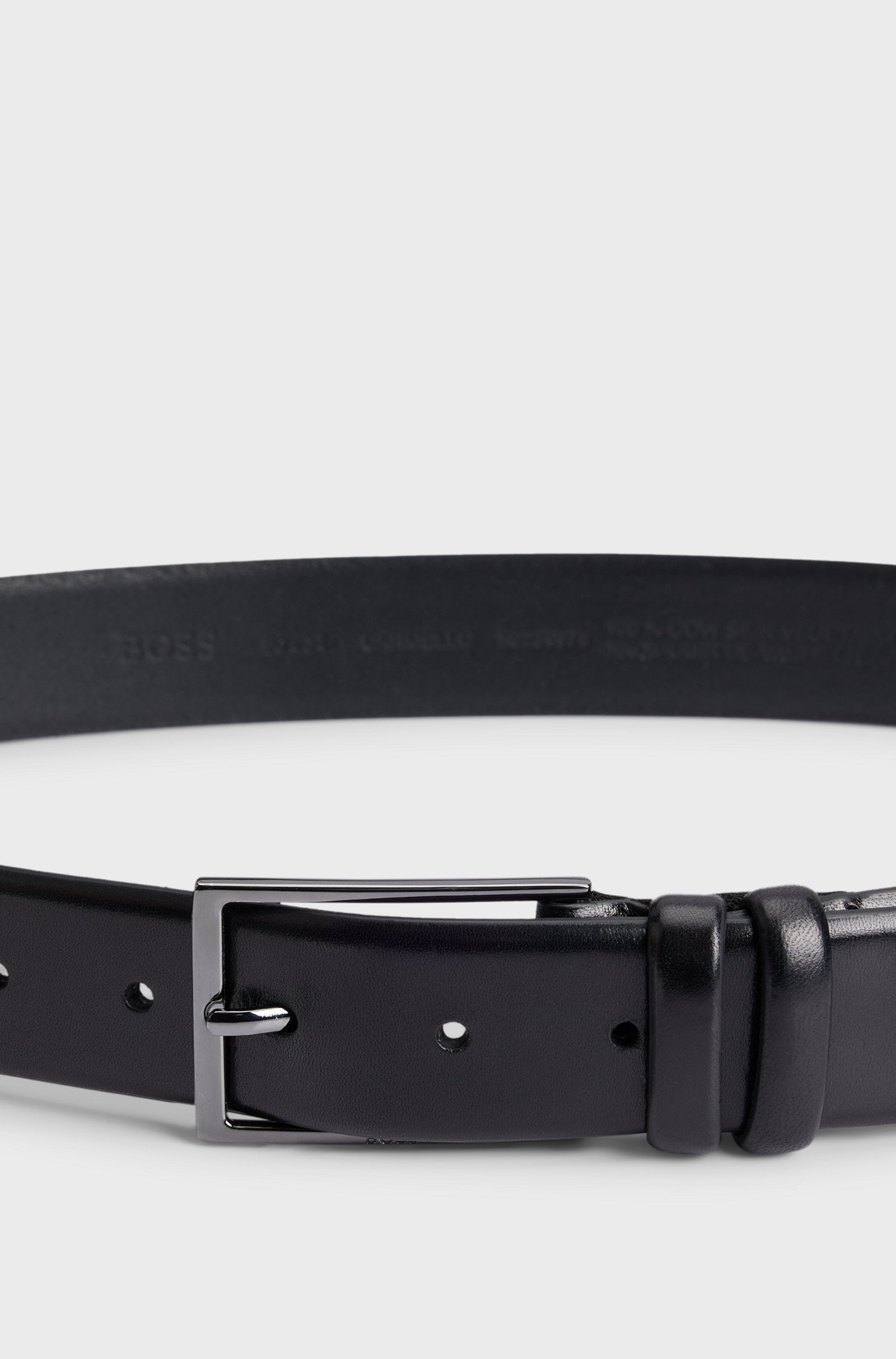 • An elegant belt with a 3.5cm width by BOSS, designed for business and casual looks alike. Securing with a logo-trimmed pin buckle in polished gunmetal, this belt is crafted in leather with a vegetable-tanning process for enhanced character. A double leather keeper gives this accessory a contemporary touch. For the best fit, we advise to order a belt one size larger than your waist size.