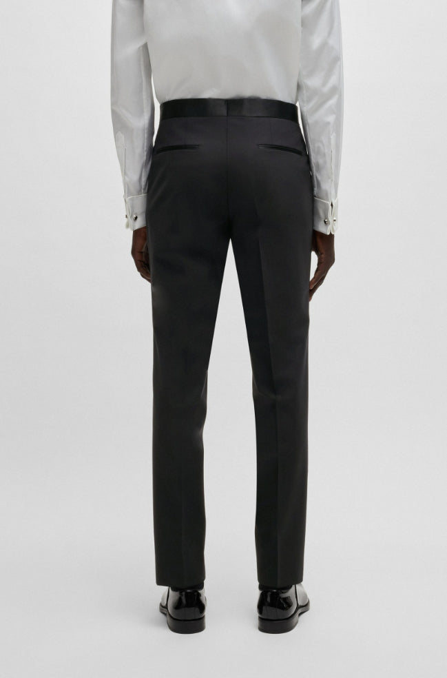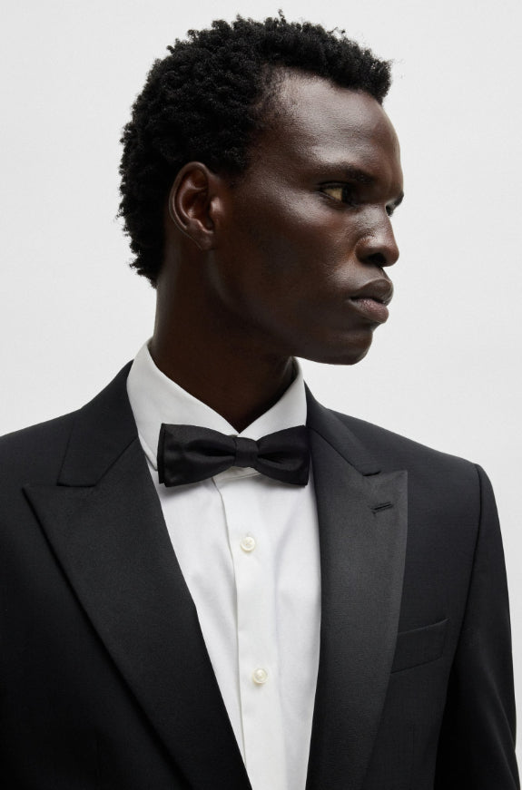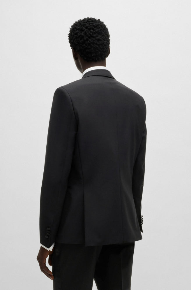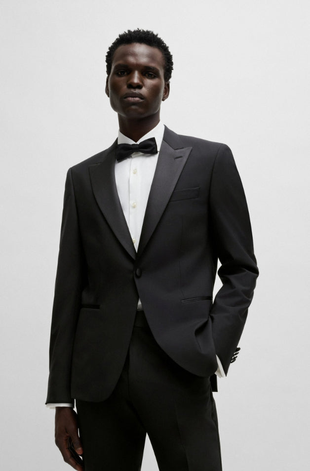 • A classic BOSS tuxedo. This two-piece suit with silk-blend trim is crafted from a virgin wool blend with stretch for ease of movement and reliable wrinkle resistance. The suit features a modern slim fit.