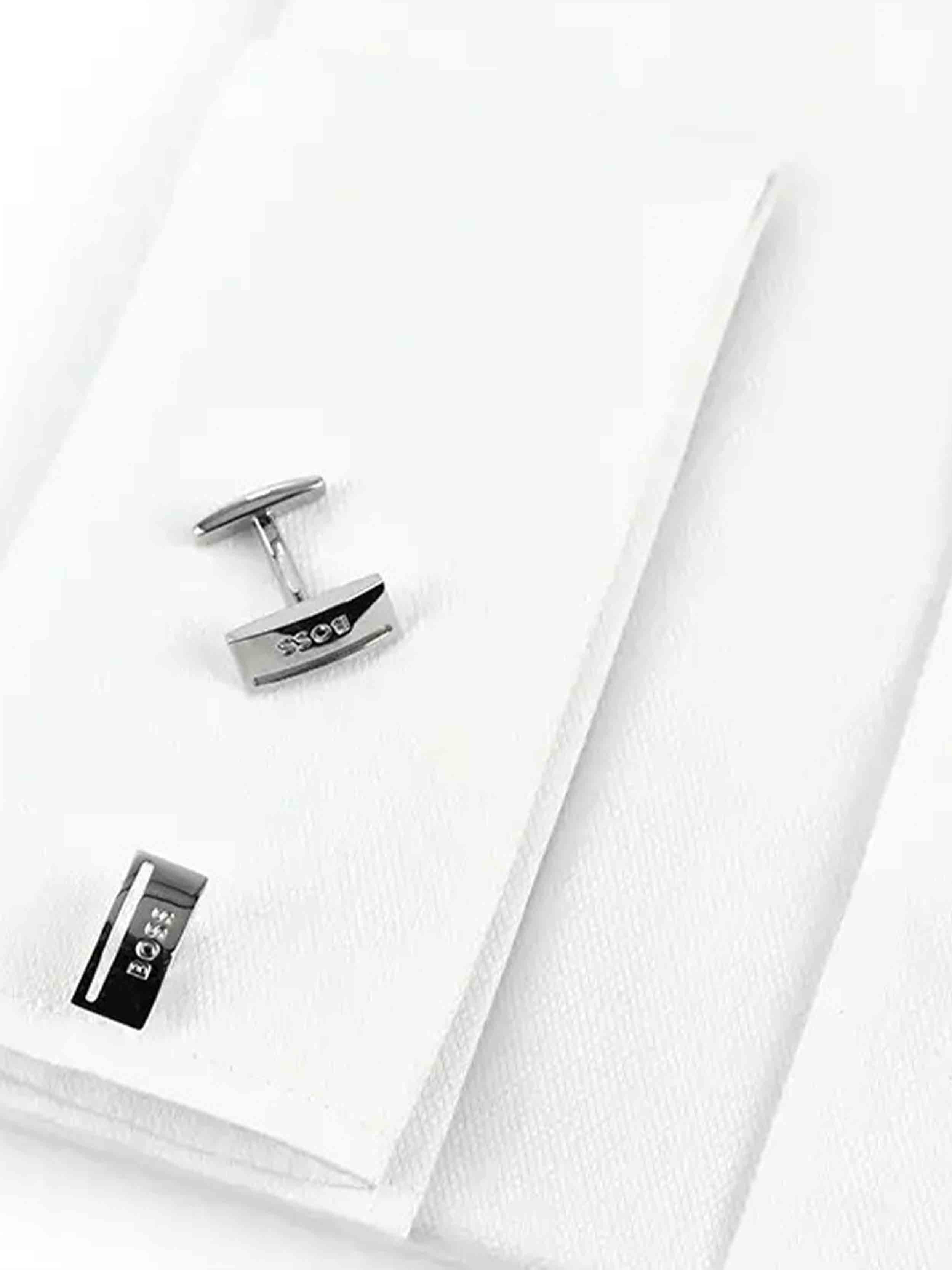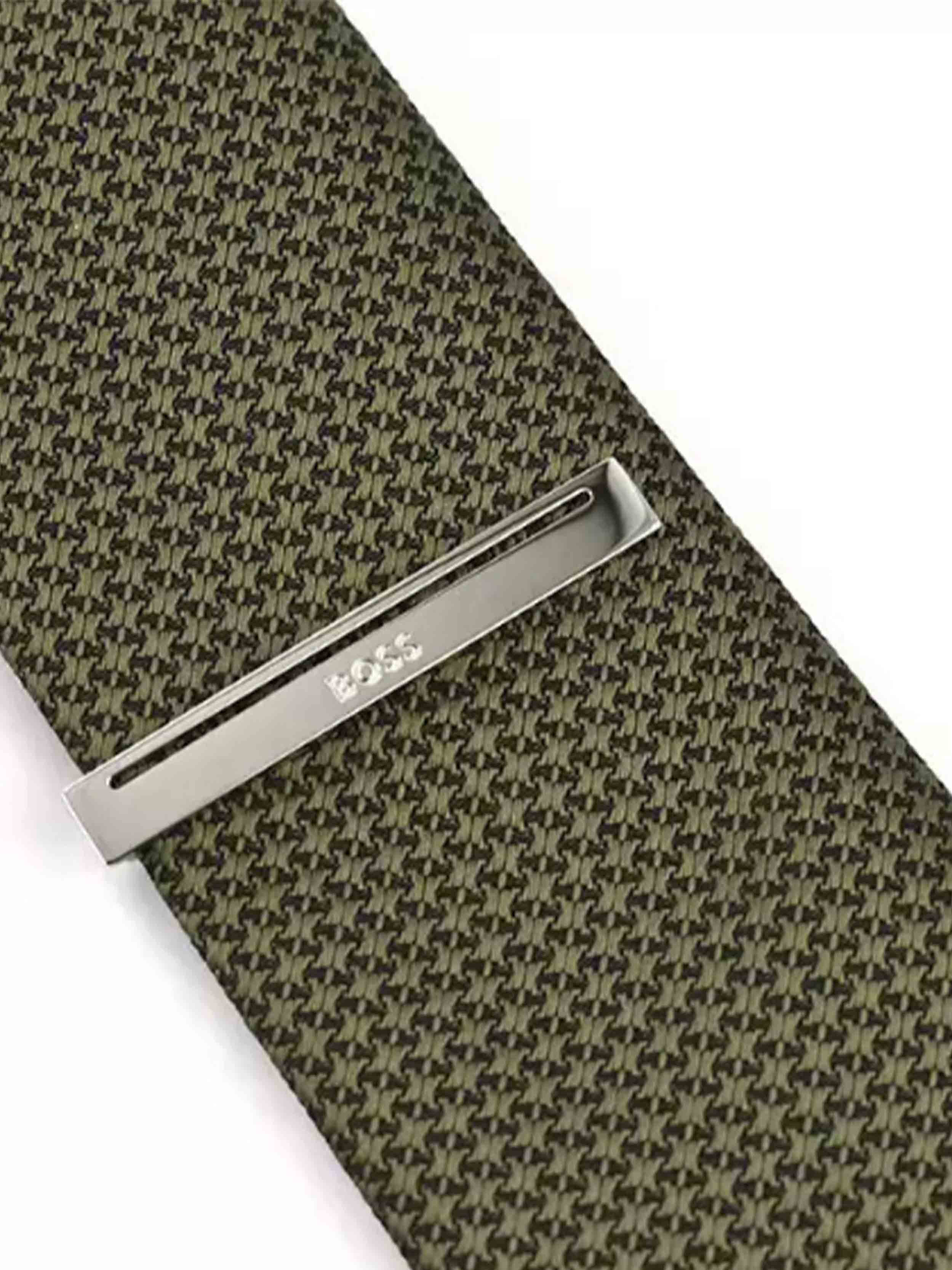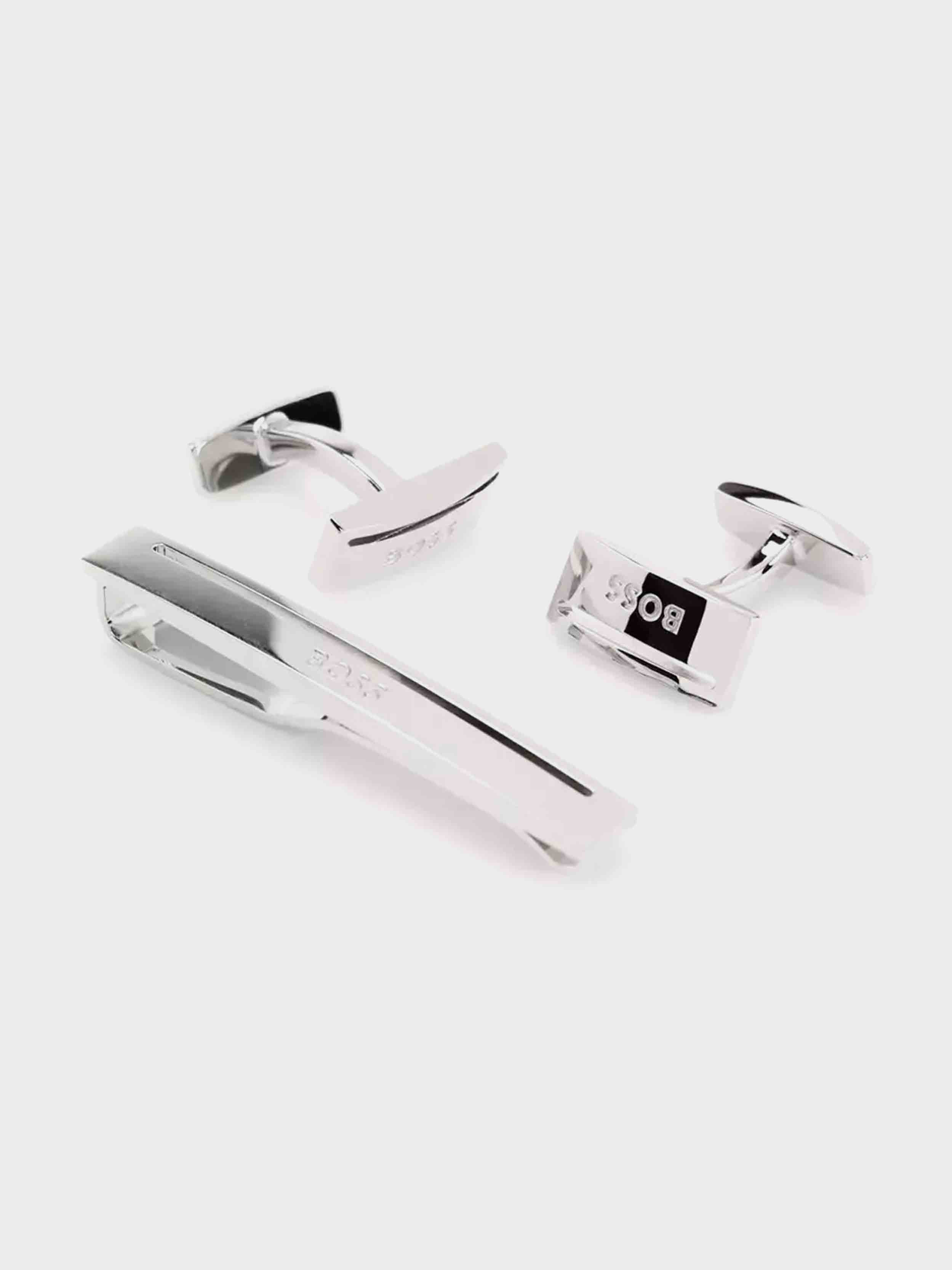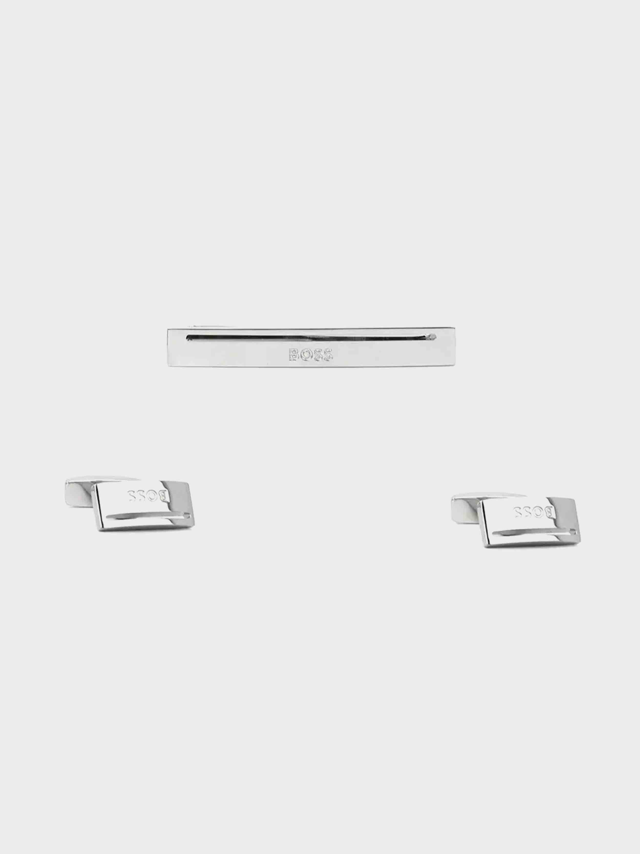 • Modern coordinating cufflinks and tie clip set by BOSS Menswear. These accessories are crafted in polished brass with engraved logos. Tie clip measurements: 1.8 x 0.8cm