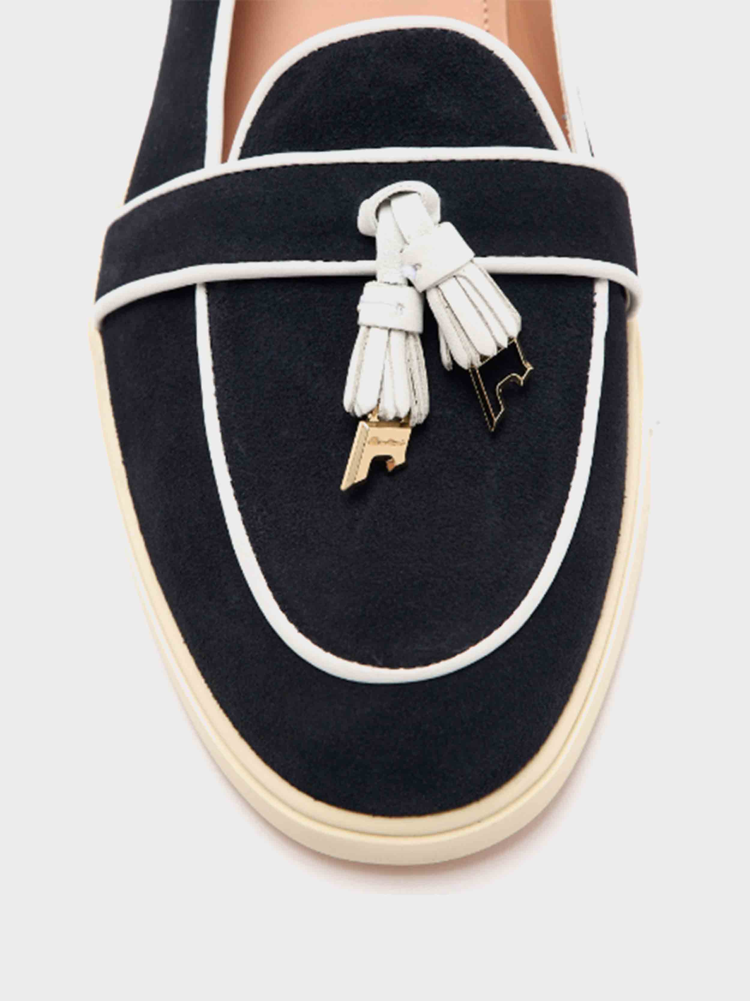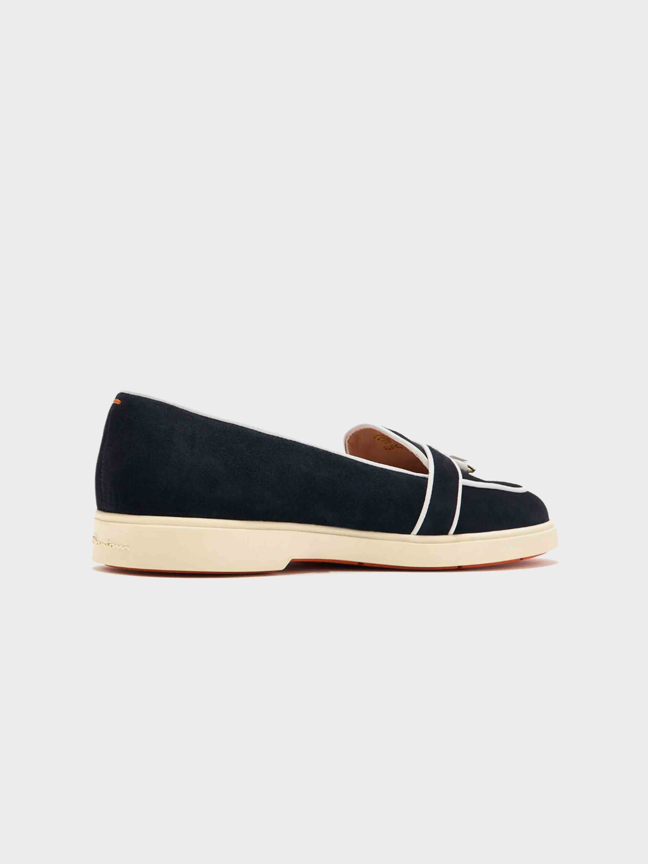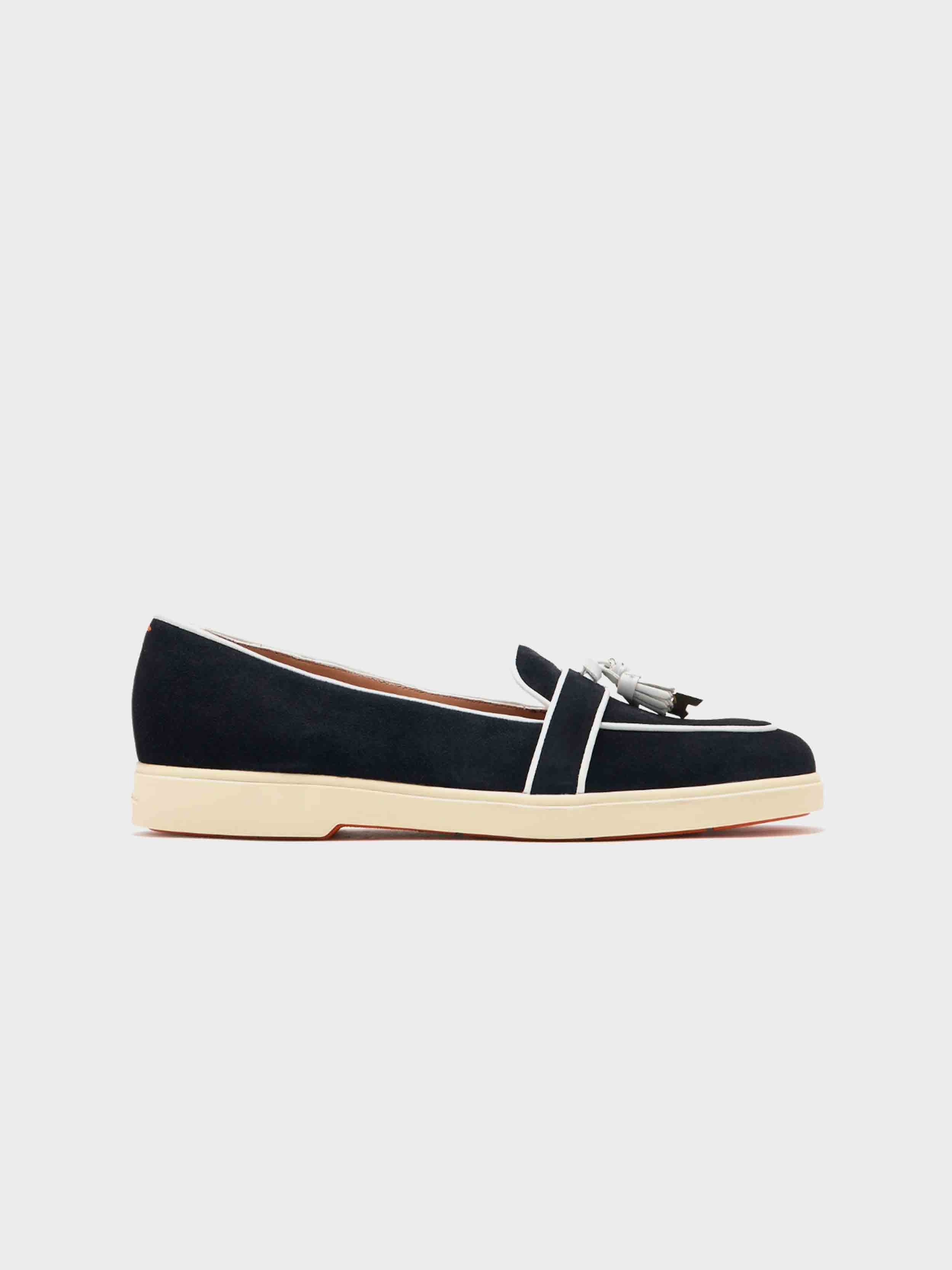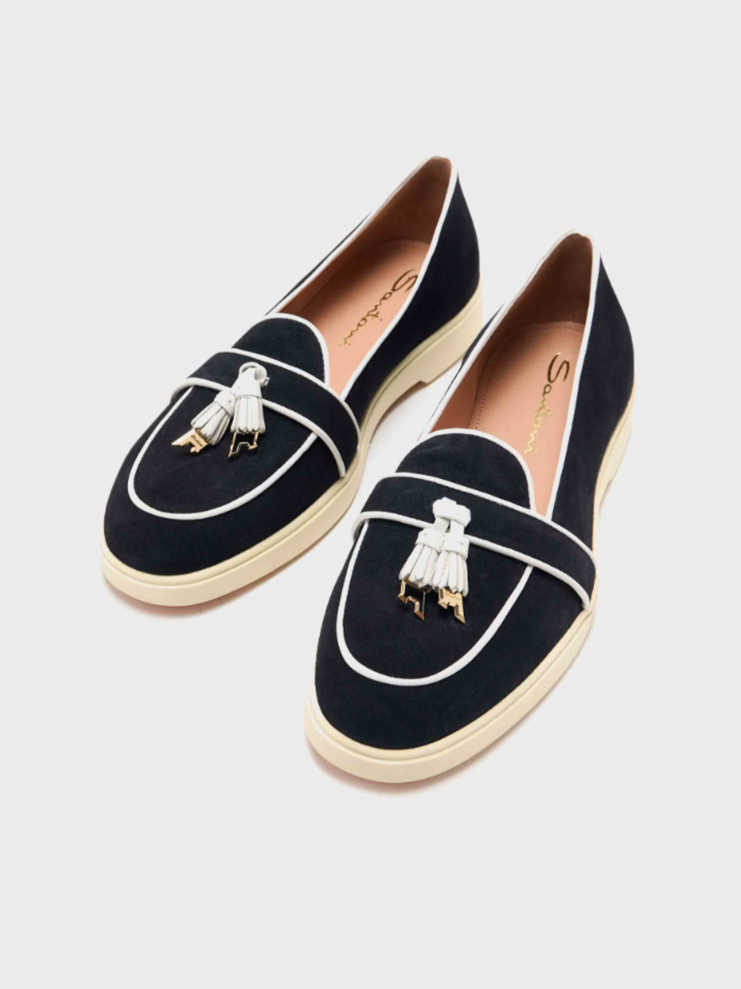 • The Santoni Riviera loafers offer a refined blend of style and comfort. Featuring contrast leather piping and playful tassel accents, these loafers are designed with a flat heel and a round moc toe for a classic silhouette. Finished with a durable rubber outsole, these loafers provide both elegance and practicality for any occasion.