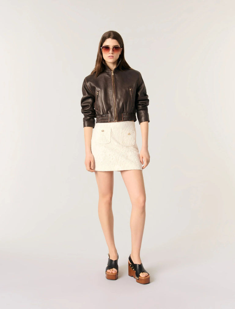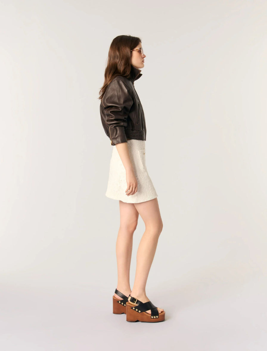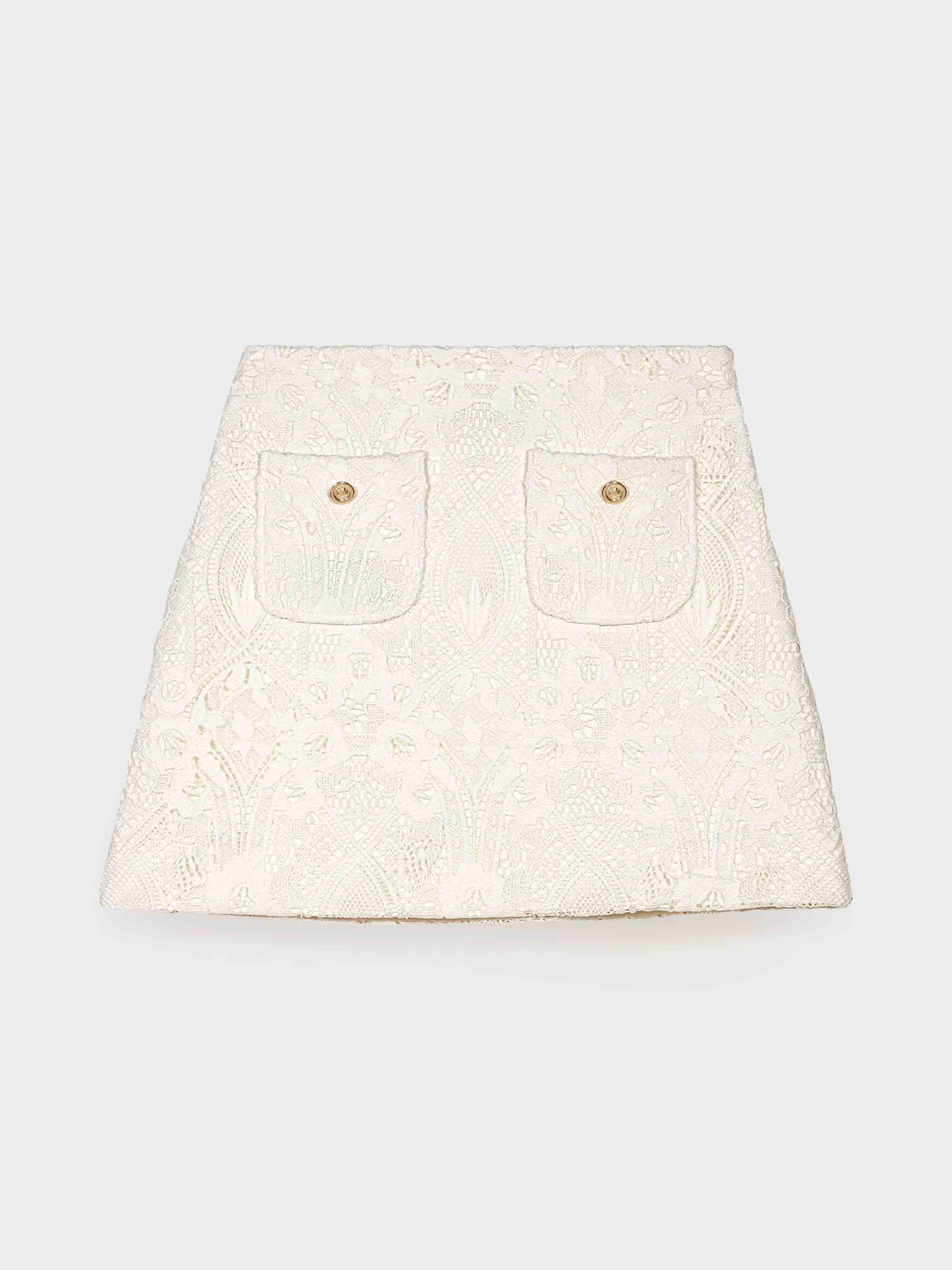 • This short skirt, with its romantic accents, is embellished with openwork guipure lace motifs. Lined for extra comfort, it has two patch pockets embellished with gold buttons.