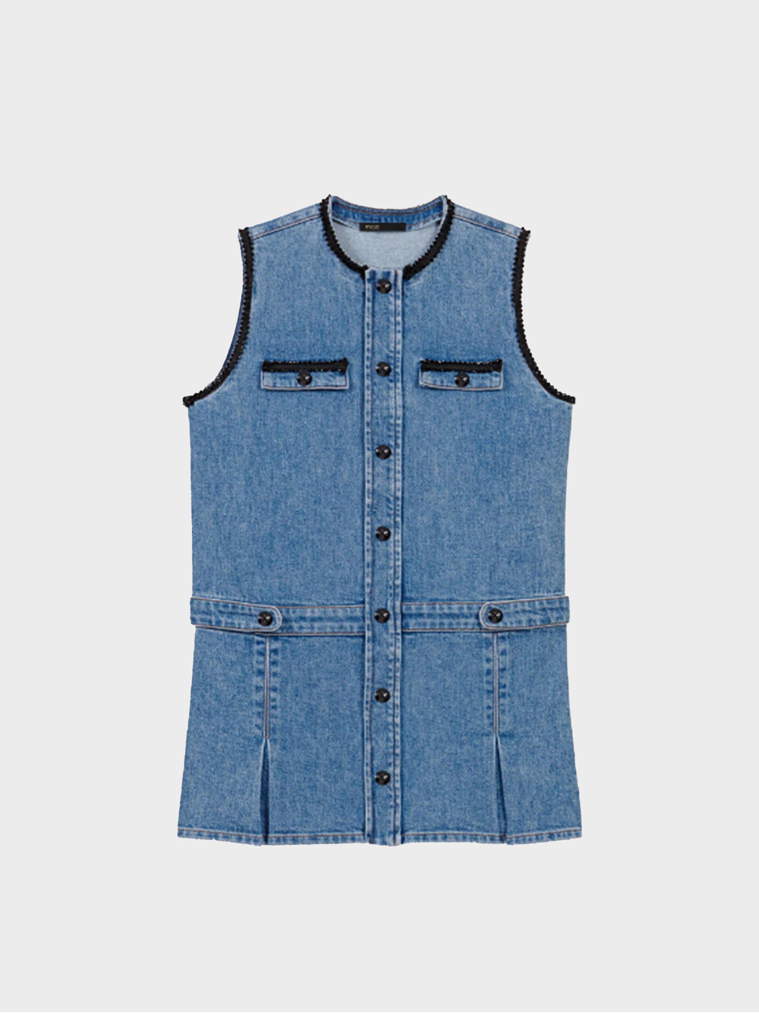 • This short sleeveless denim dress is embellished with a beaded trim. A button fastening and two chest pockets accentuate the straight cut. The skirt features straps and side slits.