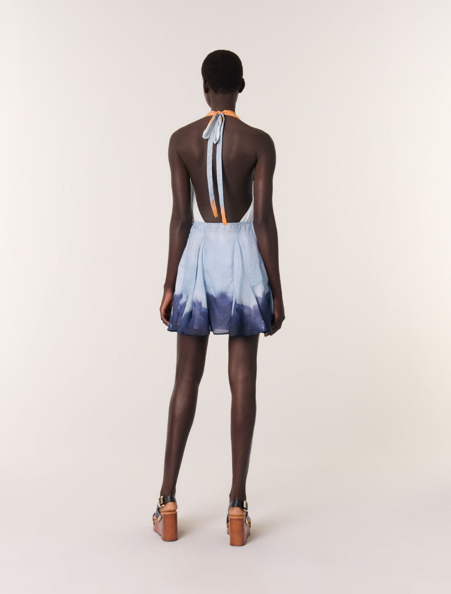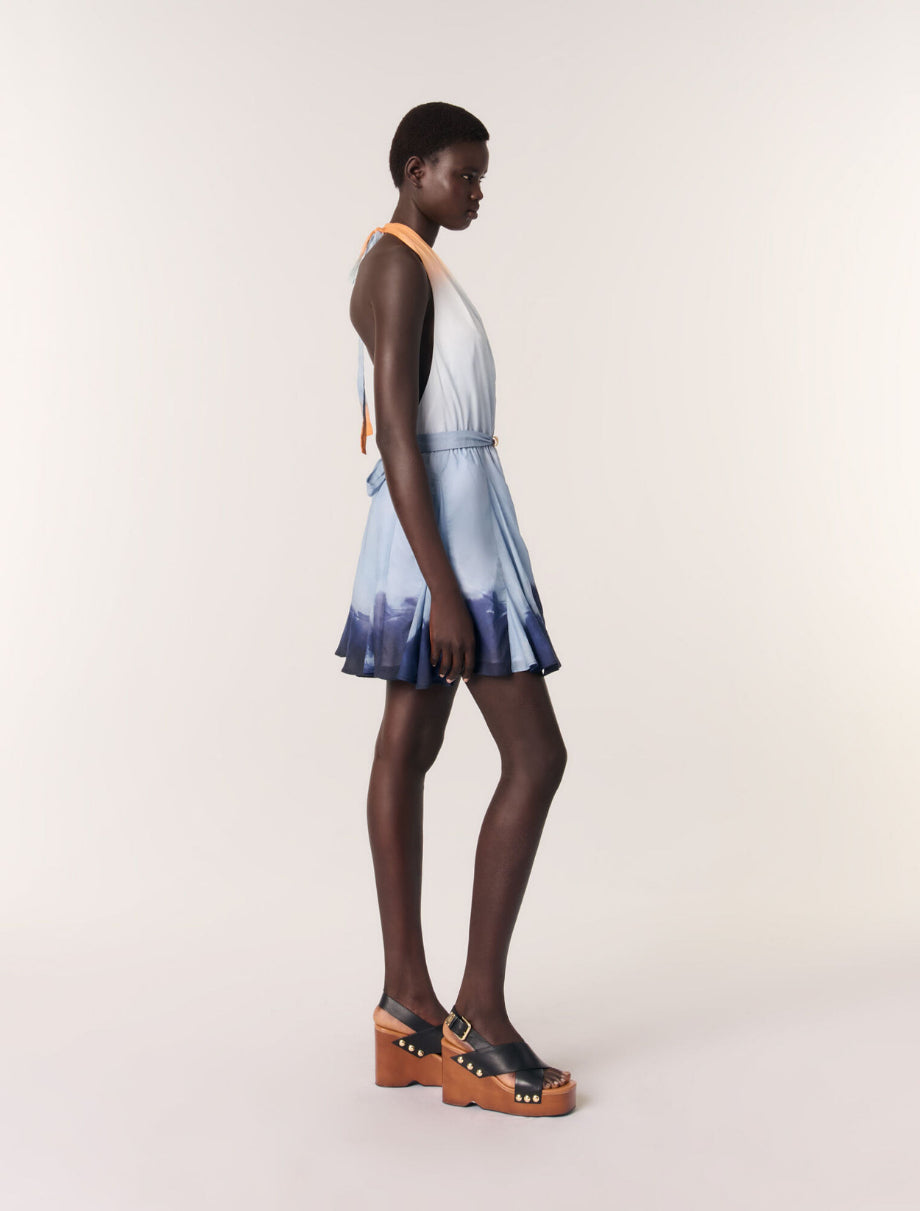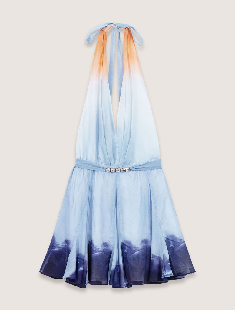 • This short dress features a tie-dye print, evoking the soft hues of a sunset. The plunging neckline and backless design with ties show off a glimpse of the skin, while the flared, ruffled skirt creates a dainty, rippling movement.