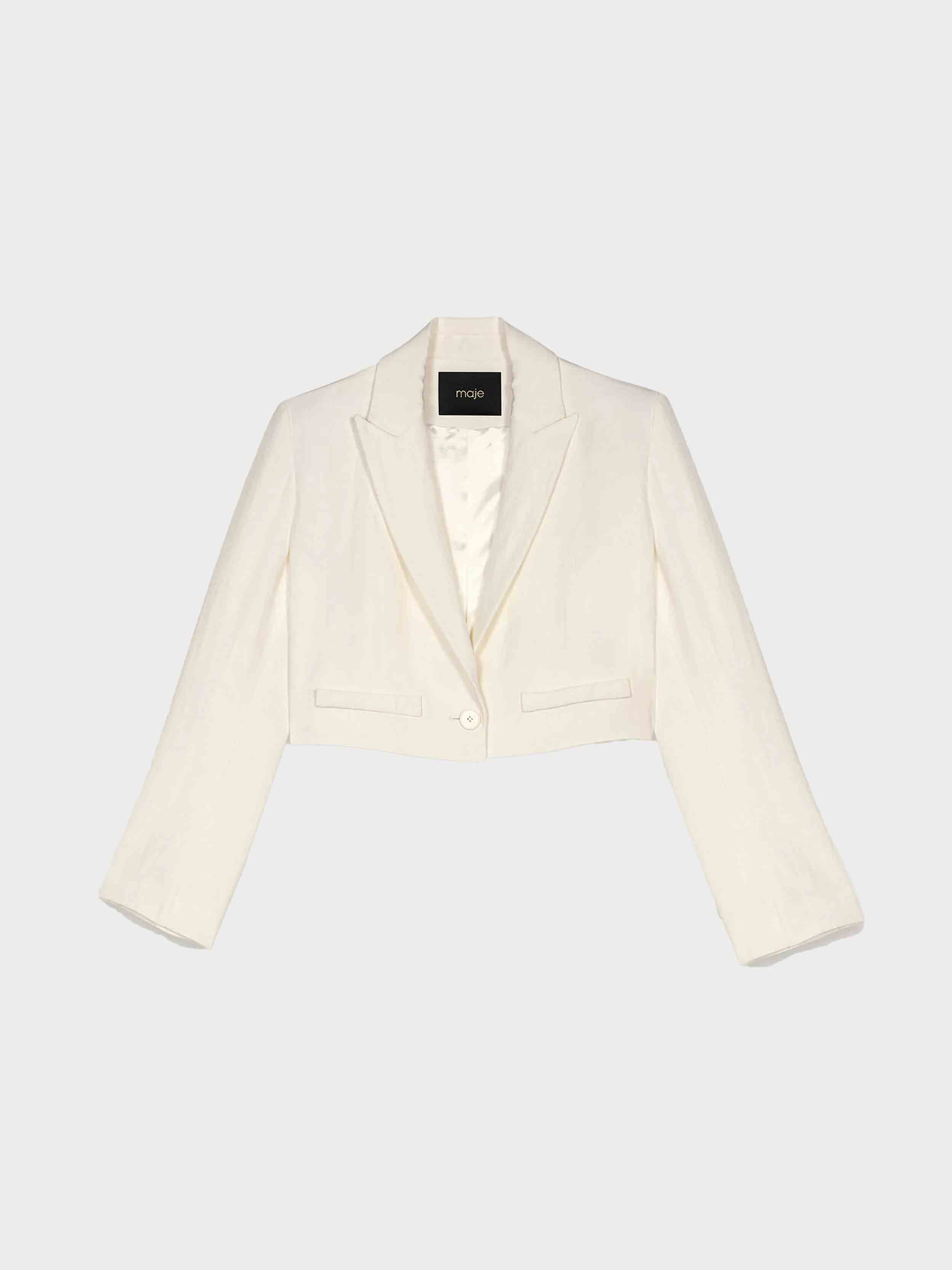 • Maje reveals a new take on the timeless suit jacket with a cropped cut. A button fastening and two welt pockets accentuate the waist, while a satin lining finishes off this elegant piece.