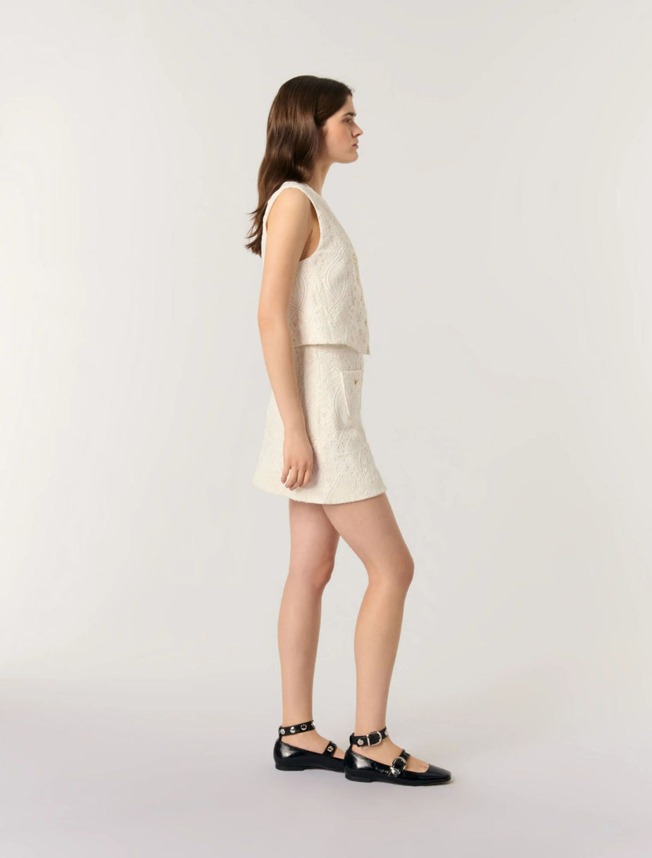 • Made from lace, this jacket features a V-neckline and metal button fastening. An elegant and versatile piece, it can be worn as a head-to-toe outfit with a matching skirt and ballet flats.