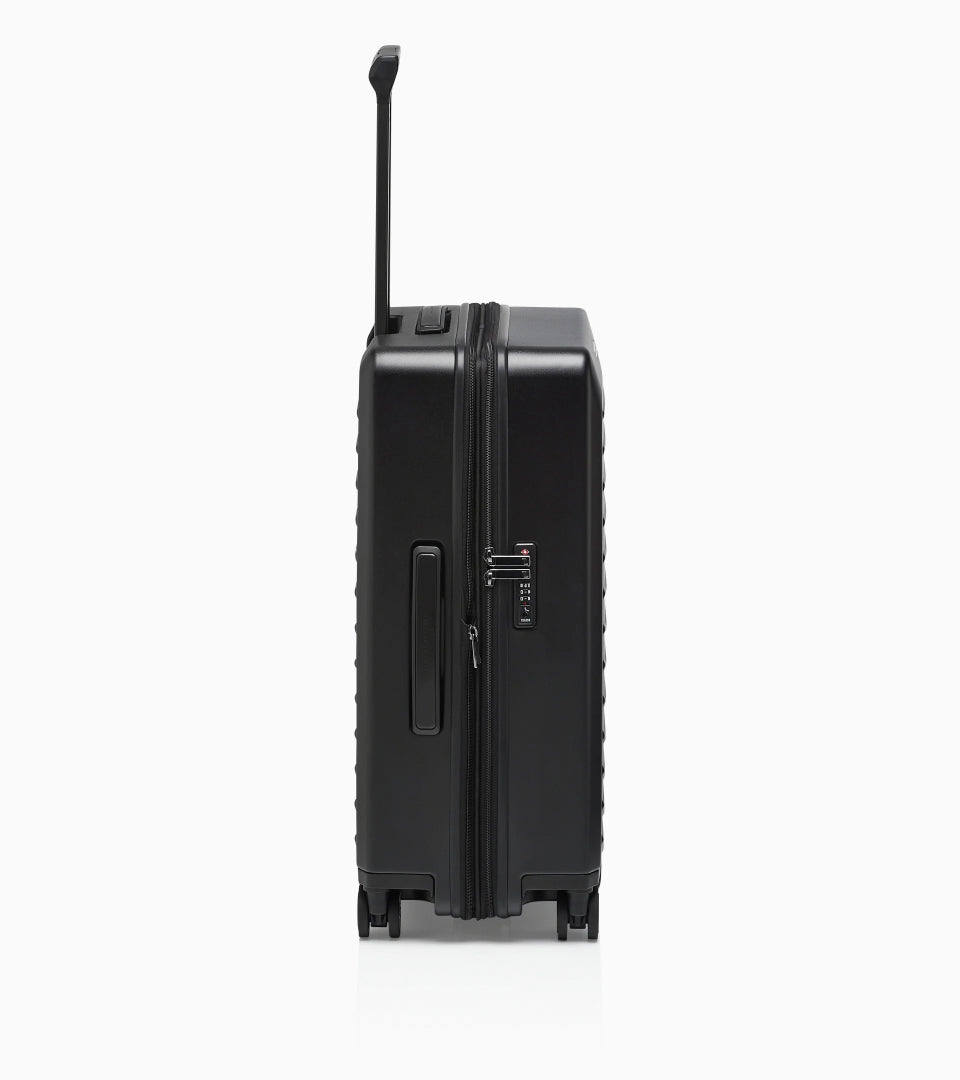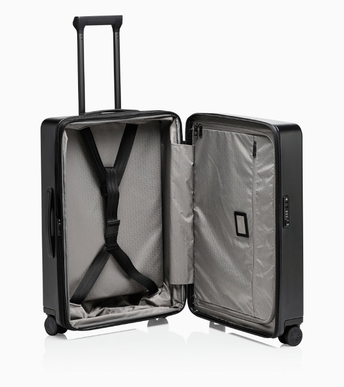 • Porsche is the perfect fusion of form, function and design. The medium Porsche Design Roadster Hardcase 4W Business Trolley L catches the eye with a weight of just 4.1 kg and its dynamic monochrome look with Porsche signature details. Ball-bearing-mounted, smooth-rolling wheels in the style of the Porsche Taycan rims and an ergonomic multi-height handle ensure optimum performance. Bags can be effortlessly placed and removed over the rounded edges of the handle. The divided interior is also flexible—and can easily be expanded at any time. An ultra-secure two-way zipper and a TSA-approved lock protect your luggage.