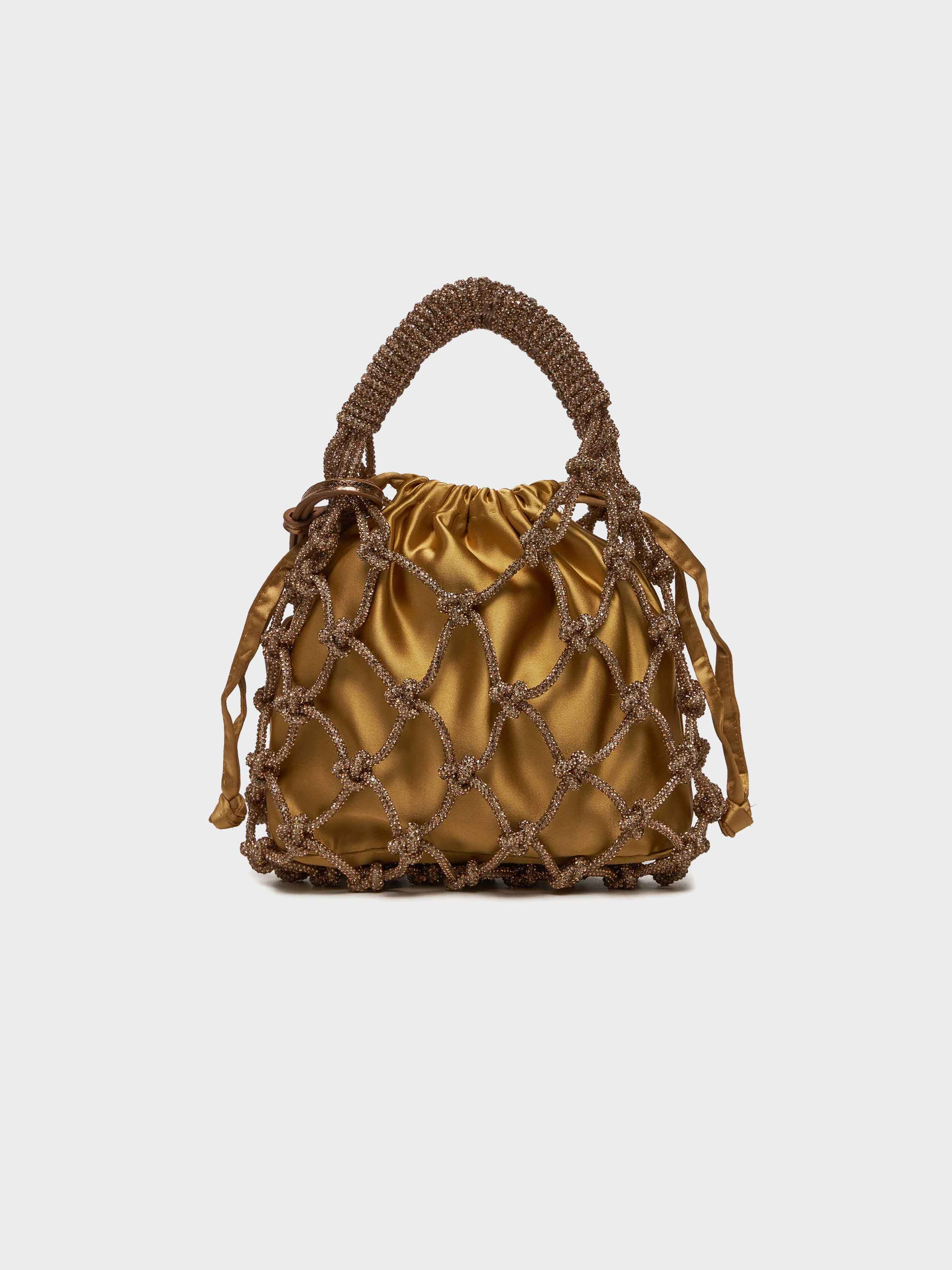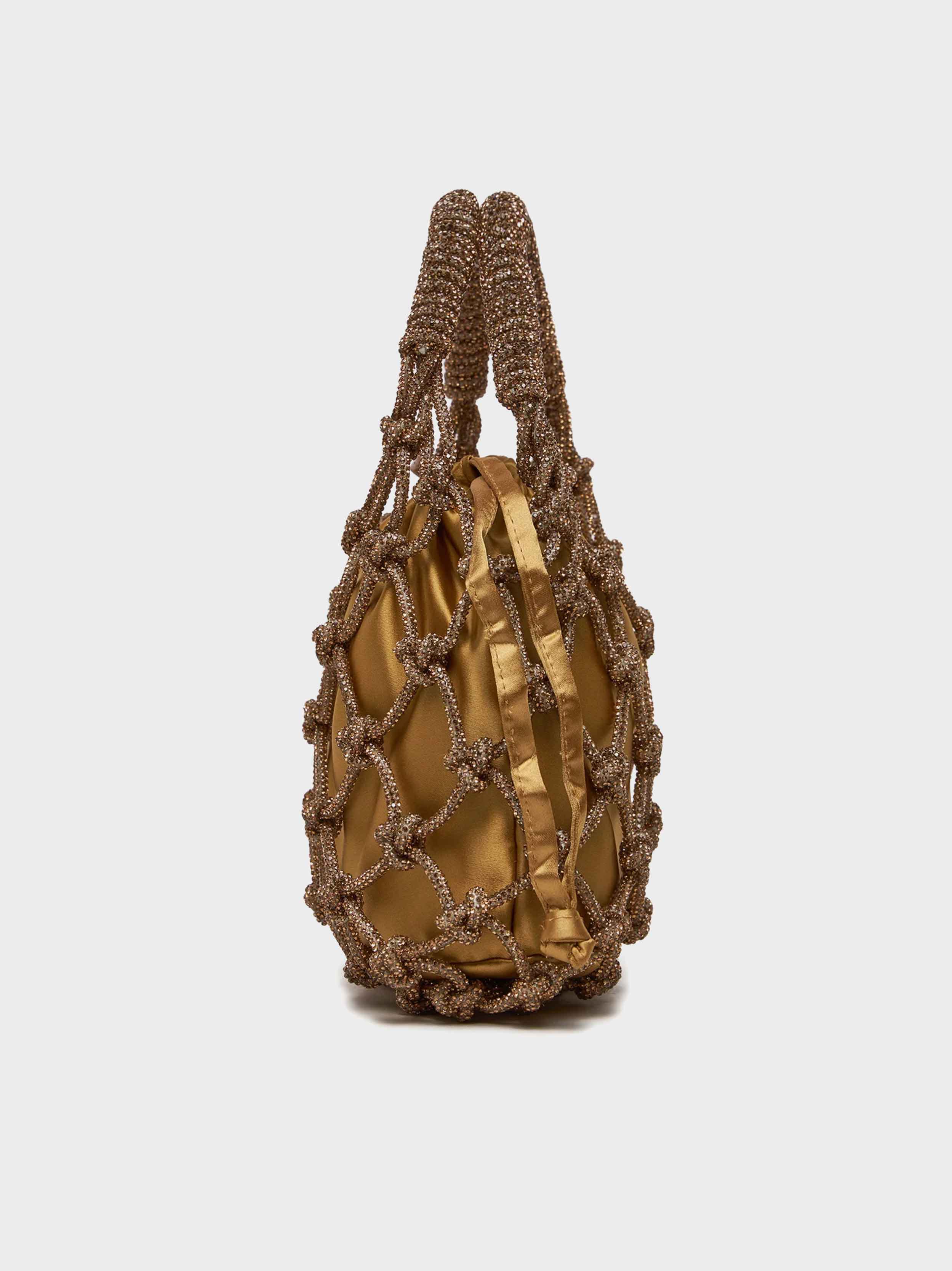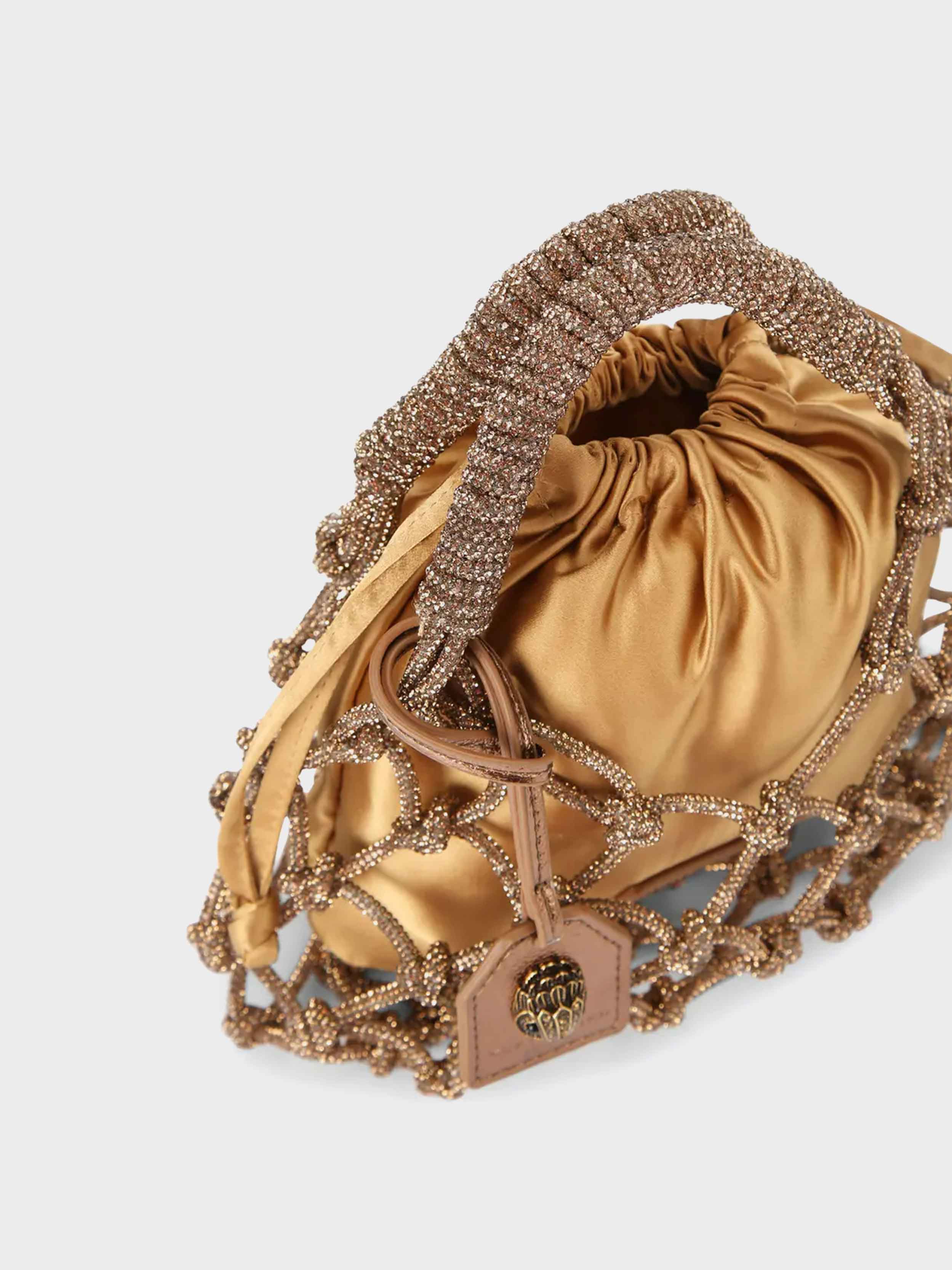• This Small Macrame crystal bag has a bronze crystal embellishment across the knotted structure. There is an antiqued brass eagle head on the luggage tag.
