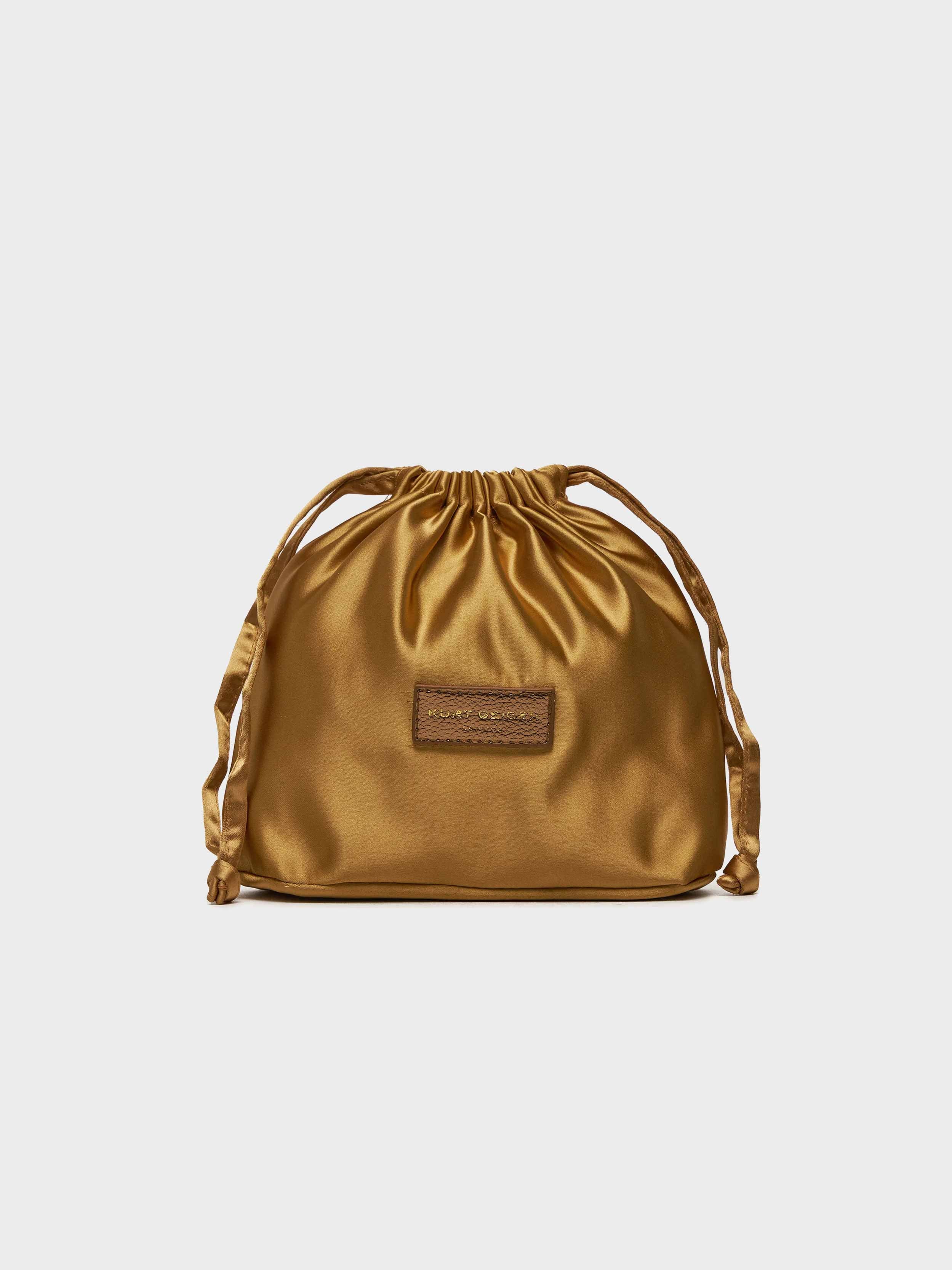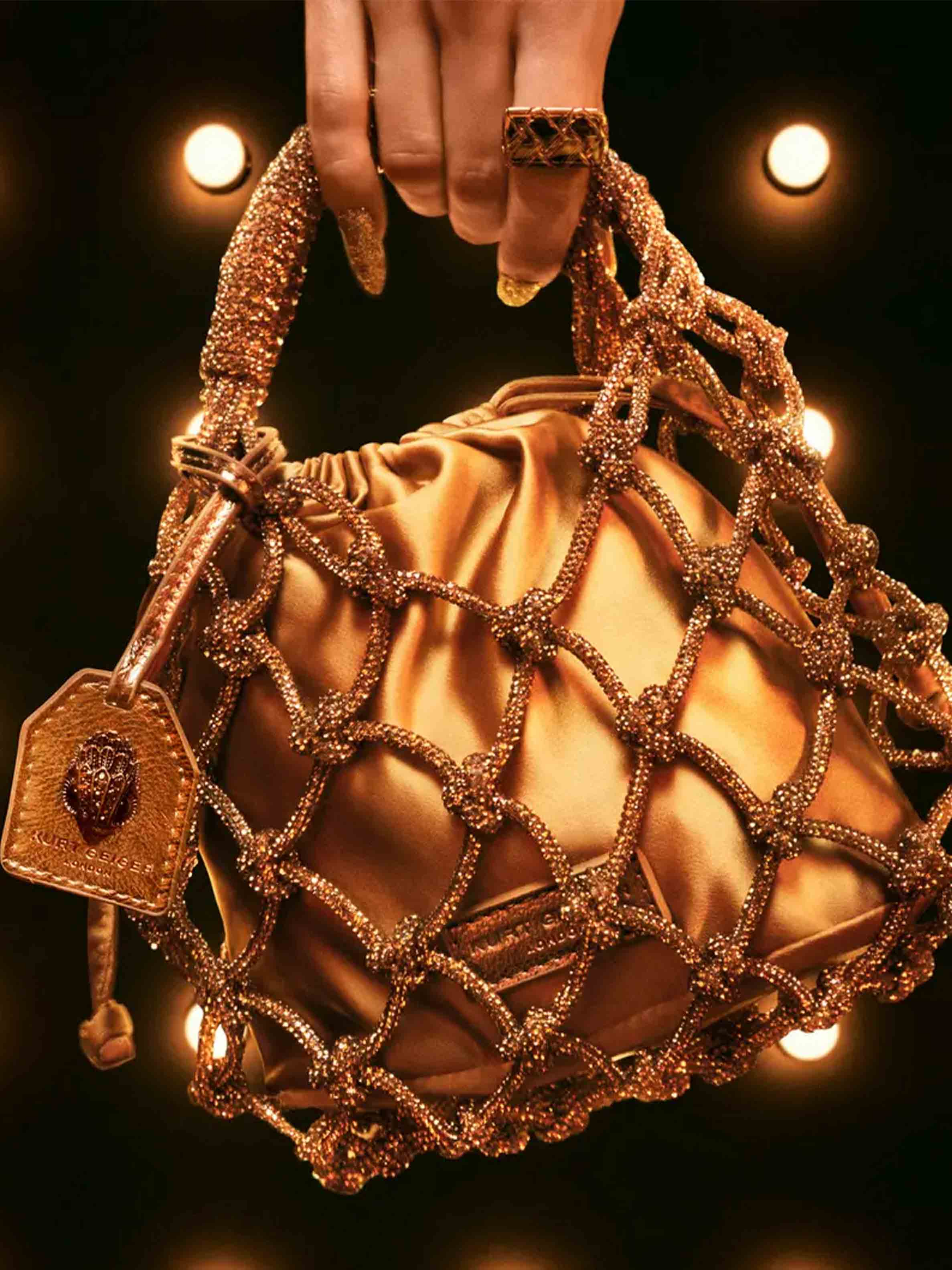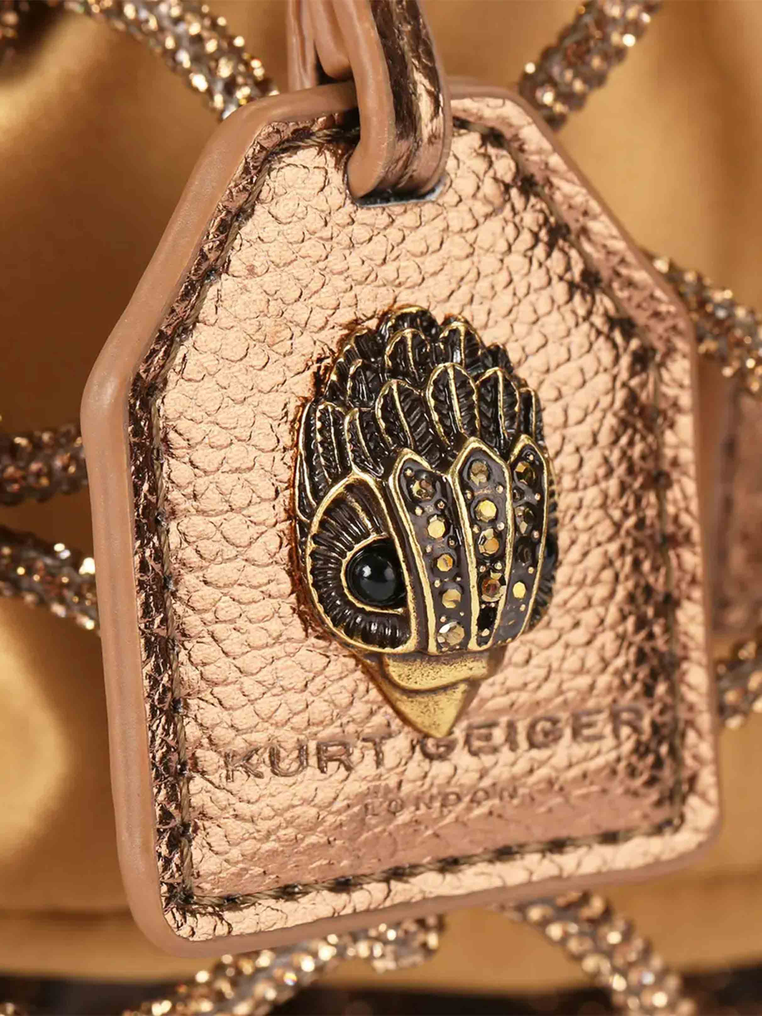 • This Small Macrame crystal bag has a bronze crystal embellishment across the knotted structure. There is an antiqued brass eagle head on the luggage tag.