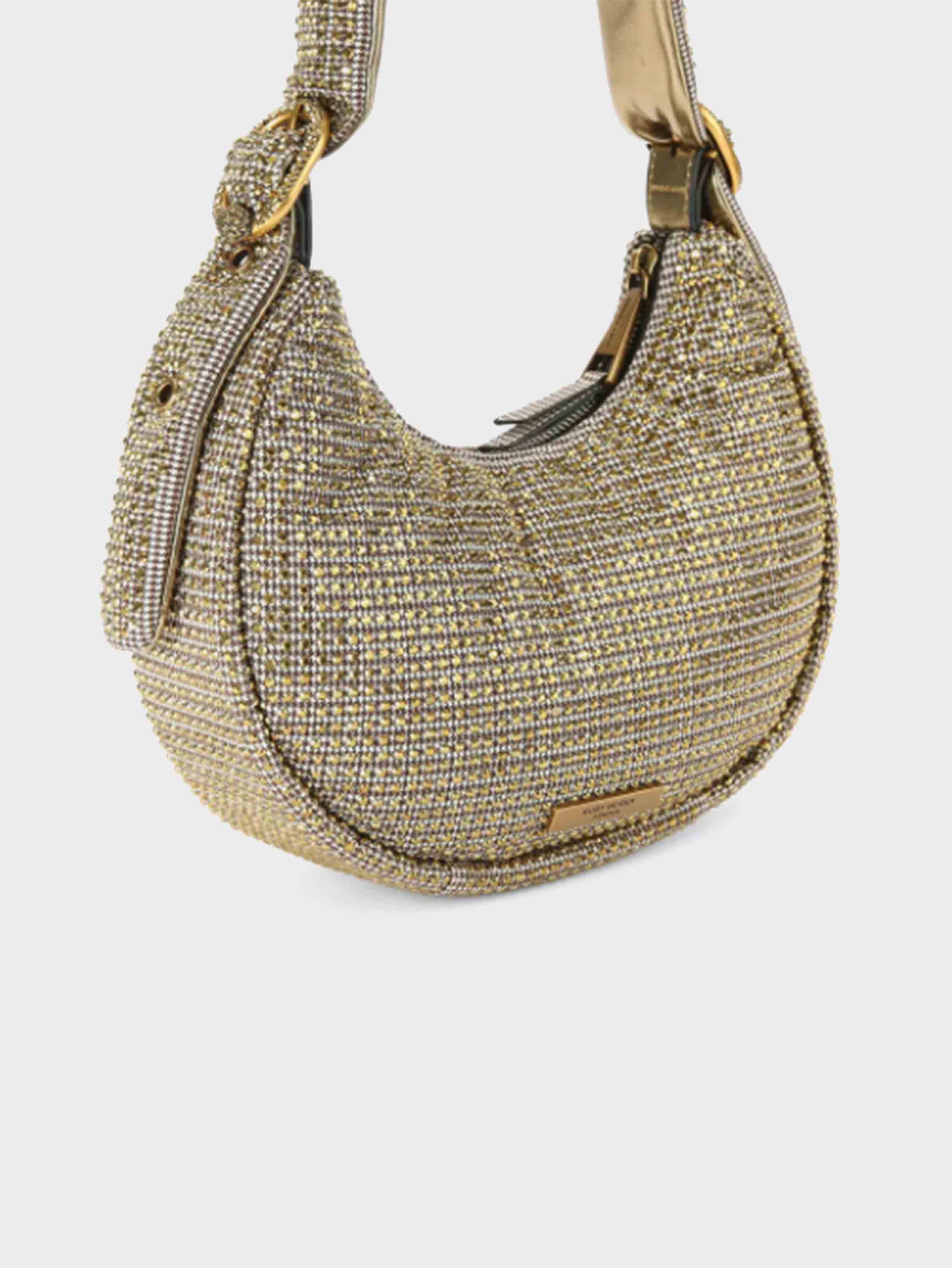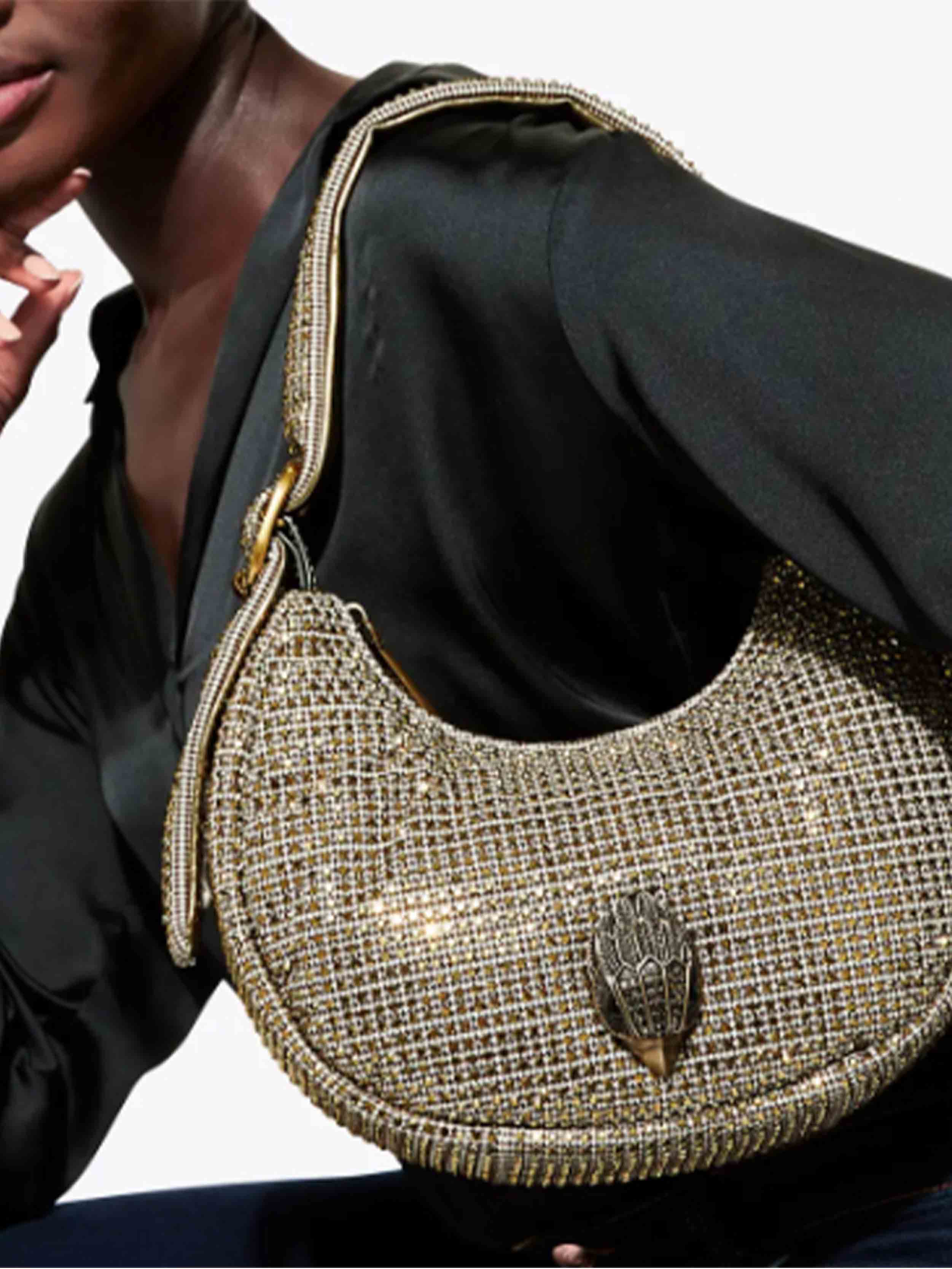 • There is a large antiqued brass eagle head with crystals sat on the front complimenting the two buckles on either side of the shoulder strap.