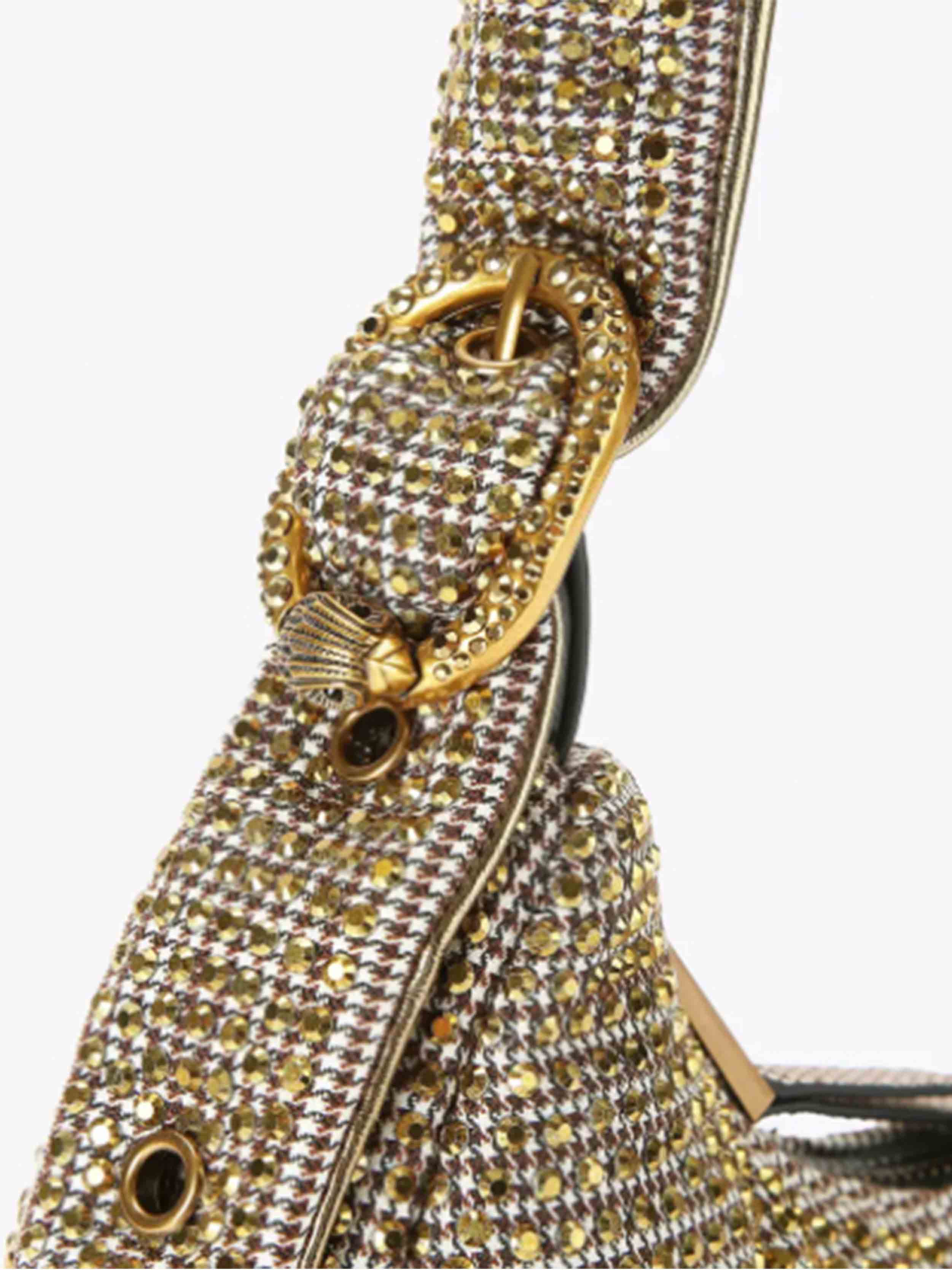 • This Small Puff Kensington bag is crafted in a beige houndstooth fabric with large gold crystals across the exterior.