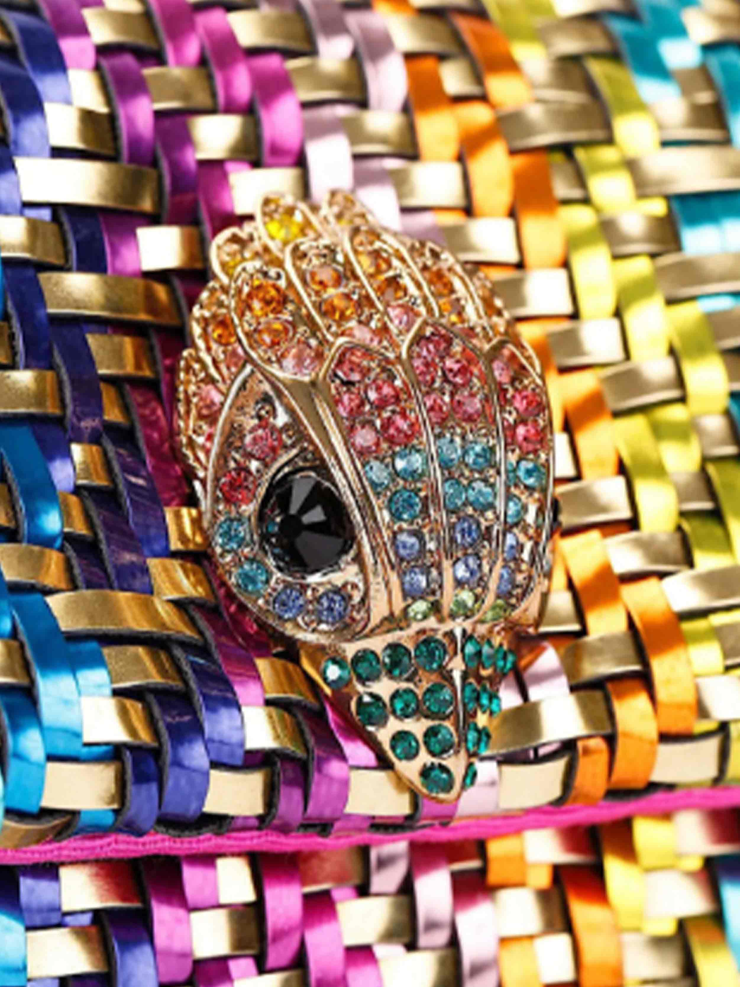 • The gold eagle head features rainbow crystals and black bead eyes on the front flap.