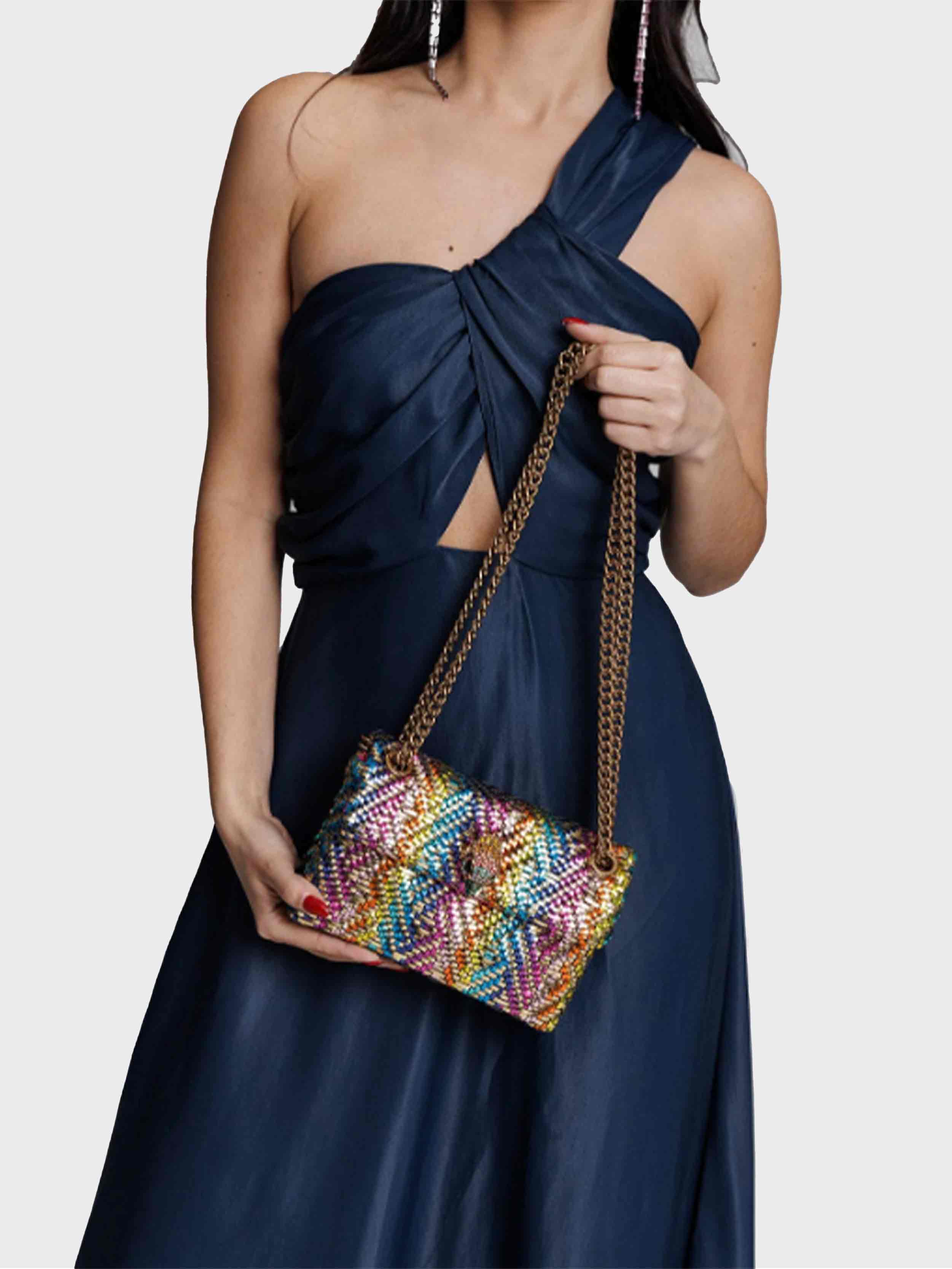 • This Kensington Bag is crafted from a light metallic woven fabric with rainbow stripe effect.