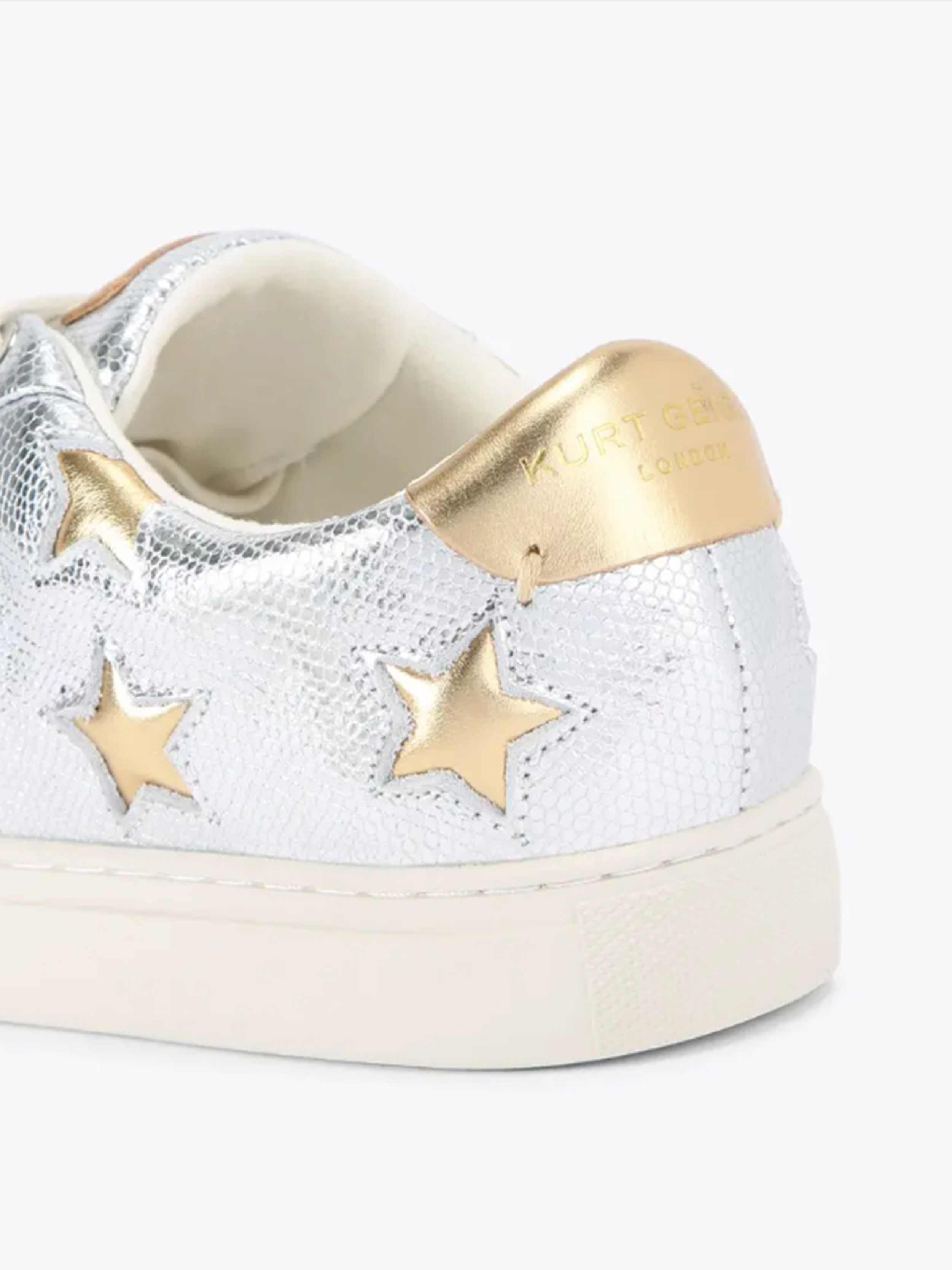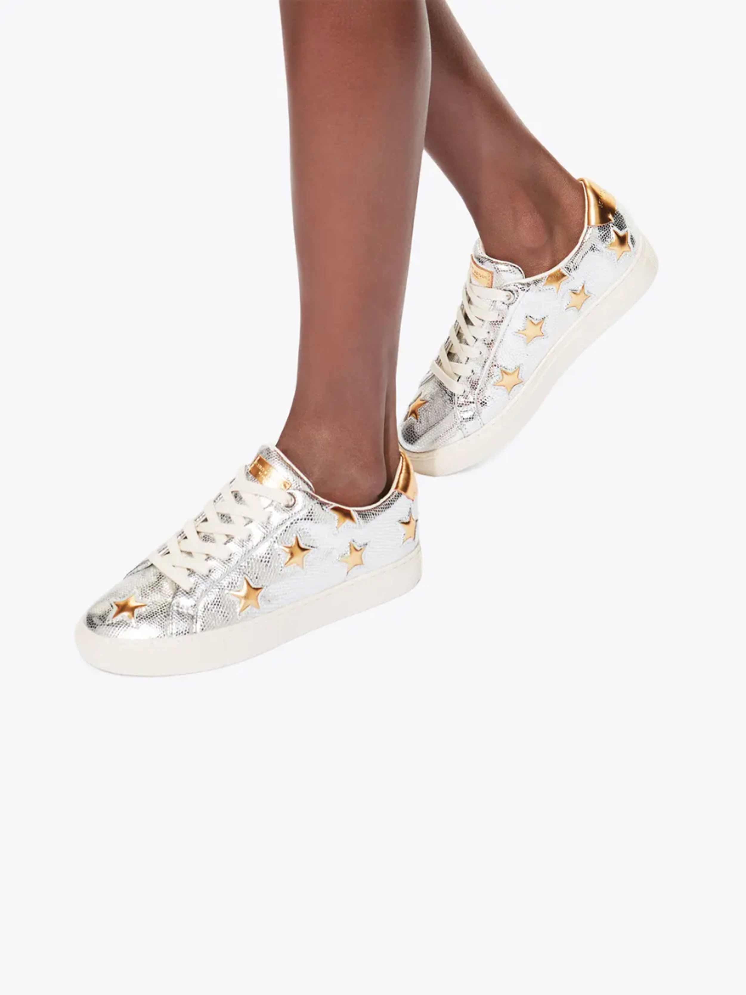 • The Lane Star sneaker is crafted from a metallic snake embossed leather with gold metallic leather cut out stars.