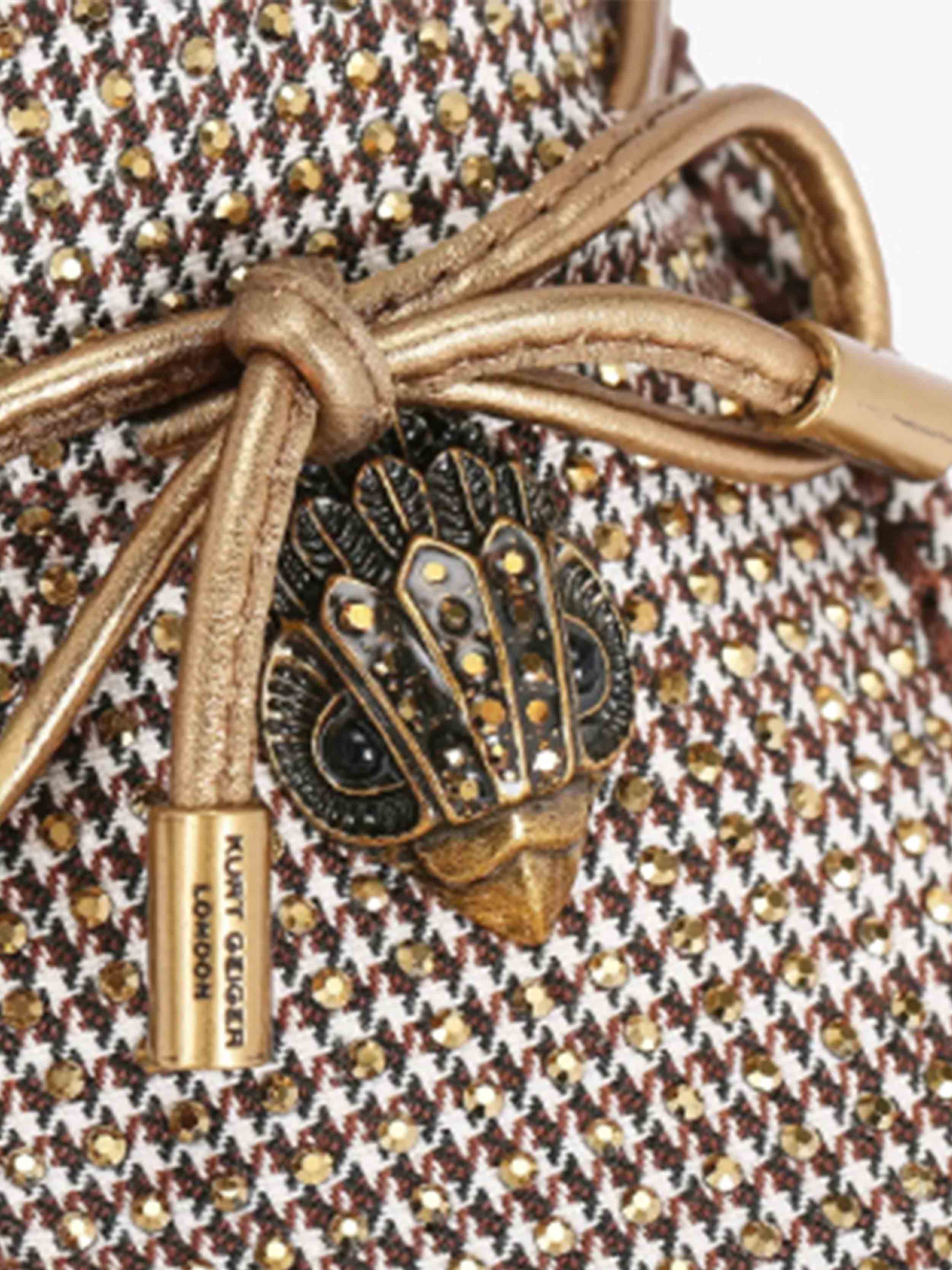• The Eagle Moccasin is crafted from a beige houndstooth fabric with bronze crystal embellishment.