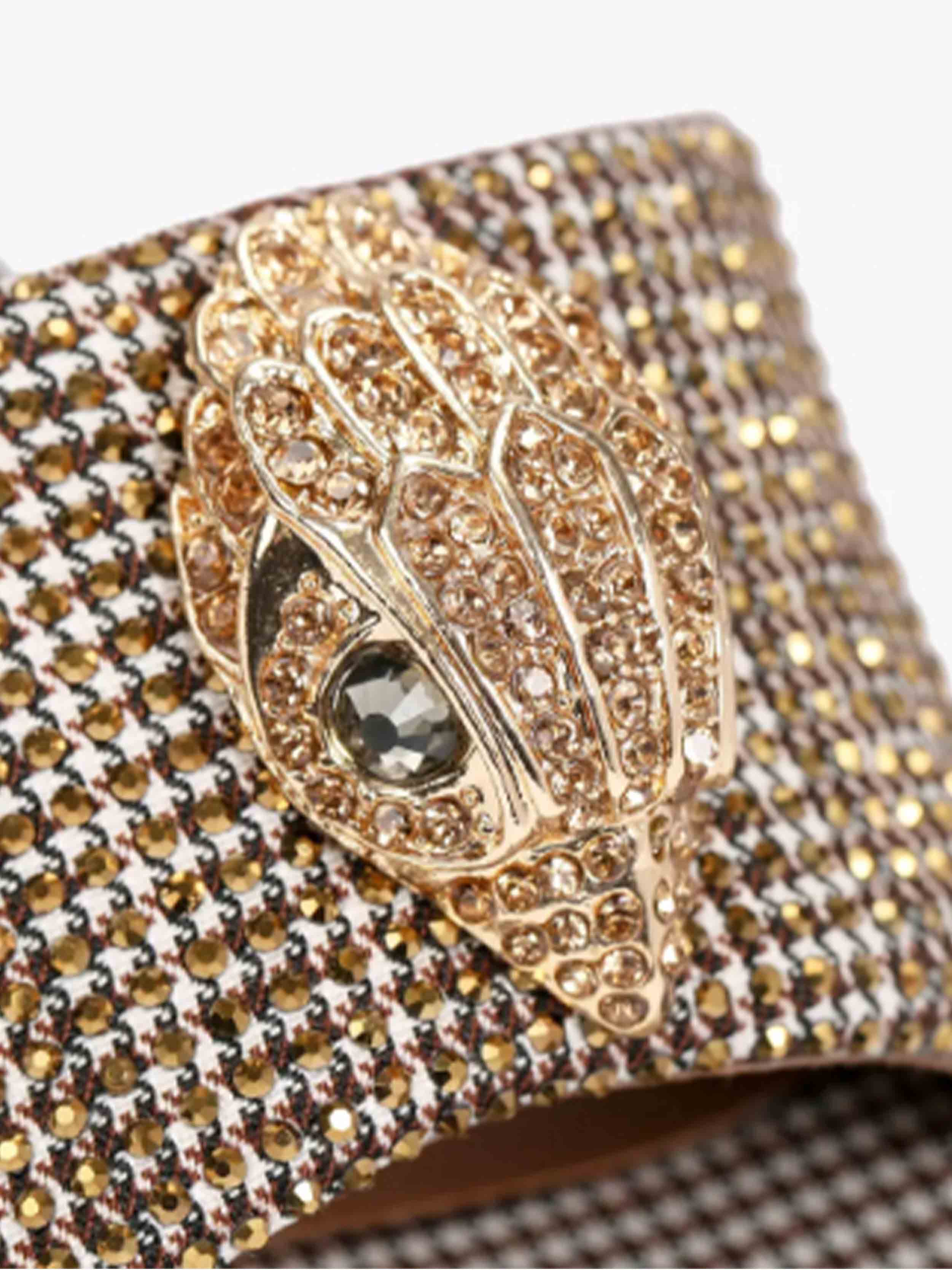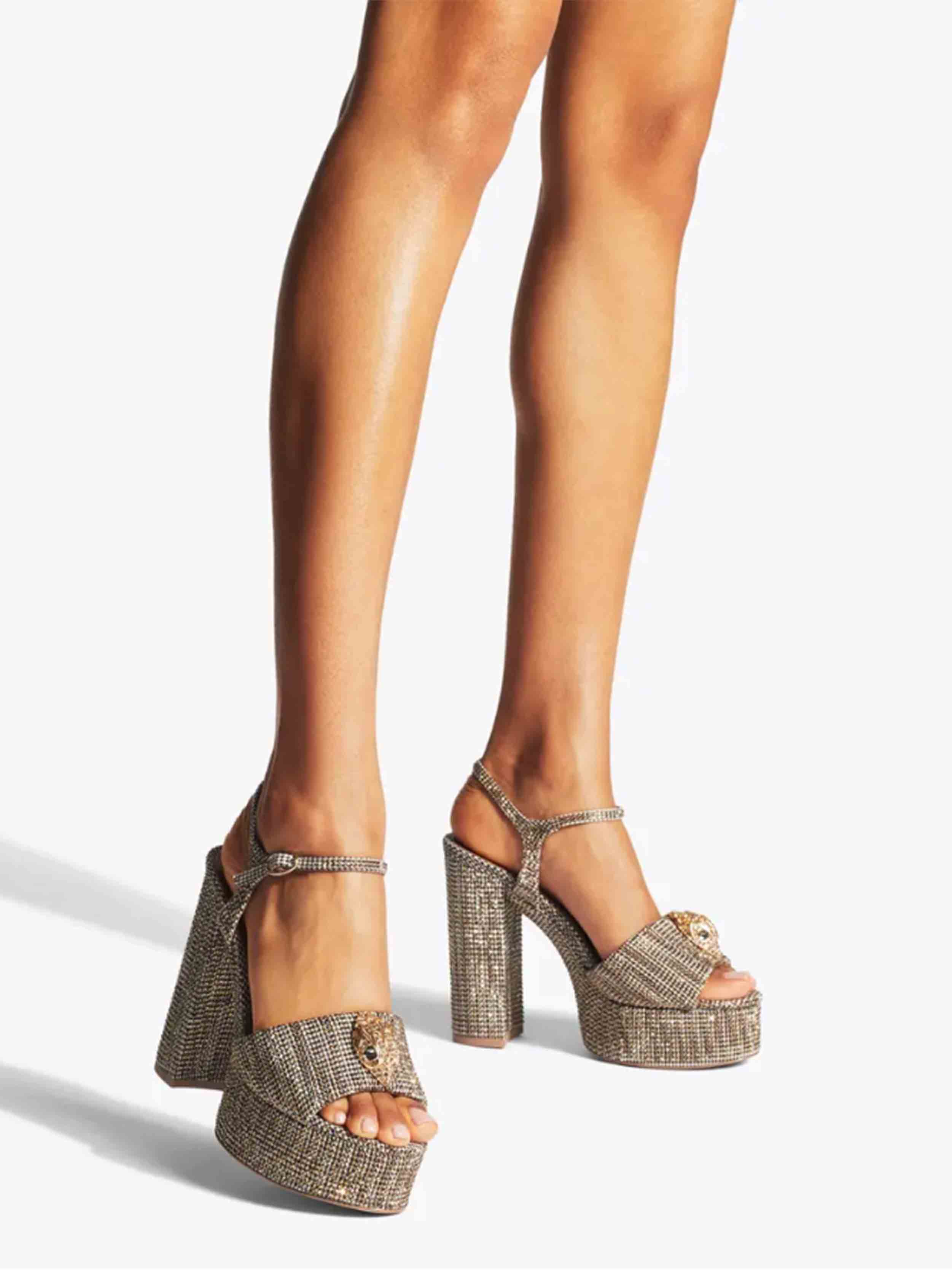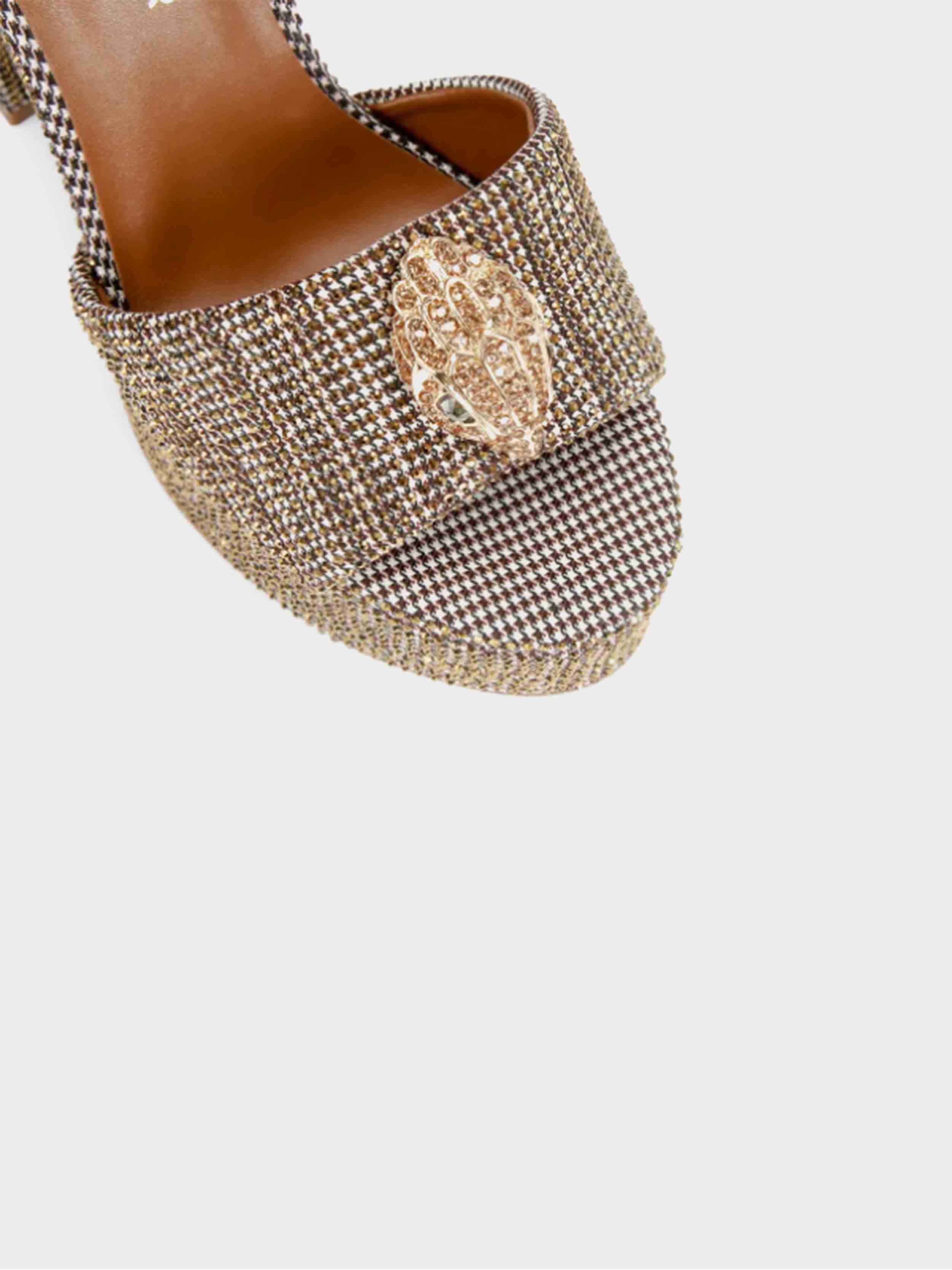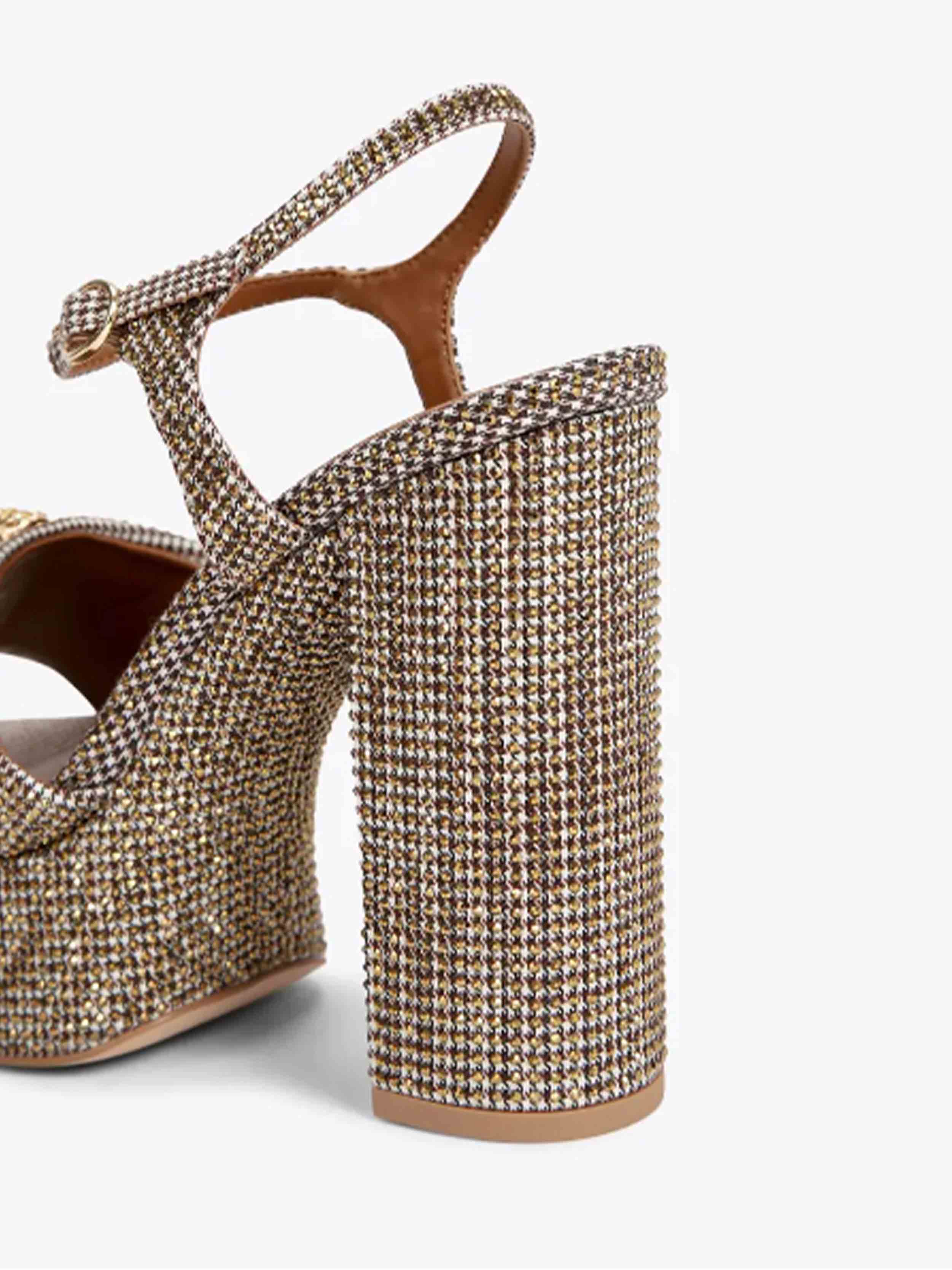 • The Kensington Platform Sandal features a houndstooth fabric upper completely embellished in crystals.