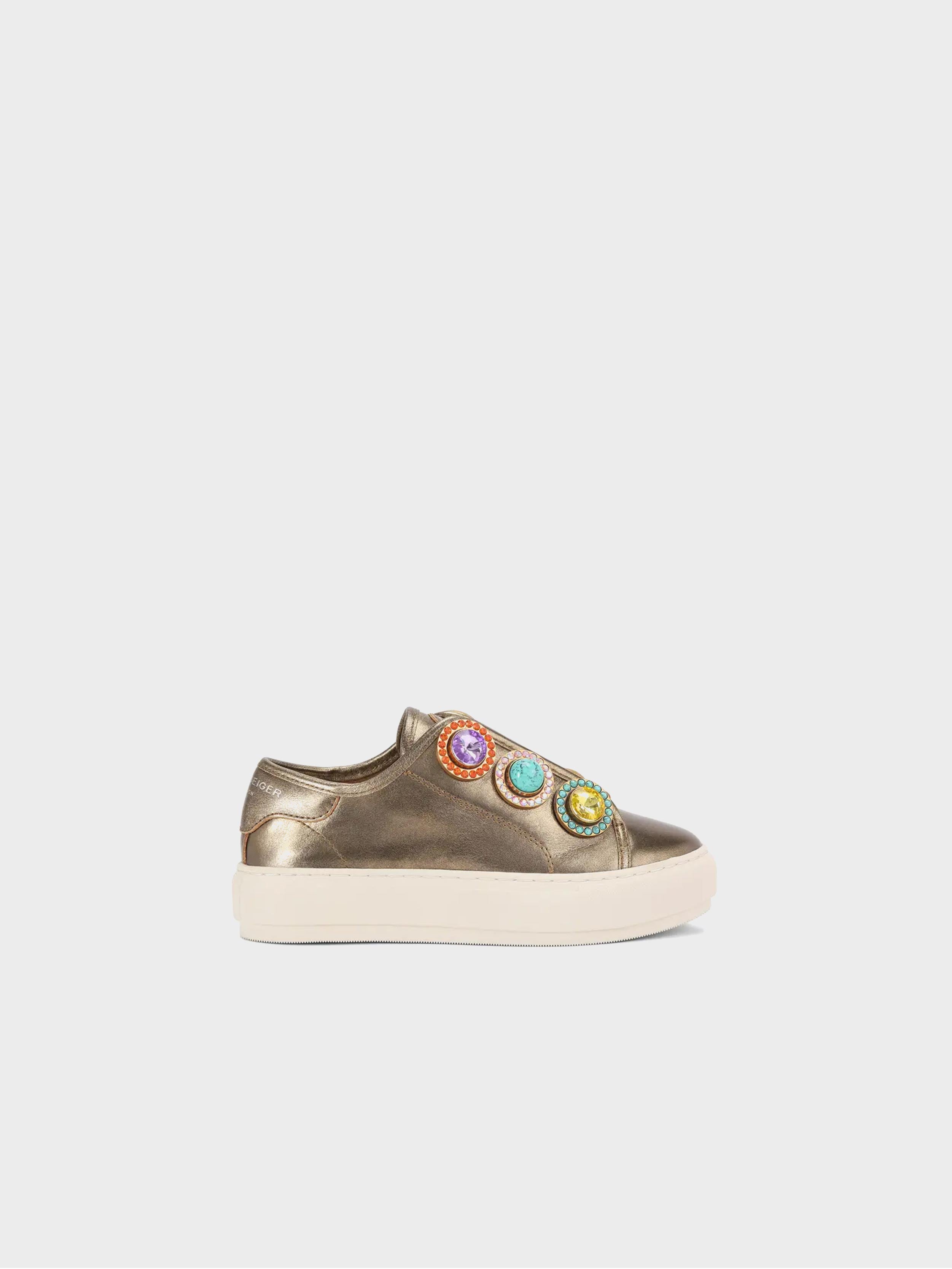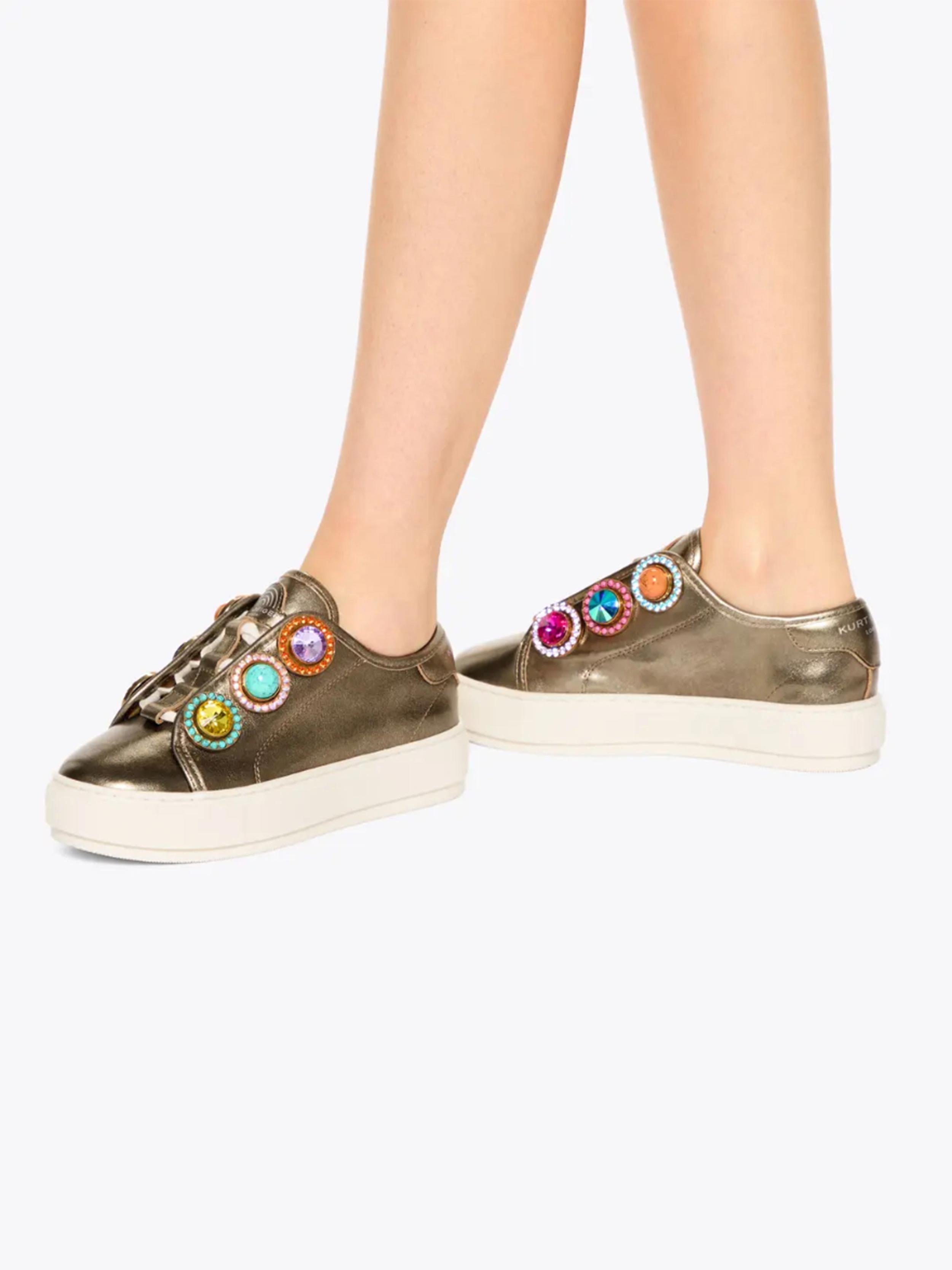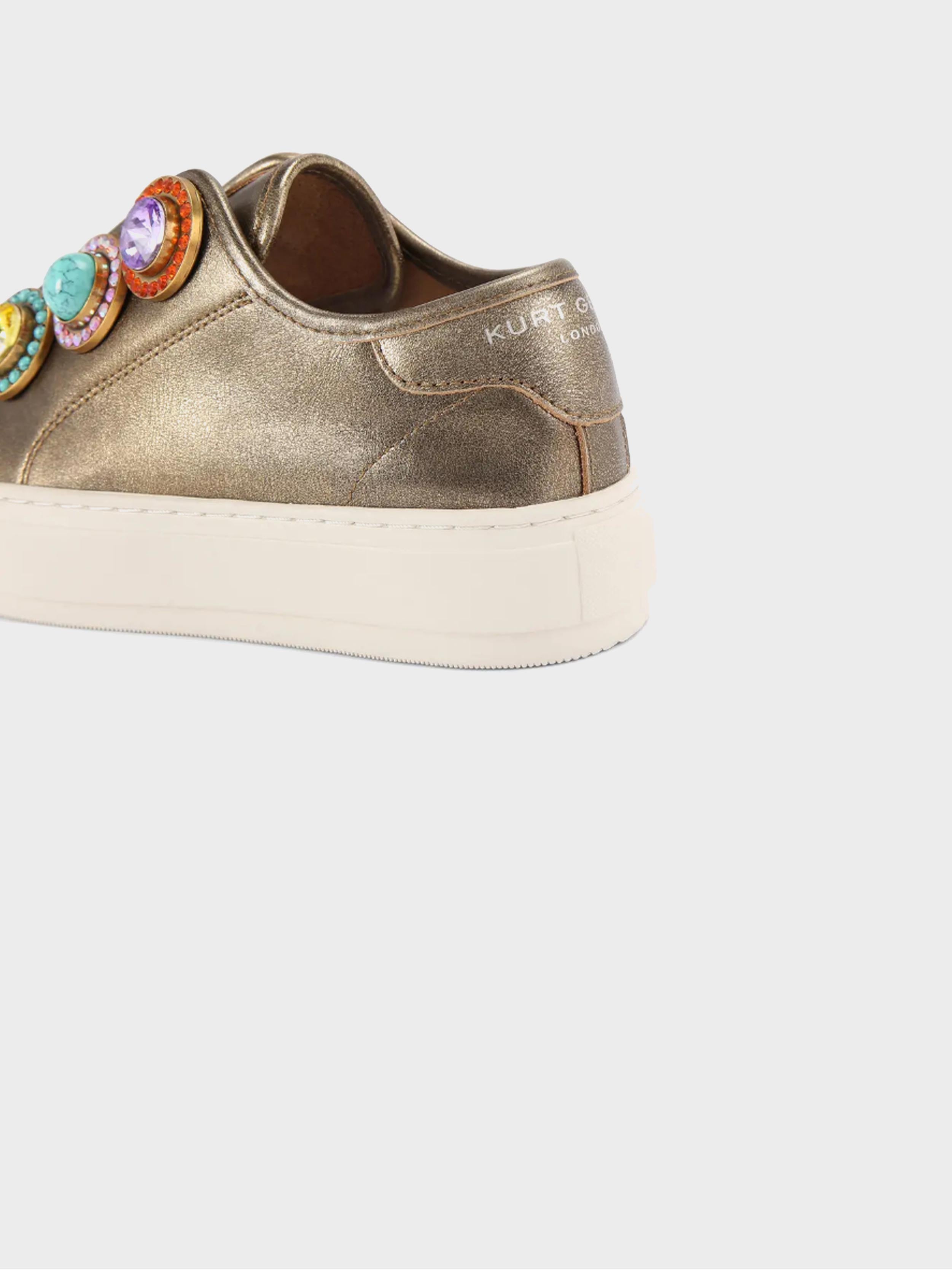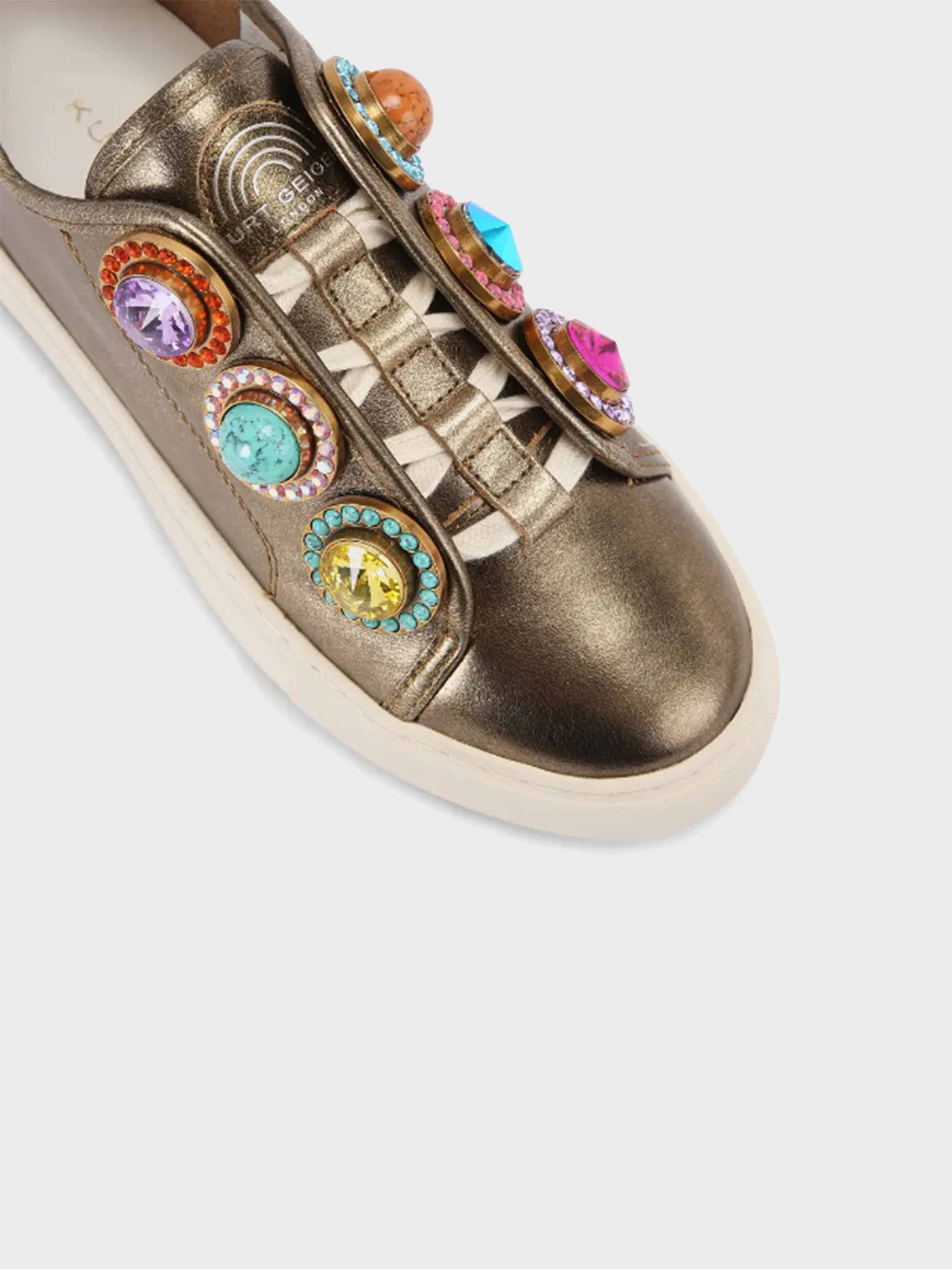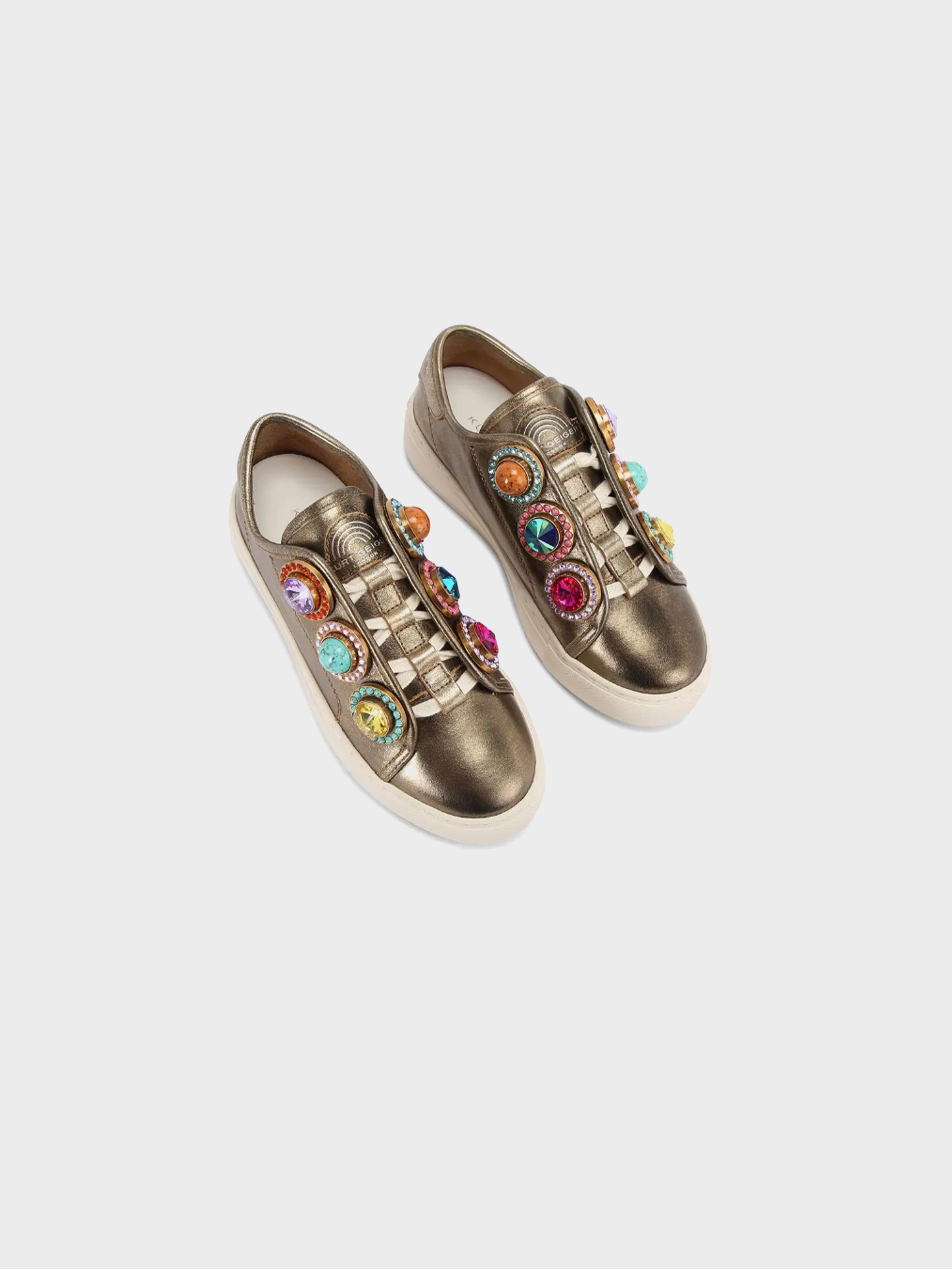 • This Laney Octavia sneaker features a bronze leather upper with large crystals and stones across the eyestay.