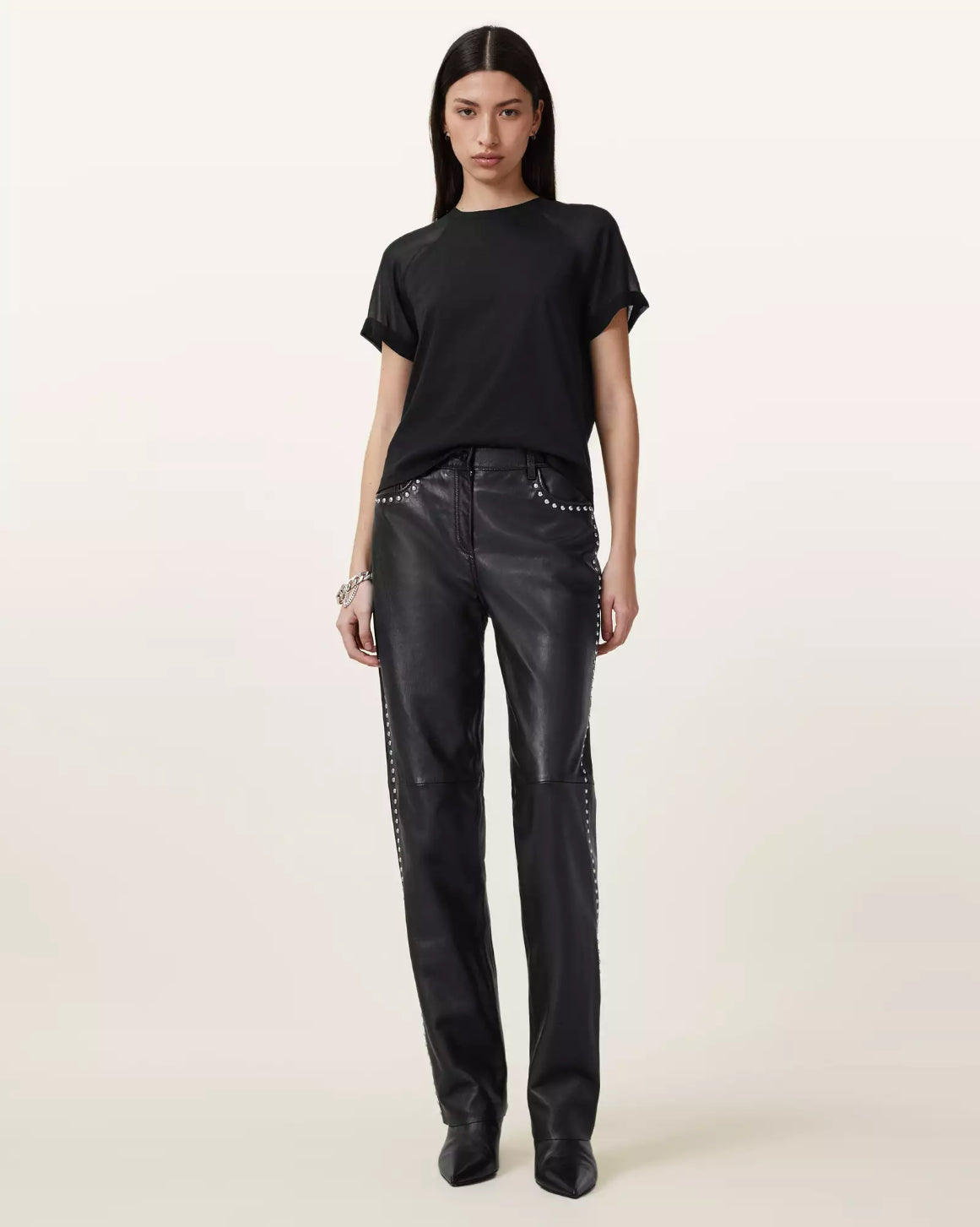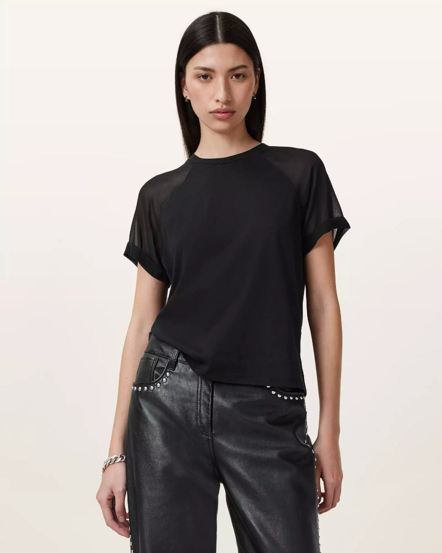 • ANNIE short-sleeved T-shirt is made of cotton fabric, and the sleeves are spliced with slightly translucent artificial fabric.