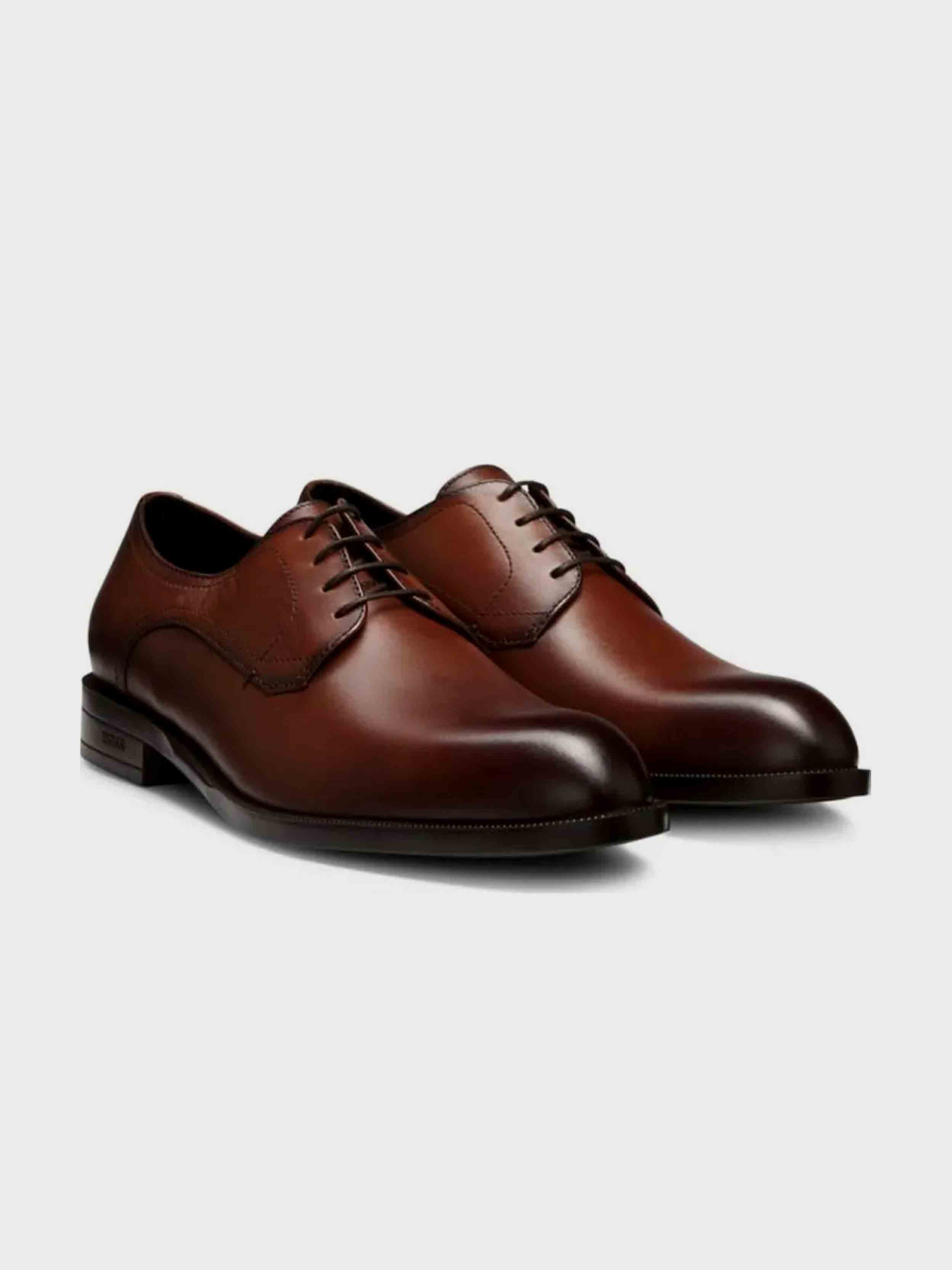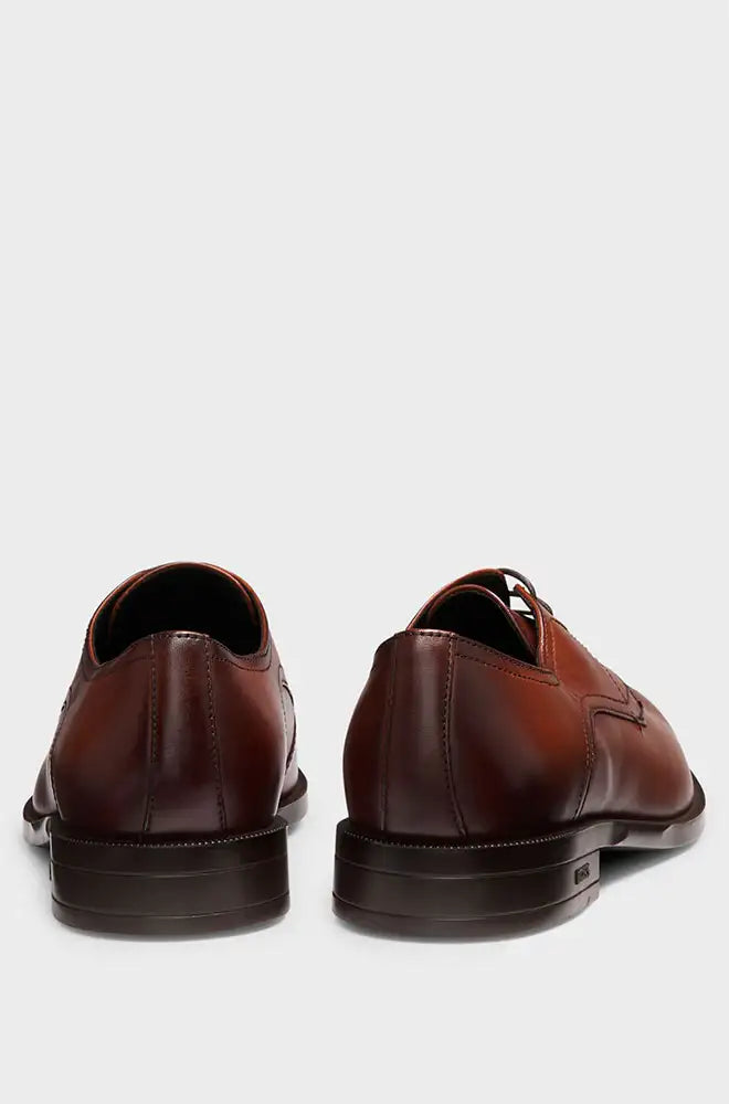 • Featuring smooth leather uppers with intricate stitching, these BOSS Menswear Derby shoes offer a refined formal touch. Durable heel with embossed logo. Branded rubber sole. This product contains at least 60% better raw materials. We continuously look for more responsible ways to produce and finish our products. A minimum of 60% of the leather used to make this product has been sourced from certified tanneries.