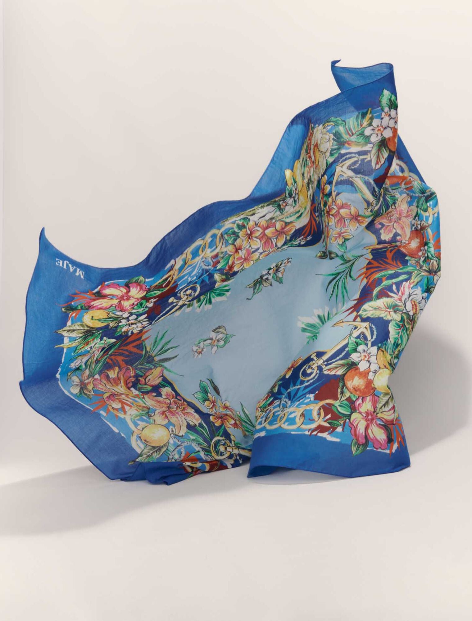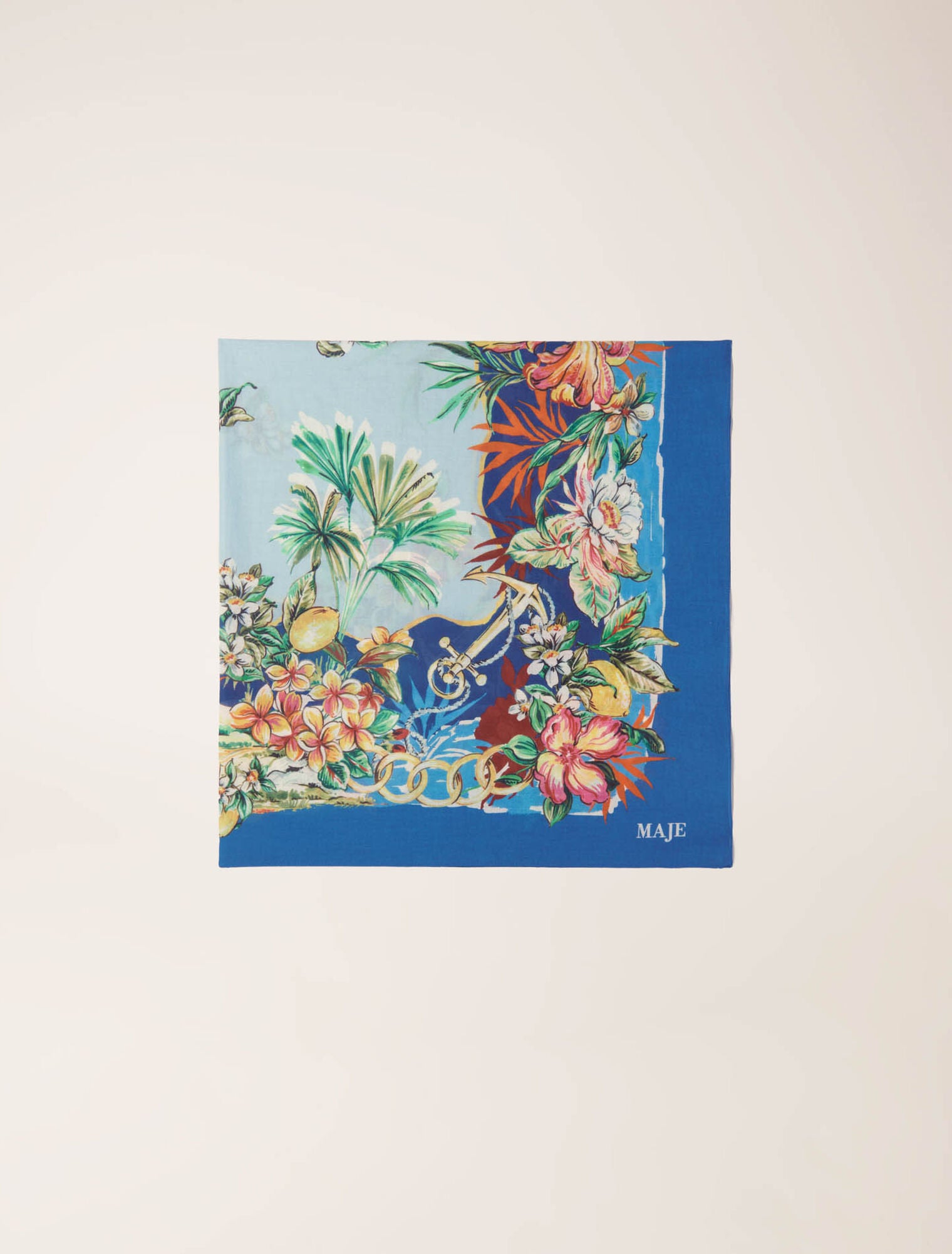 • A real tropical treasure map, this square cotton scarf features a multicoloured floral print. Wear it around your neck or on a bag to add a touch of lightness to your summer silhouettes.
