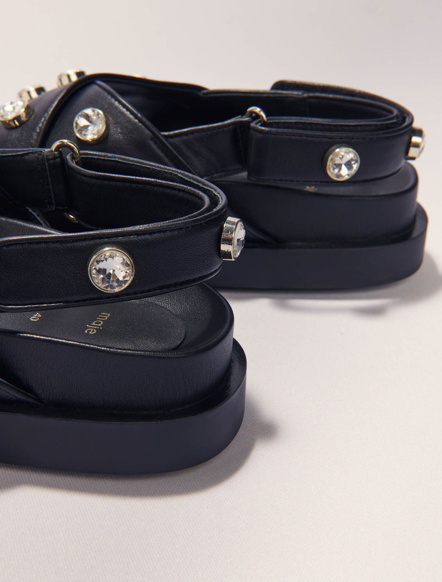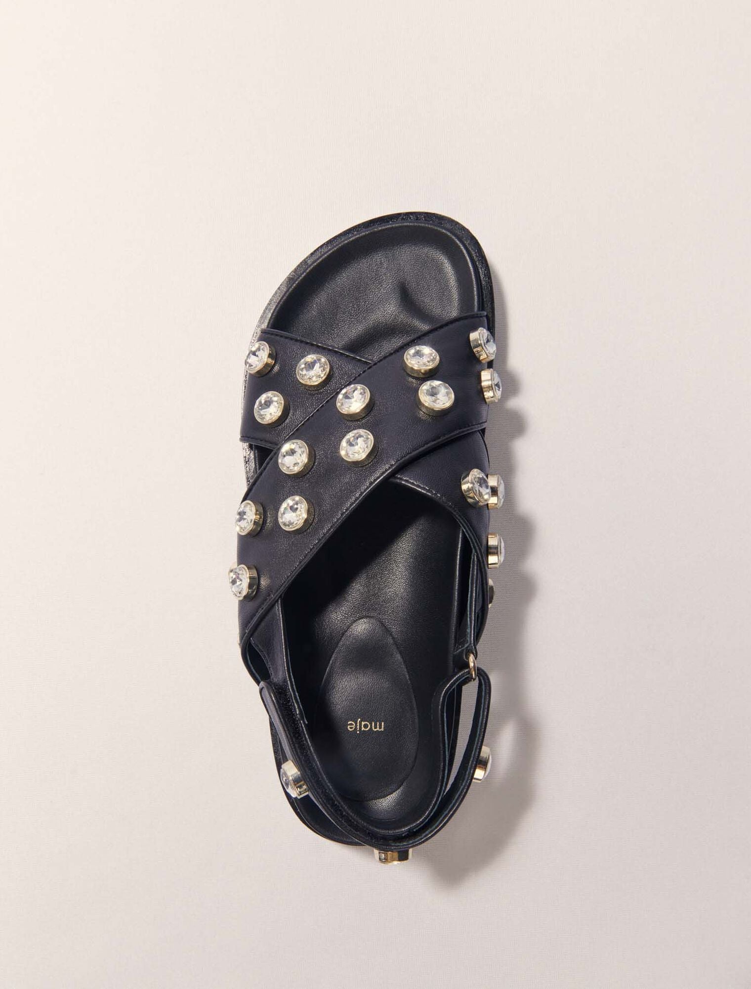 • This season, rhinestones make the Maje collection sparkle. They're all over these flat leather sandals, adding style and character to all your summer looks.