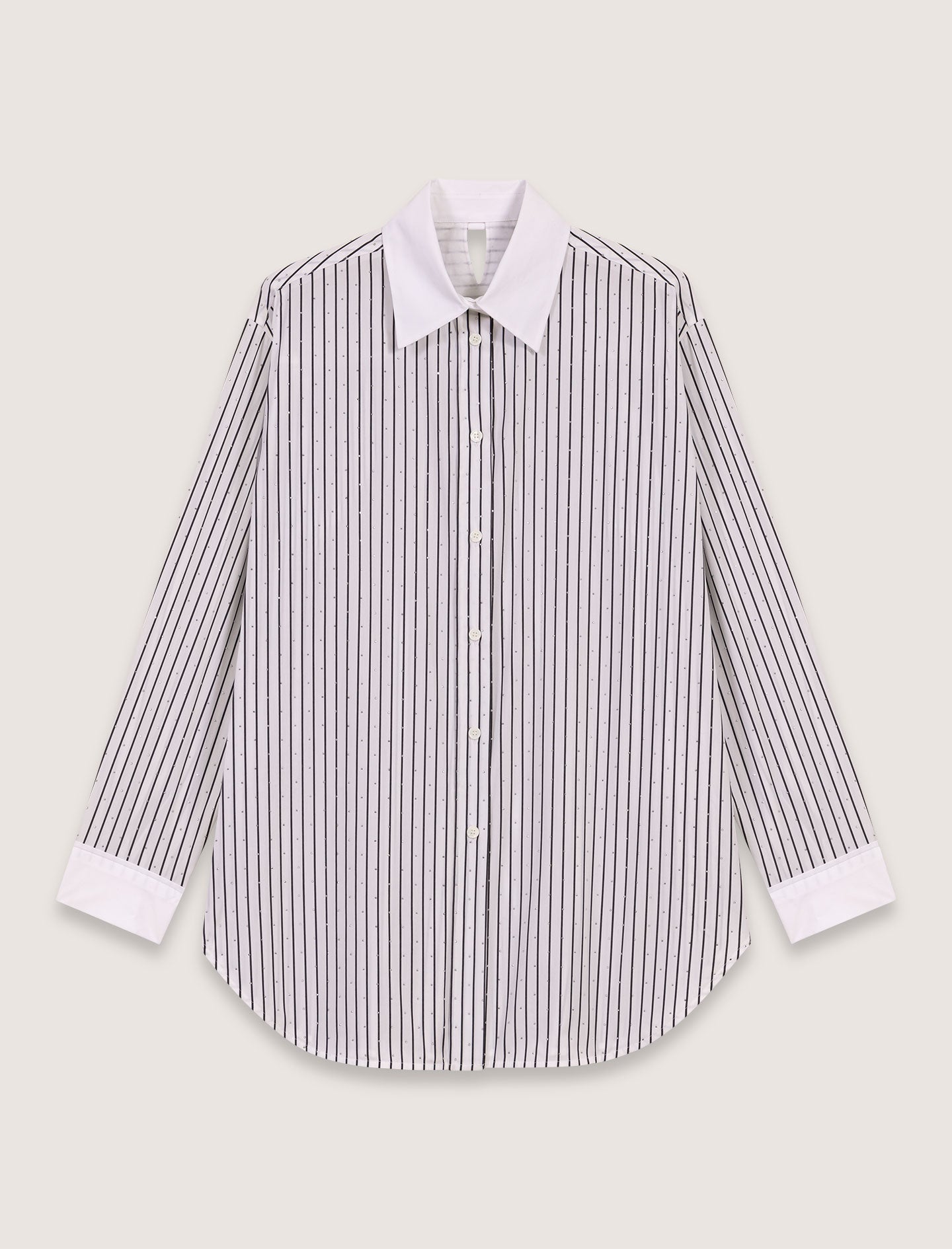 • The classic stripy shirt has been reinvented with all-over rhinestones. A classic collar and plain buttoned cuffs underline the long, oversized cut. There is a small V-shaped cutaway on the back.